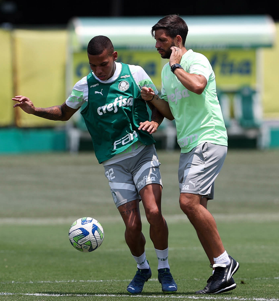 O jogador Garcia e o auxiliar técnico Carlos Martinho (D), da SE Palmeiras, durante treinamento, na Academia de Futebol. (Foto: Cesar Greco/Palmeiras/by Canon)