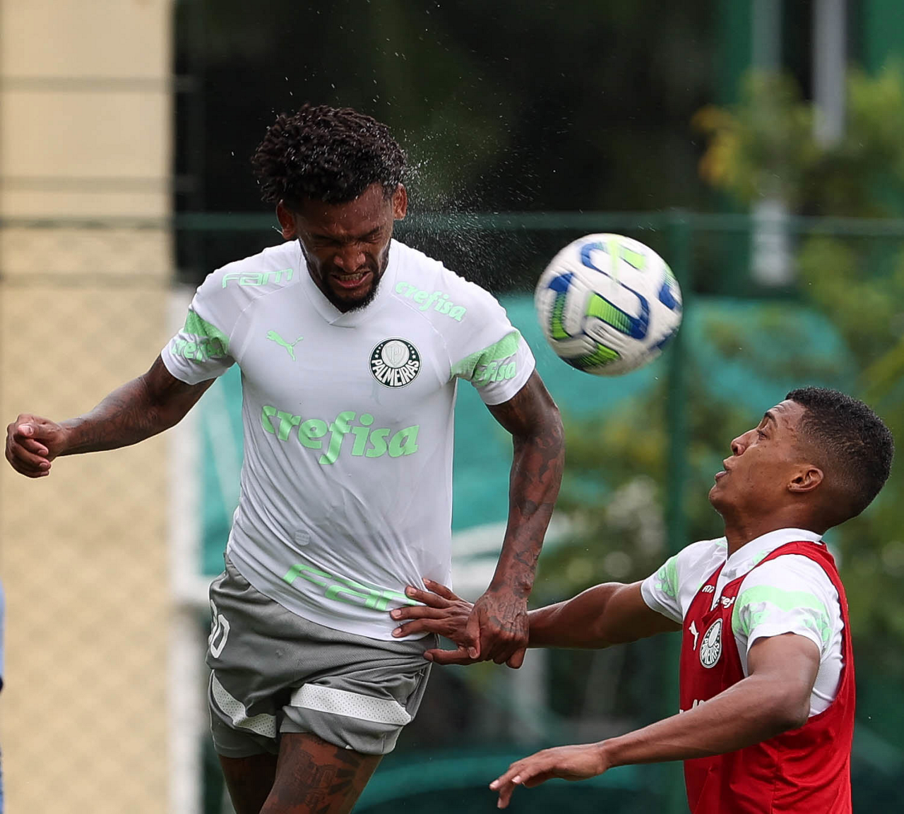Breno Lopes e Eduard Atuesta (D), da SE Palmeiras, durante treinamento, na Academia de Futebol. (Foto: Cesar Greco/Palmeiras/by Canon)