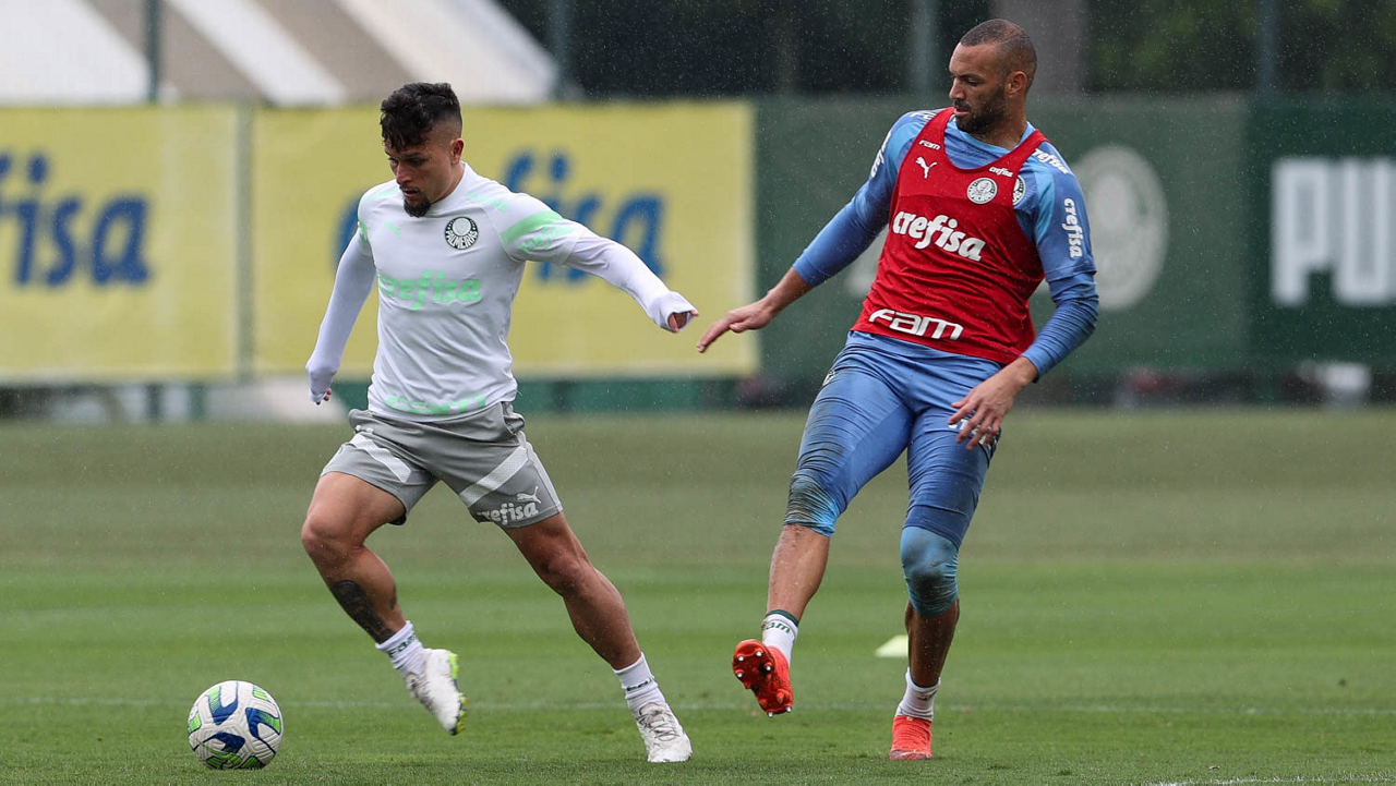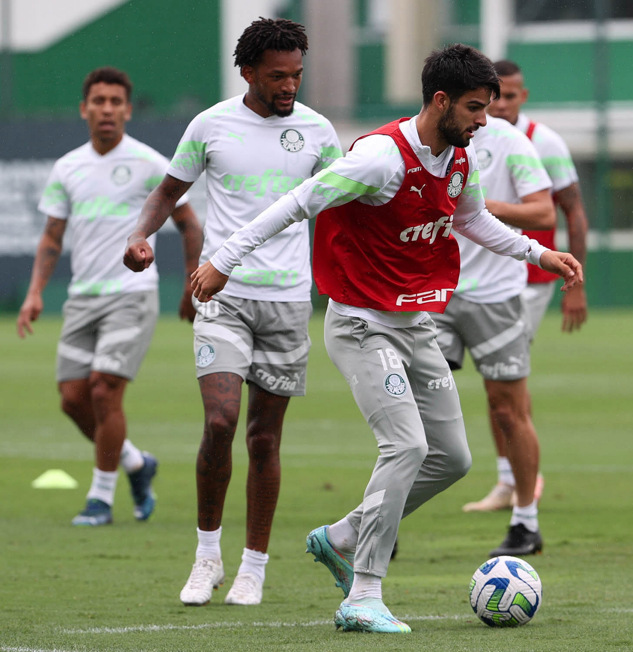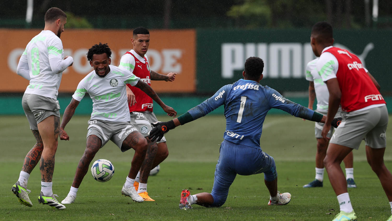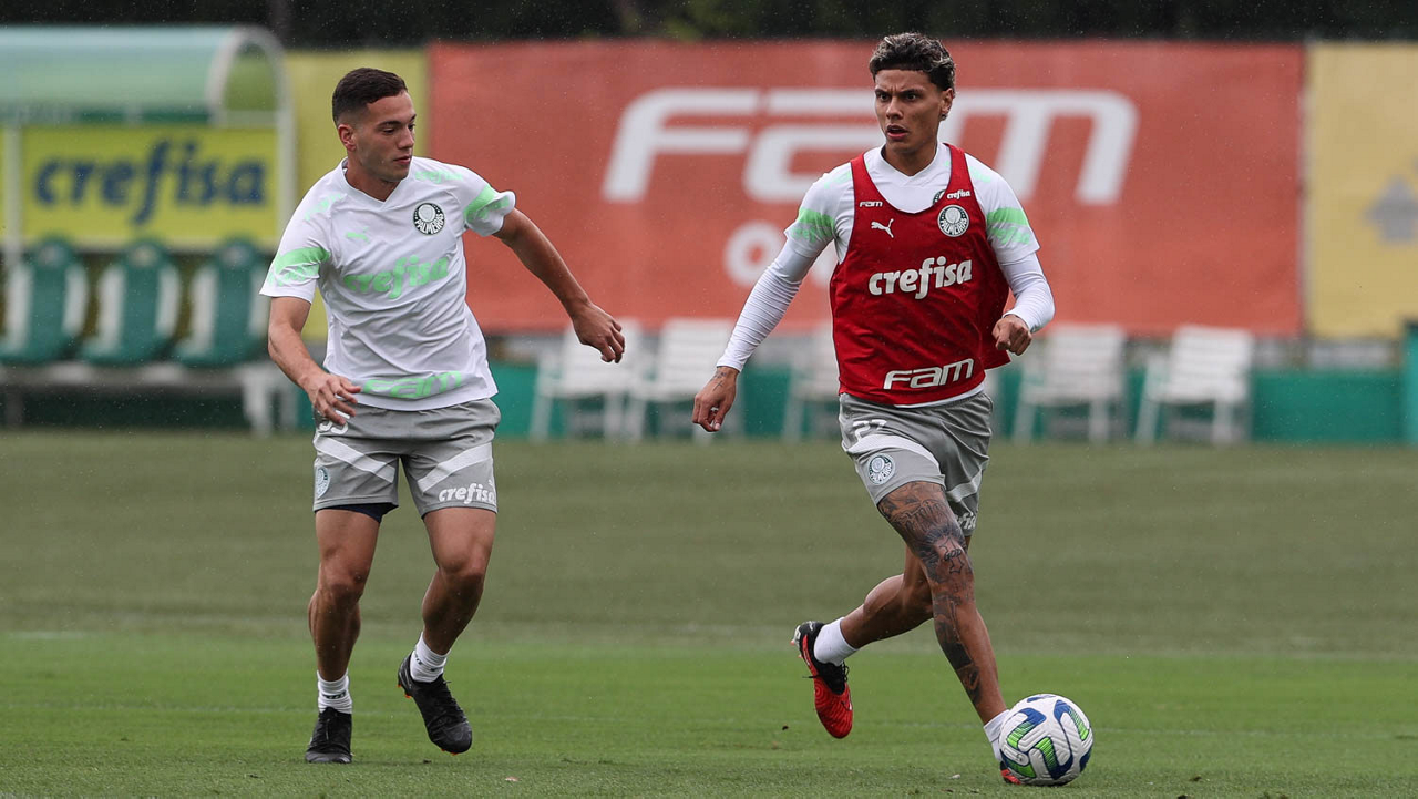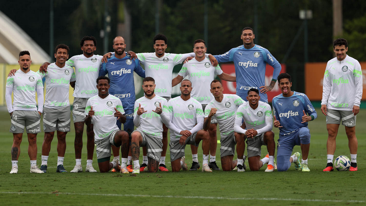 Os jogadores Artur, Marcos Rocha, Jailson, Marcelo Lomba, Murilo, Fabinho, Addi e Raphael Veiga (E/D em pé) e Kevin, Zé Rafael, Mayke, Breno Lopes, Rony e Vinicius (E/D agachados), da SE Palmeiras, durante treinamento, na Academia de Futebol. (Foto: Cesar Greco/Palmeiras/by Canon)