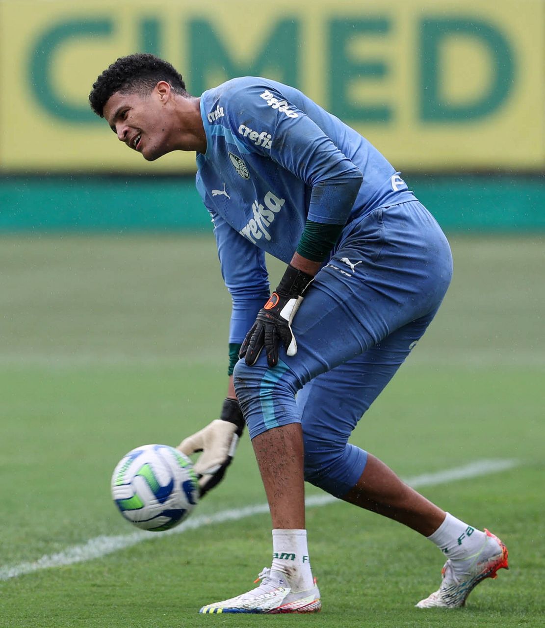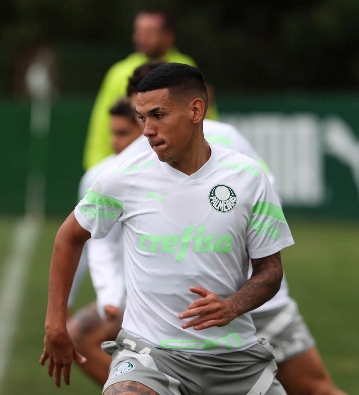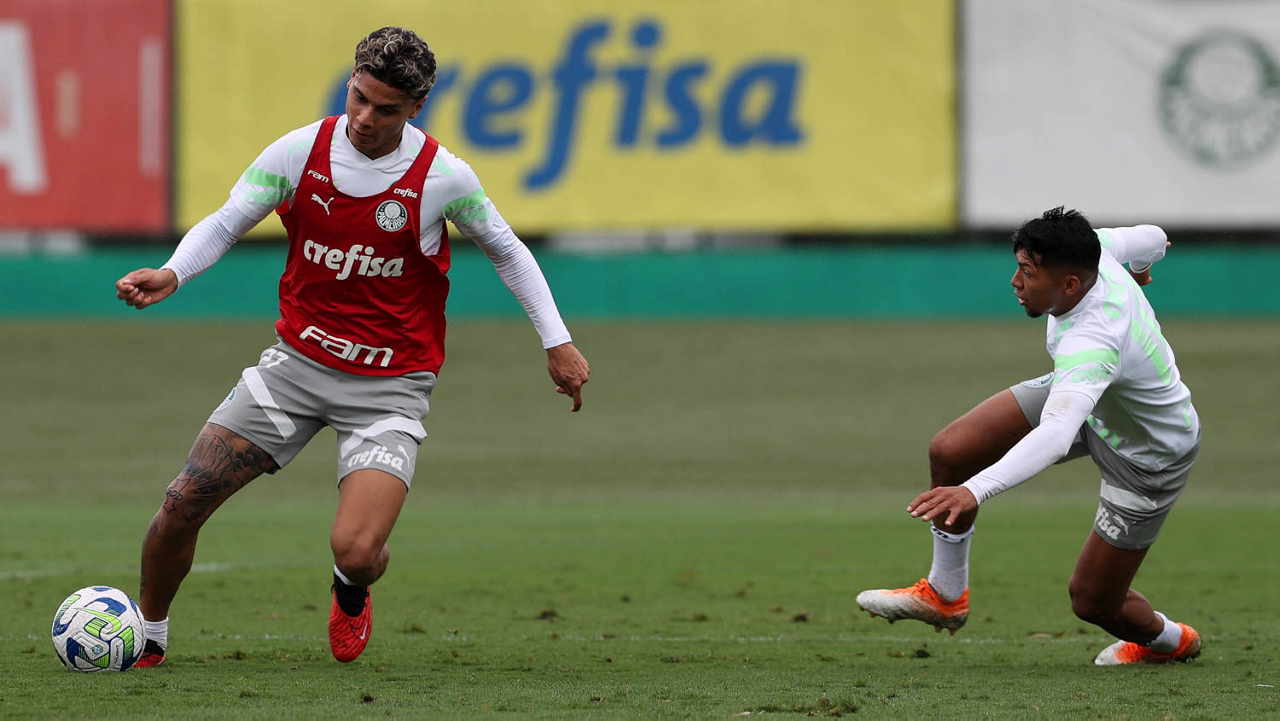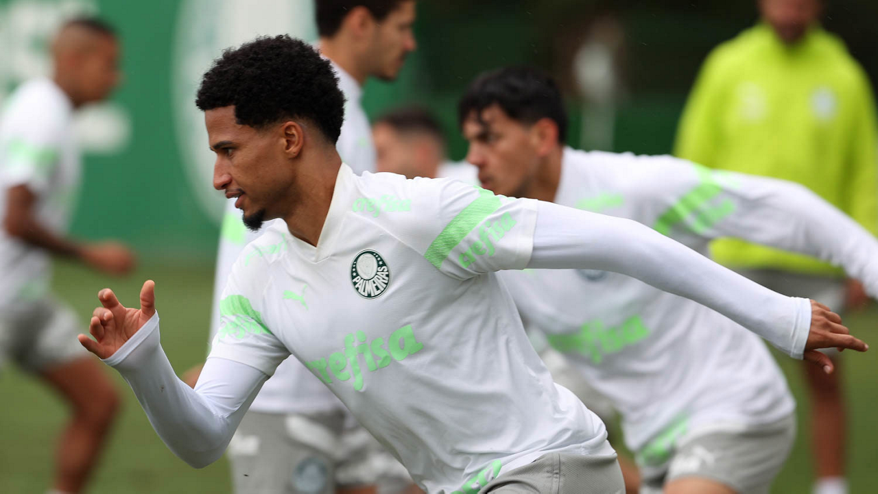 Os jogadores Artur, Marcos Rocha, Jailson, Marcelo Lomba, Murilo, Fabinho, Addi e Raphael Veiga (E/D em pé) e Kevin, Zé Rafael, Mayke, Breno Lopes, Rony e Vinicius (E/D agachados), da SE Palmeiras, durante treinamento, na Academia de Futebol. (Foto: Cesar Greco/Palmeiras/by Canon)