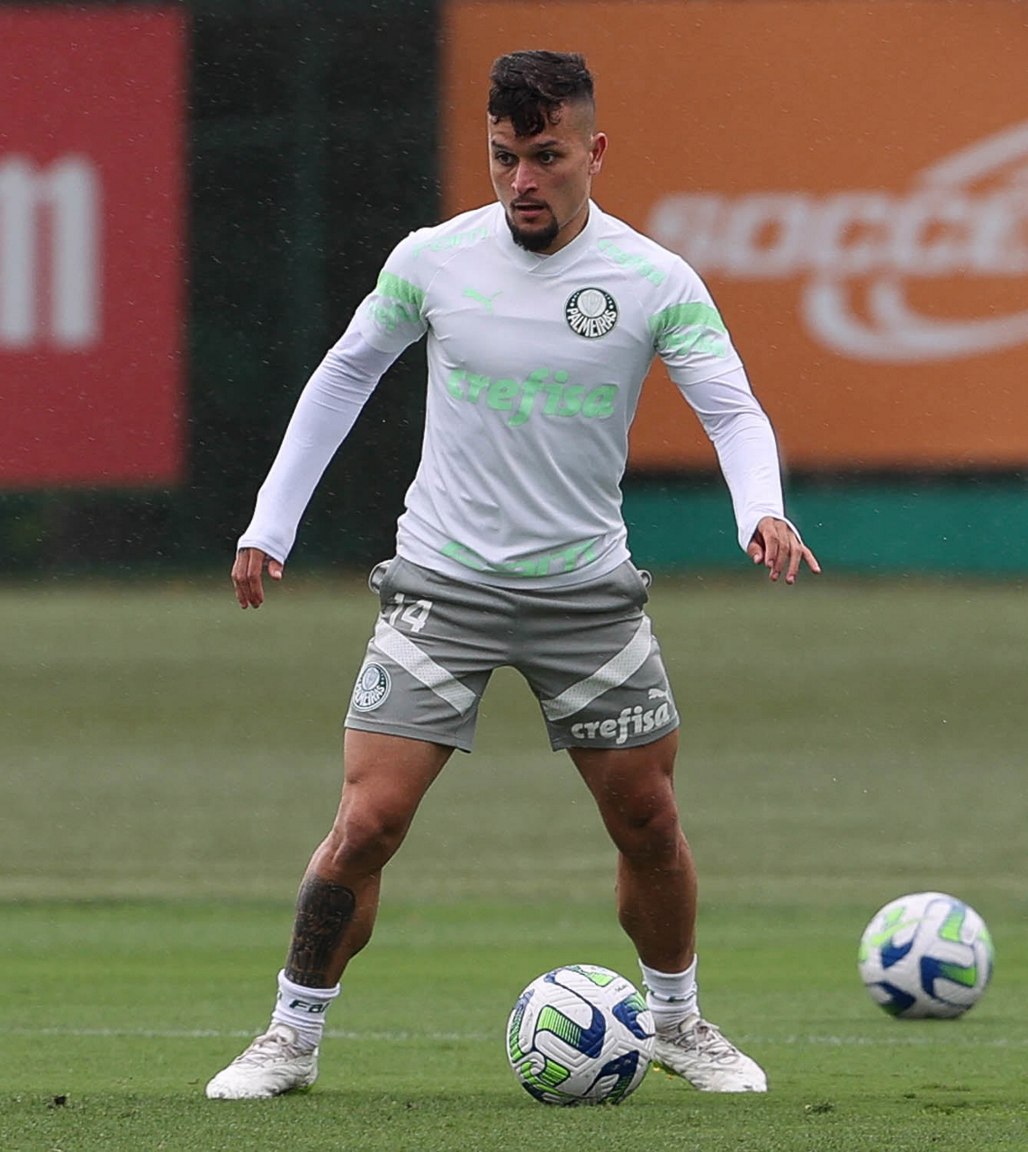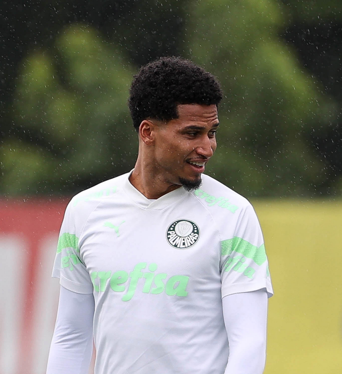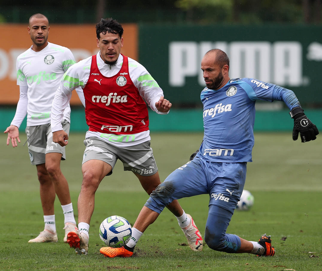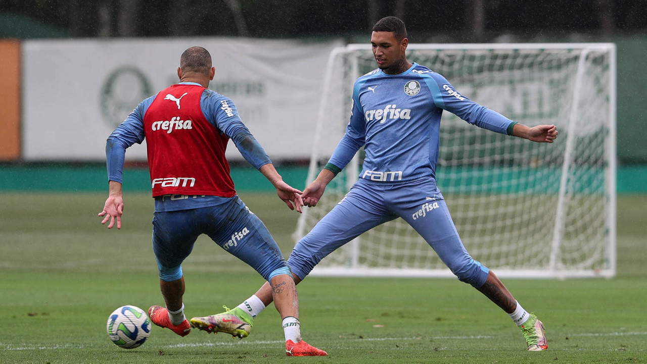 Os jogadores Artur, Marcos Rocha, Jailson, Marcelo Lomba, Murilo, Fabinho, Addi e Raphael Veiga (E/D em pé) e Kevin, Zé Rafael, Mayke, Breno Lopes, Rony e Vinicius (E/D agachados), da SE Palmeiras, durante treinamento, na Academia de Futebol. (Foto: Cesar Greco/Palmeiras/by Canon)