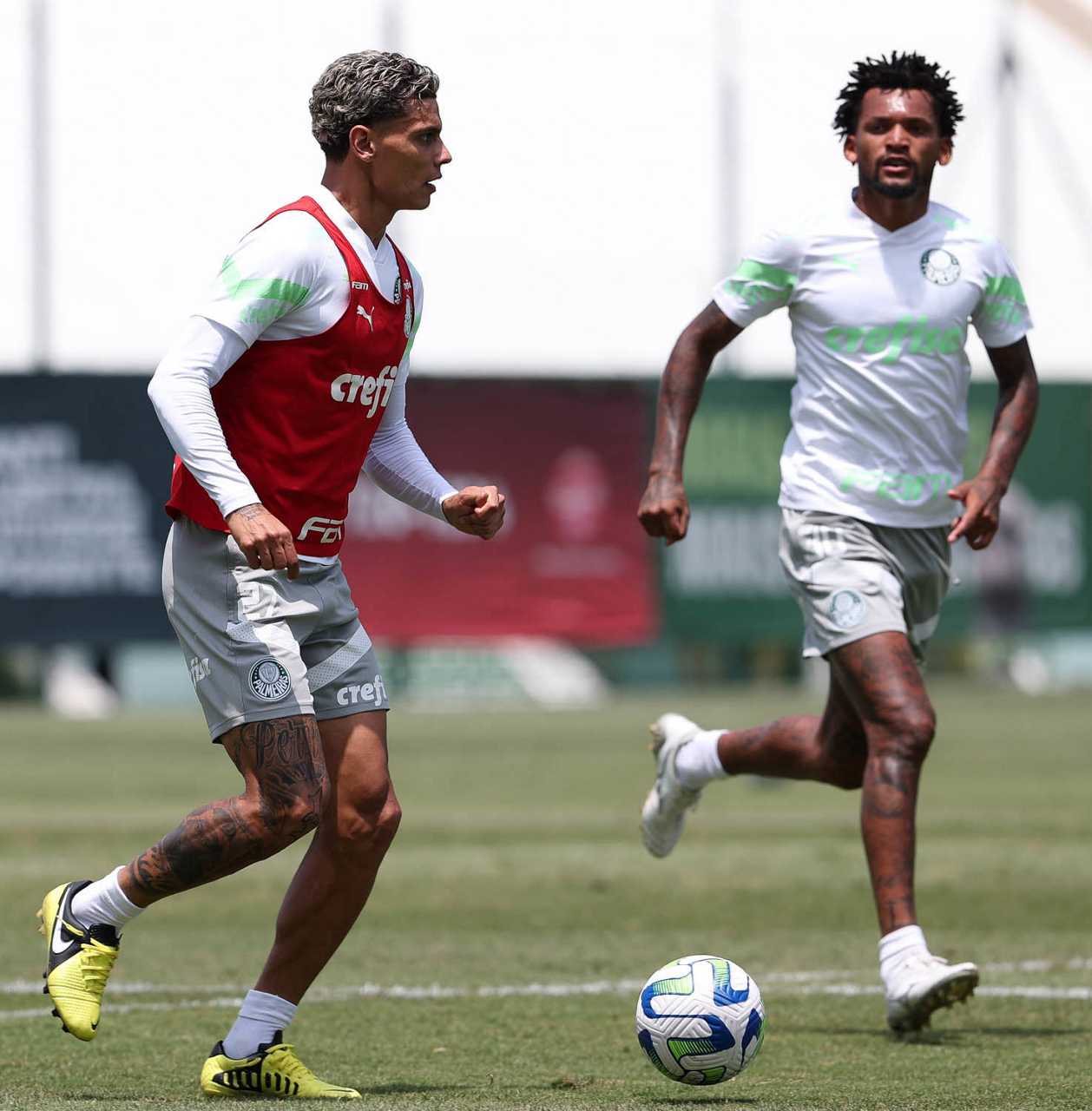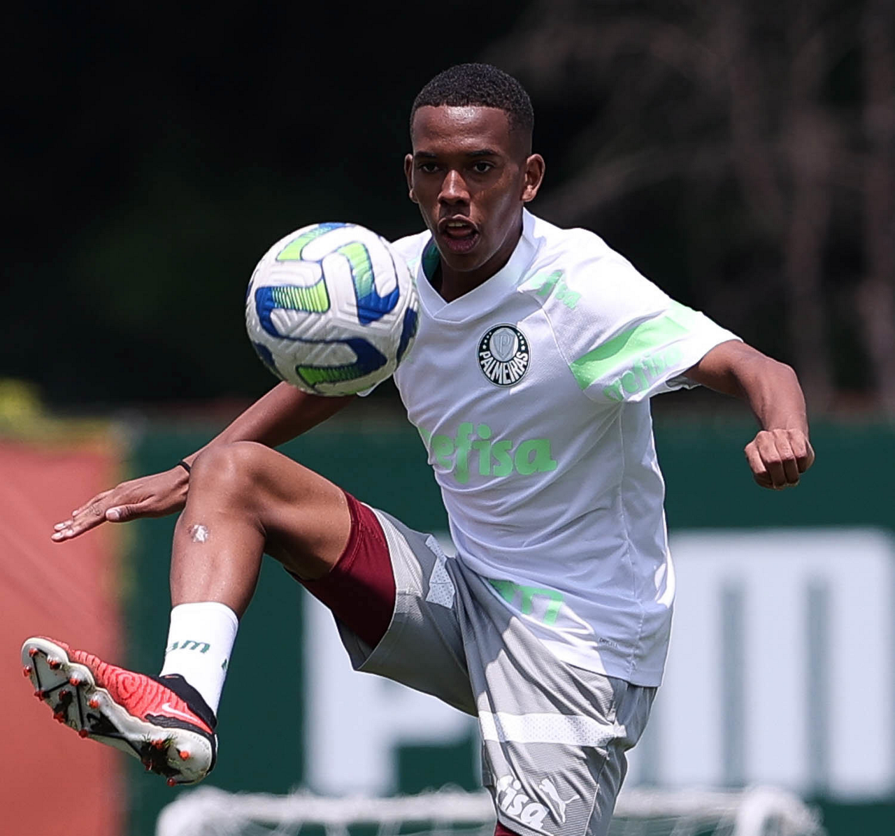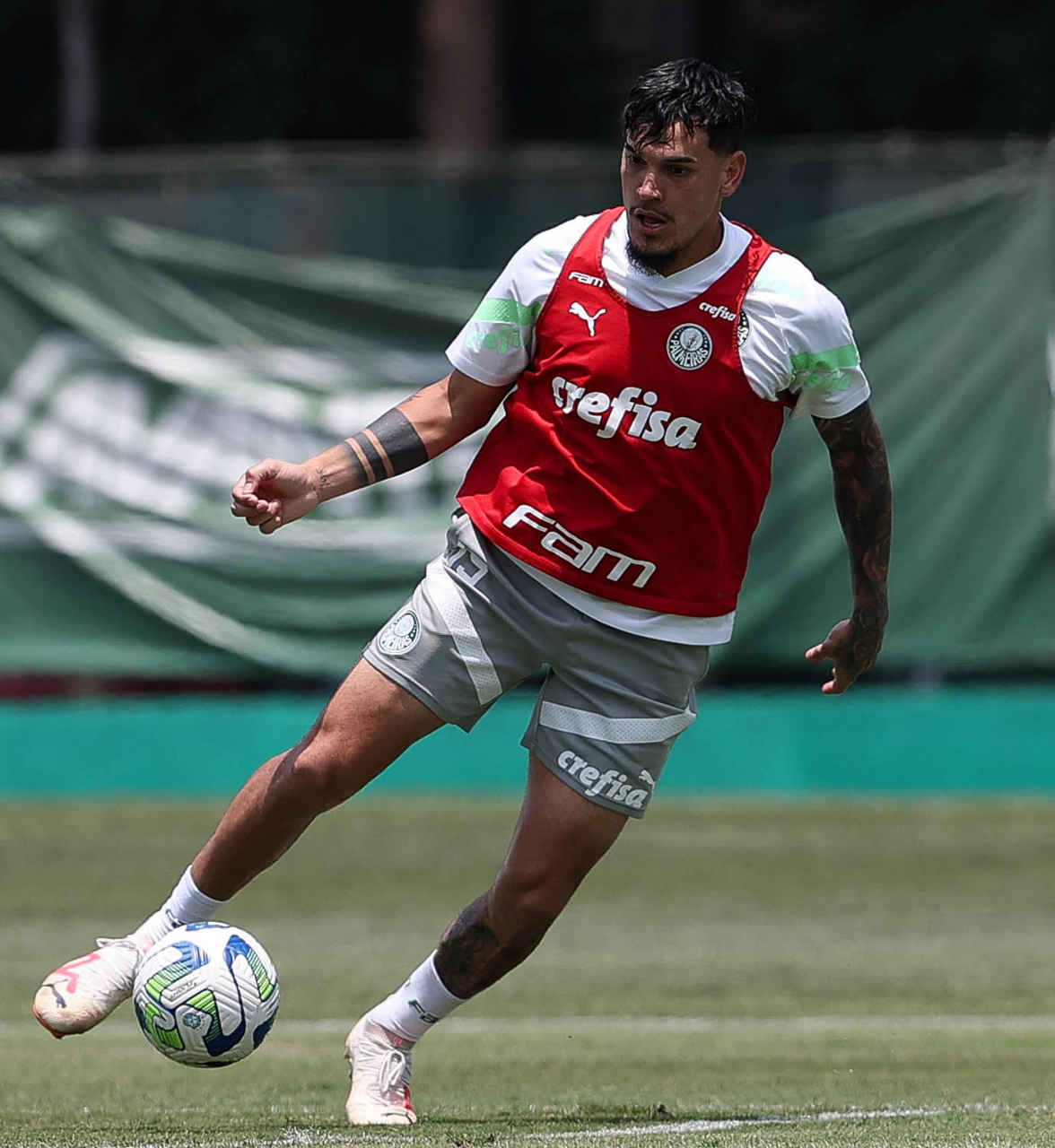 Os jogadores Endrick, Fabinho, Naves, Garcia, Mateus, Flaco López, Eduard Atuesta e Gustavo Gómez (E/D em pé) e Weverton, Luis Guilherme, Jhonatan, Vanderlan e Richard Ríos (E/D agachados), da SE Palmeiras, durante treinamento, na Academia de Futebol. (Foto: Cesar Greco/Palmeiras/by Canon)