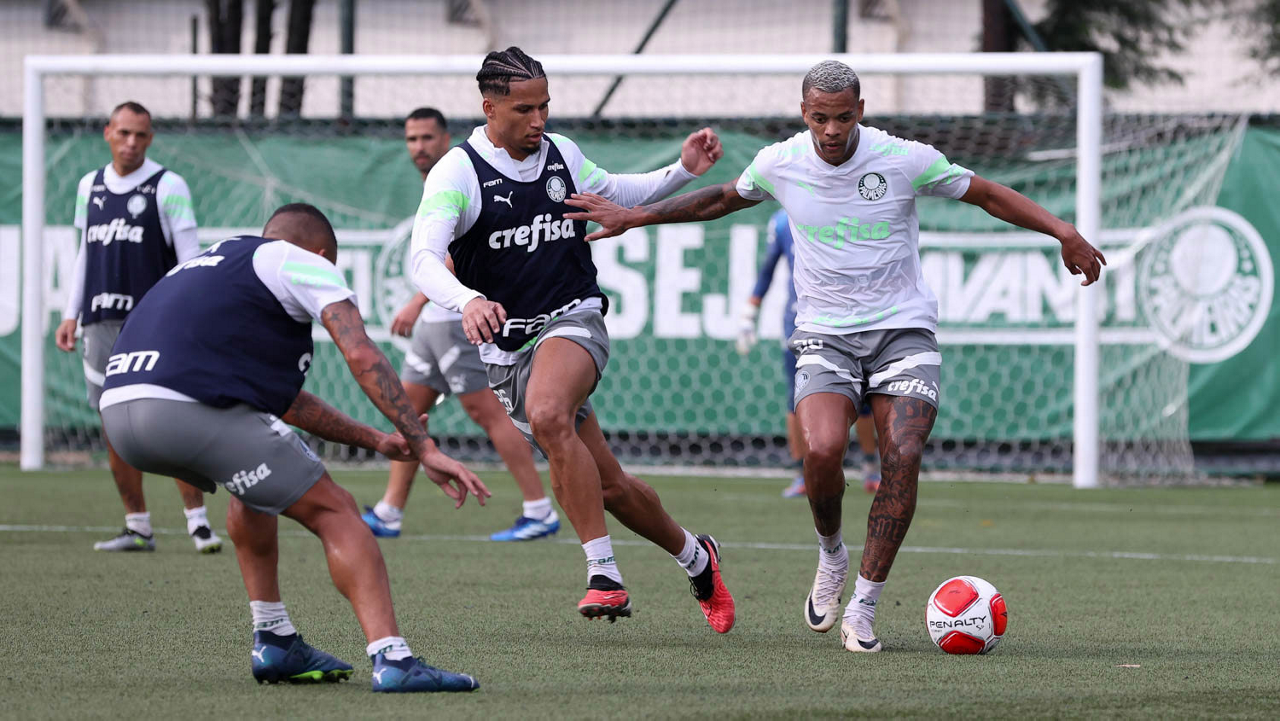 Os jogadores Luis Guilherme e Eduard Atuesta (D), da SE Palmeiras, durante treinamento, na Academia de Futebol. (Foto: Cesar Greco/Palmeiras/by Canon)