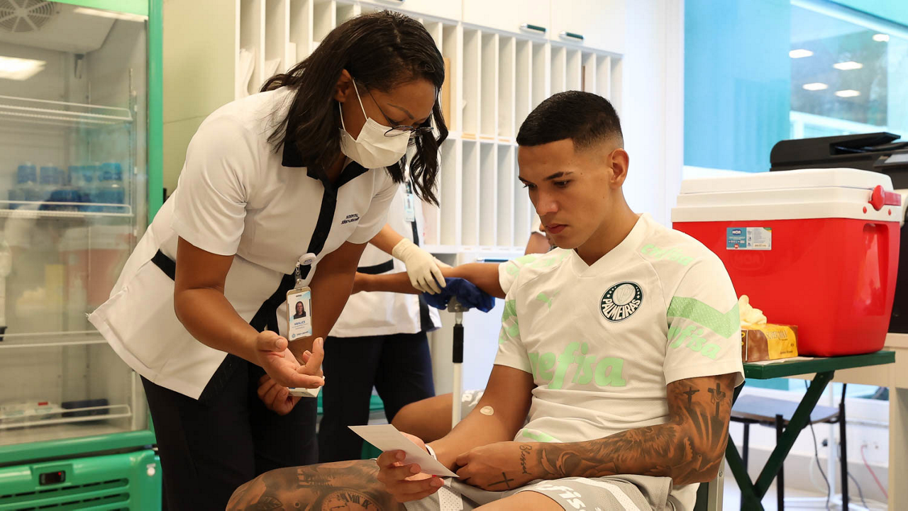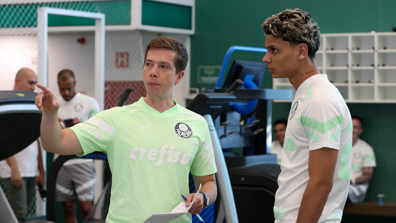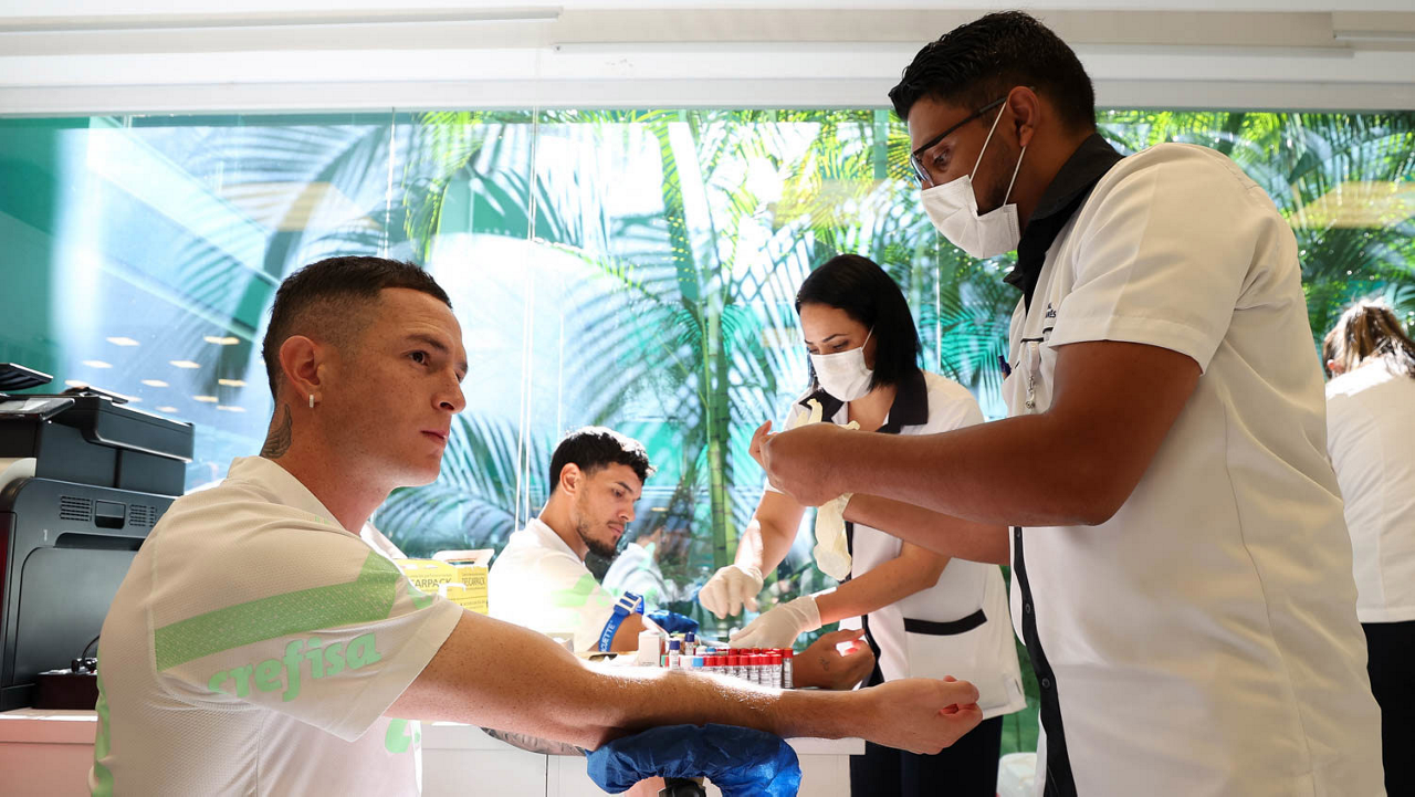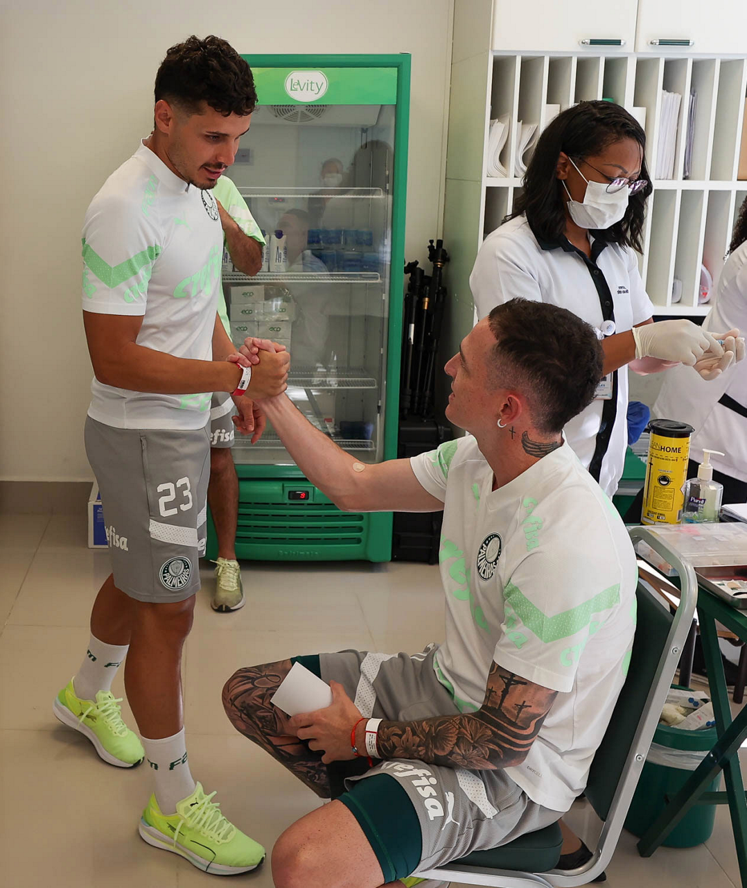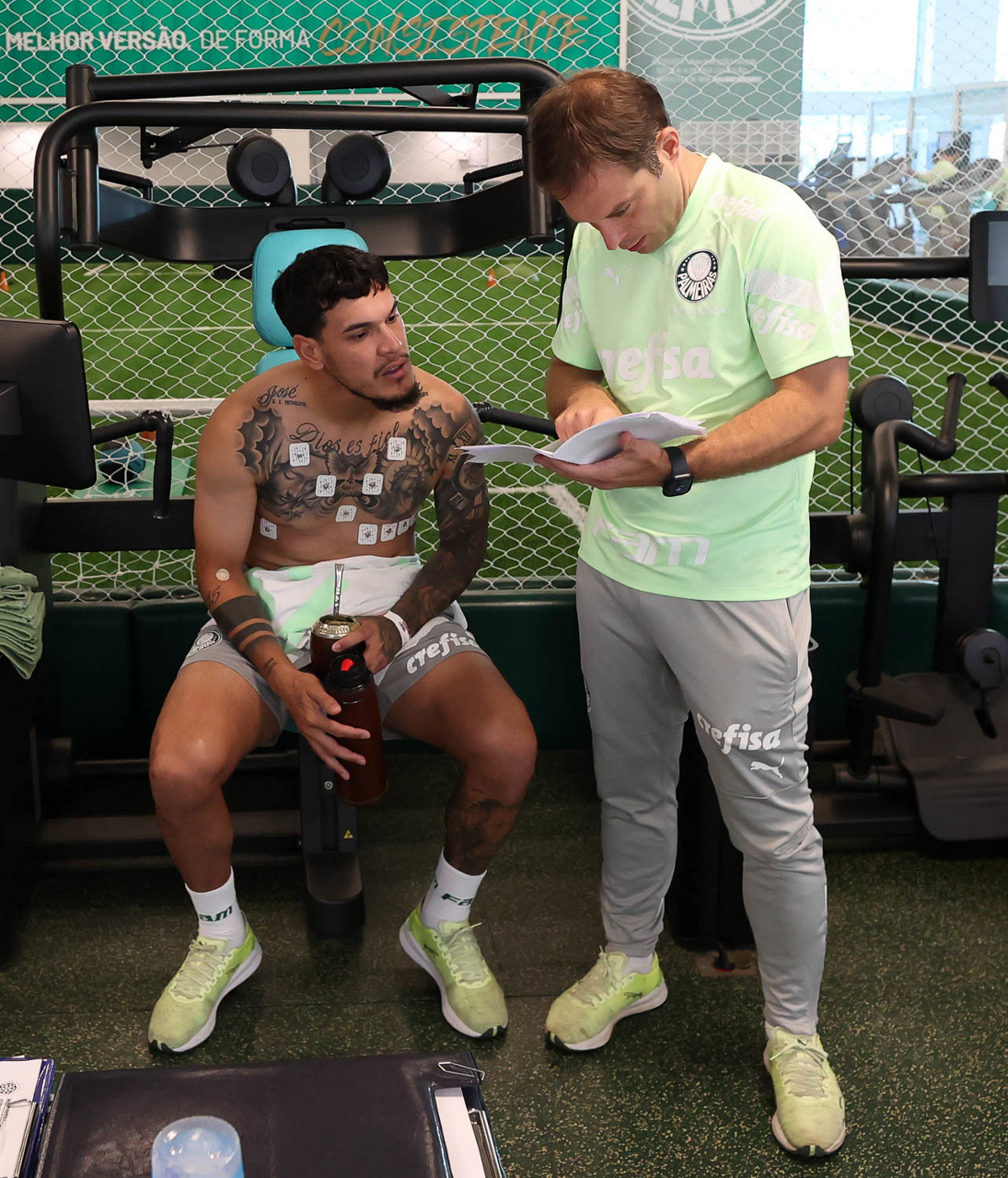 O médico Victor Soraggi e o jogador Richard Ríos (D), da SE Palmeiras, durante reapresentação, na Academia de Futebol. (Foto: Cesar Greco/Palmeiras/by Canon)
