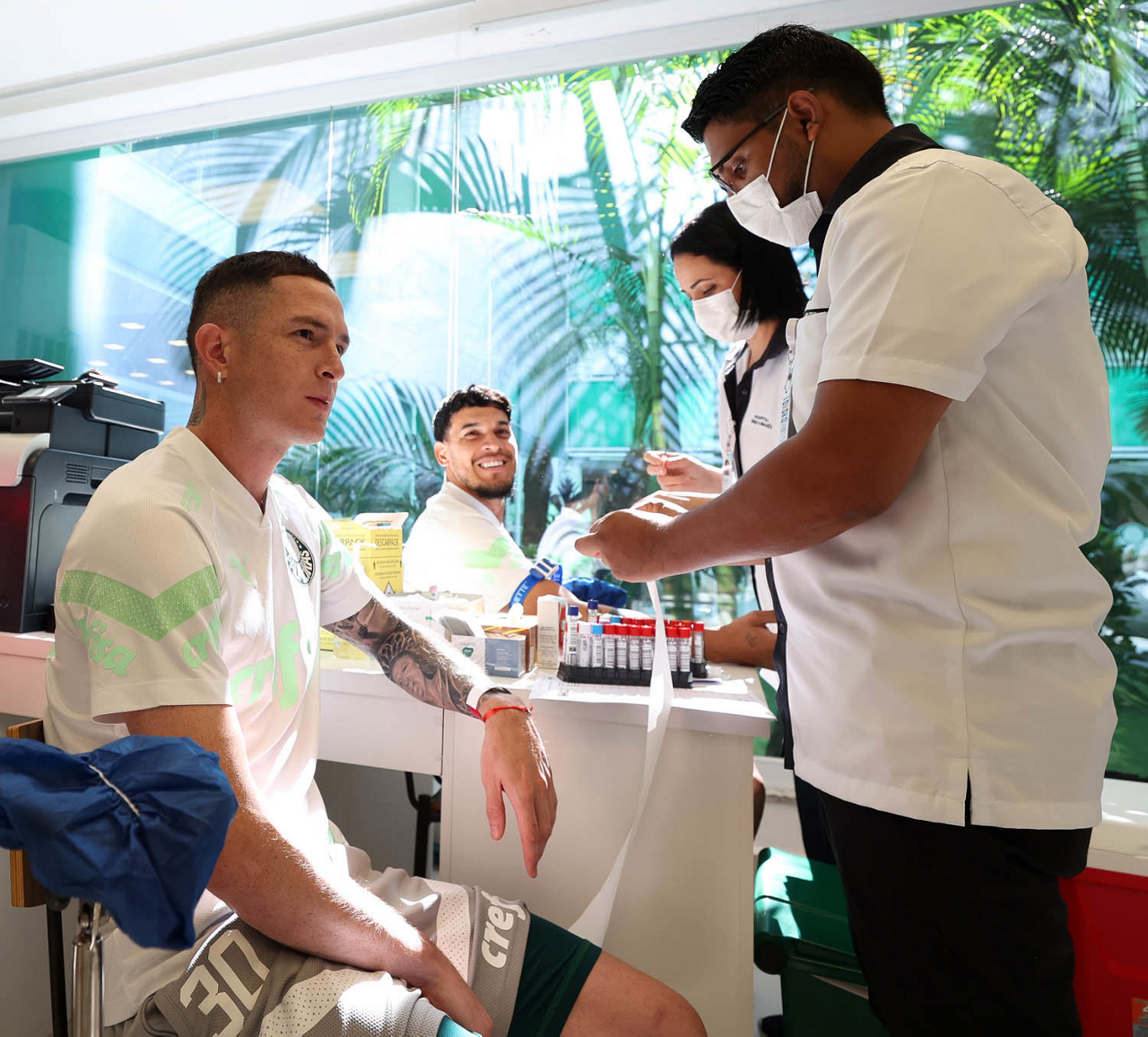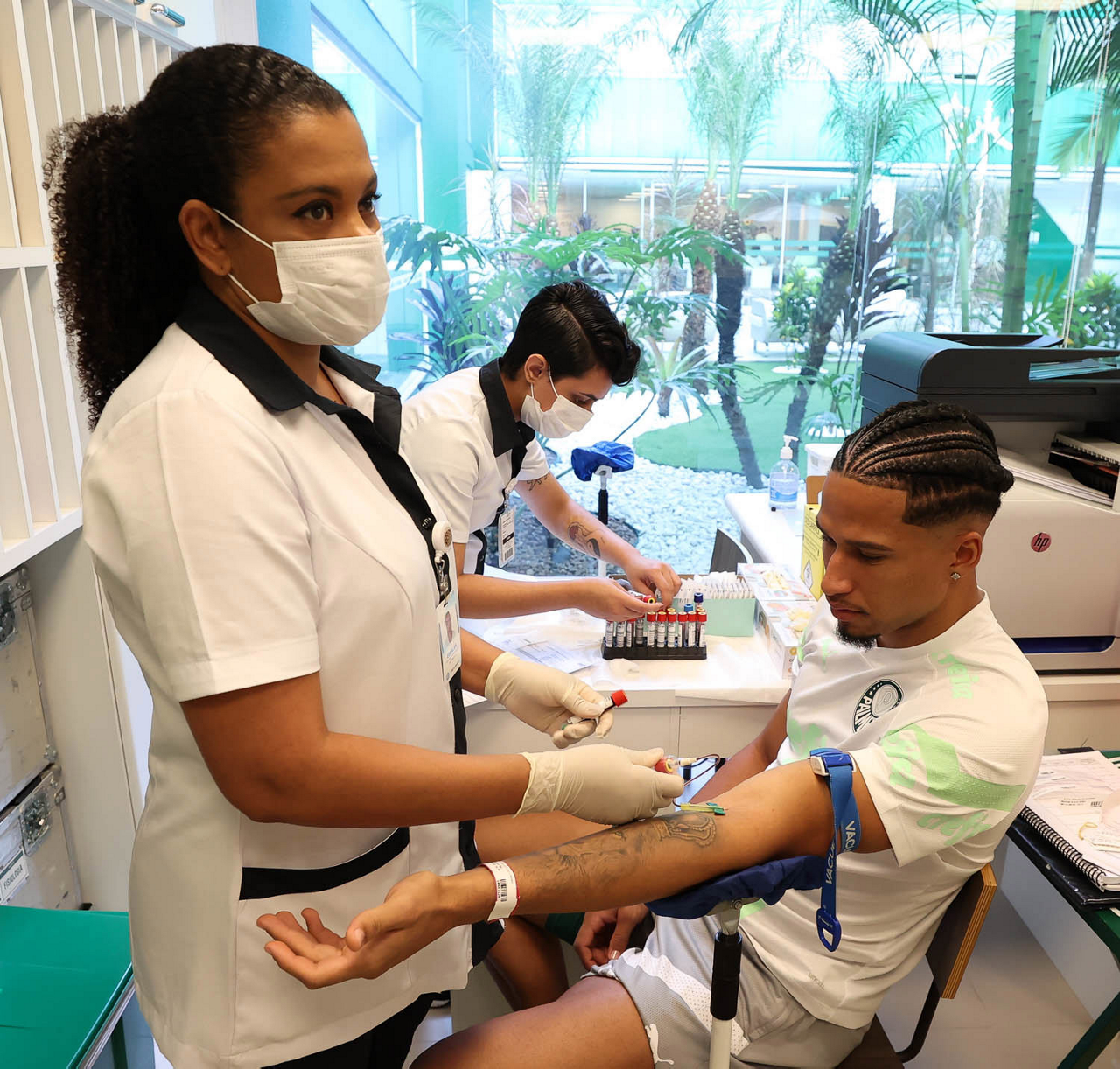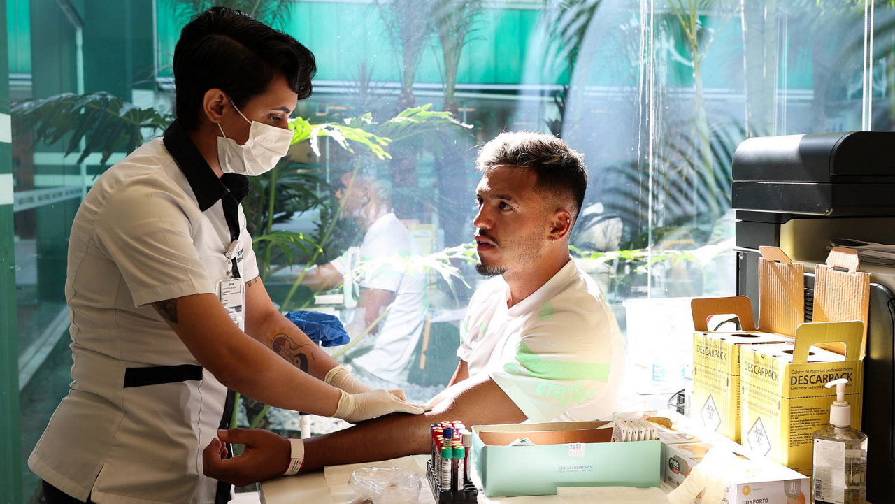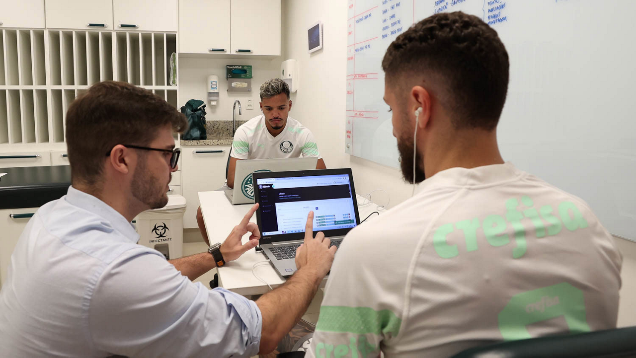 O médico Victor Soraggi e o jogador Richard Ríos (D), da SE Palmeiras, durante reapresentação, na Academia de Futebol. (Foto: Cesar Greco/Palmeiras/by Canon)