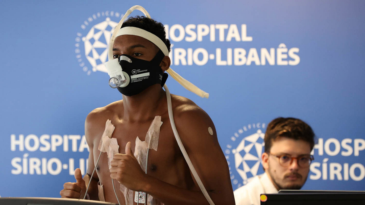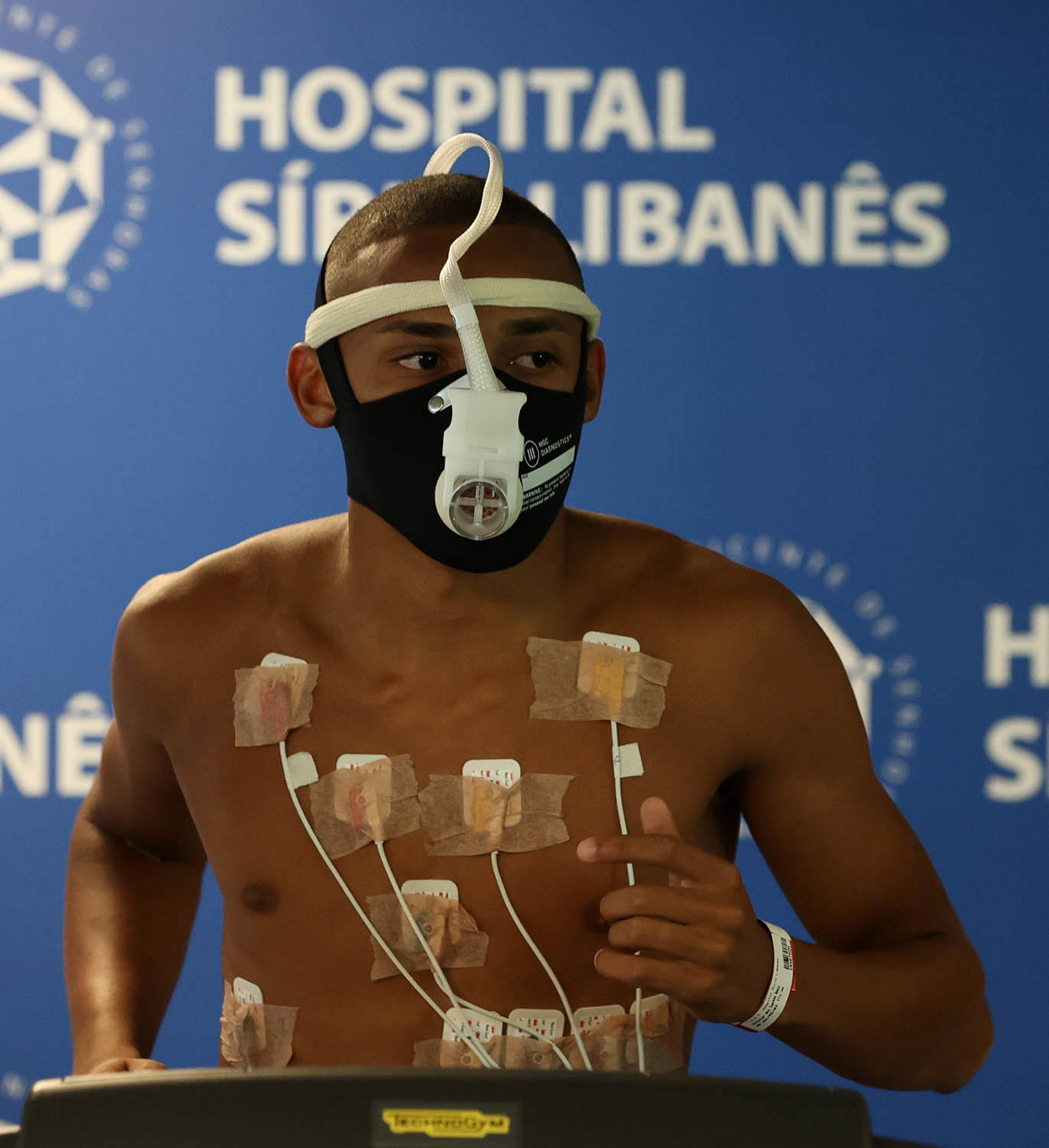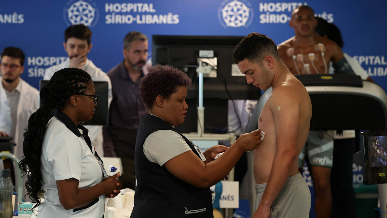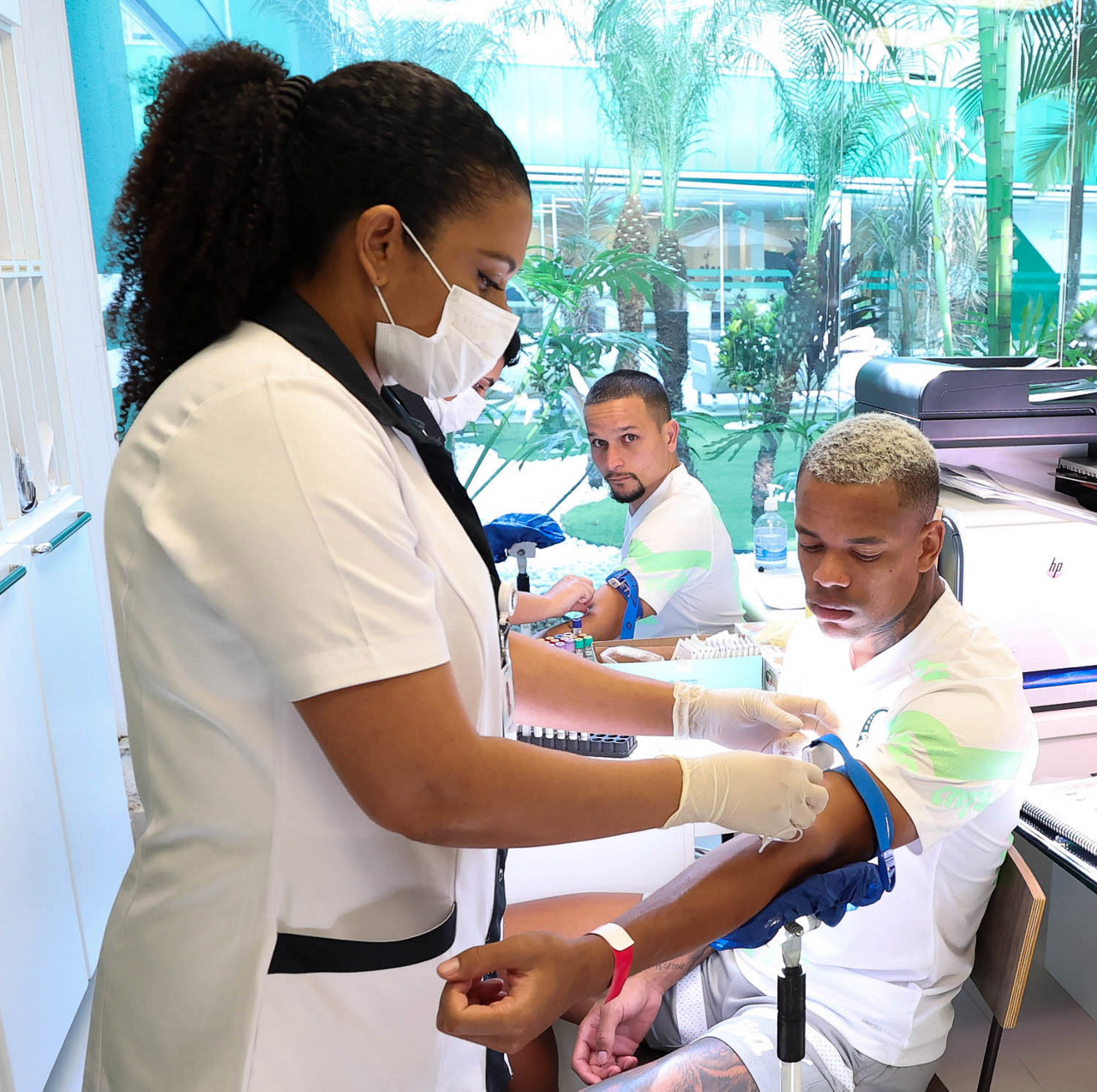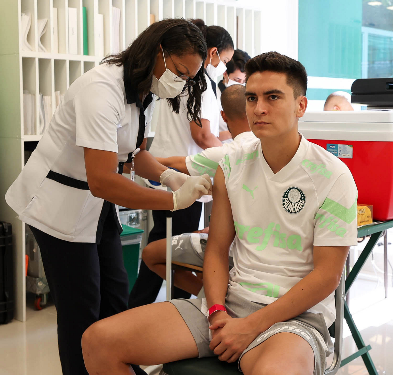 O médico Victor Soraggi e o jogador Richard Ríos (D), da SE Palmeiras, durante reapresentação, na Academia de Futebol. (Foto: Cesar Greco/Palmeiras/by Canon)