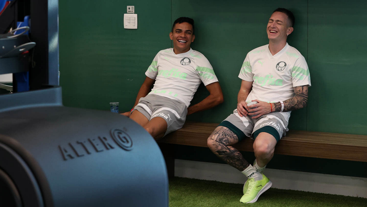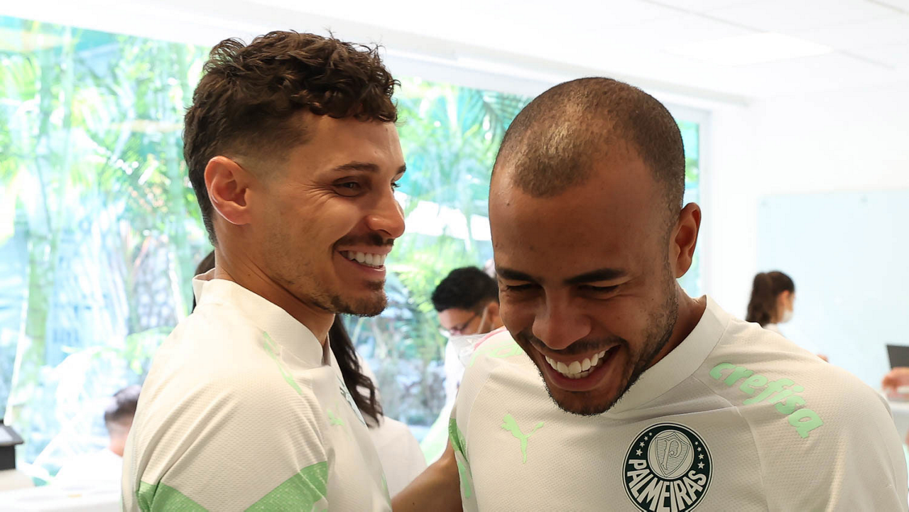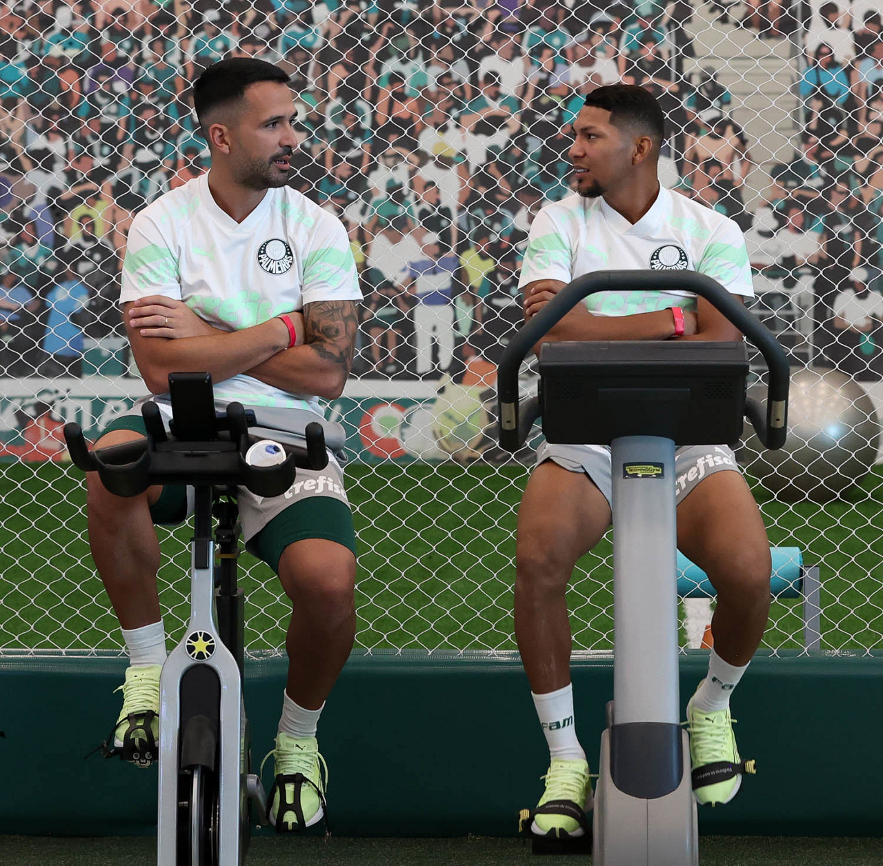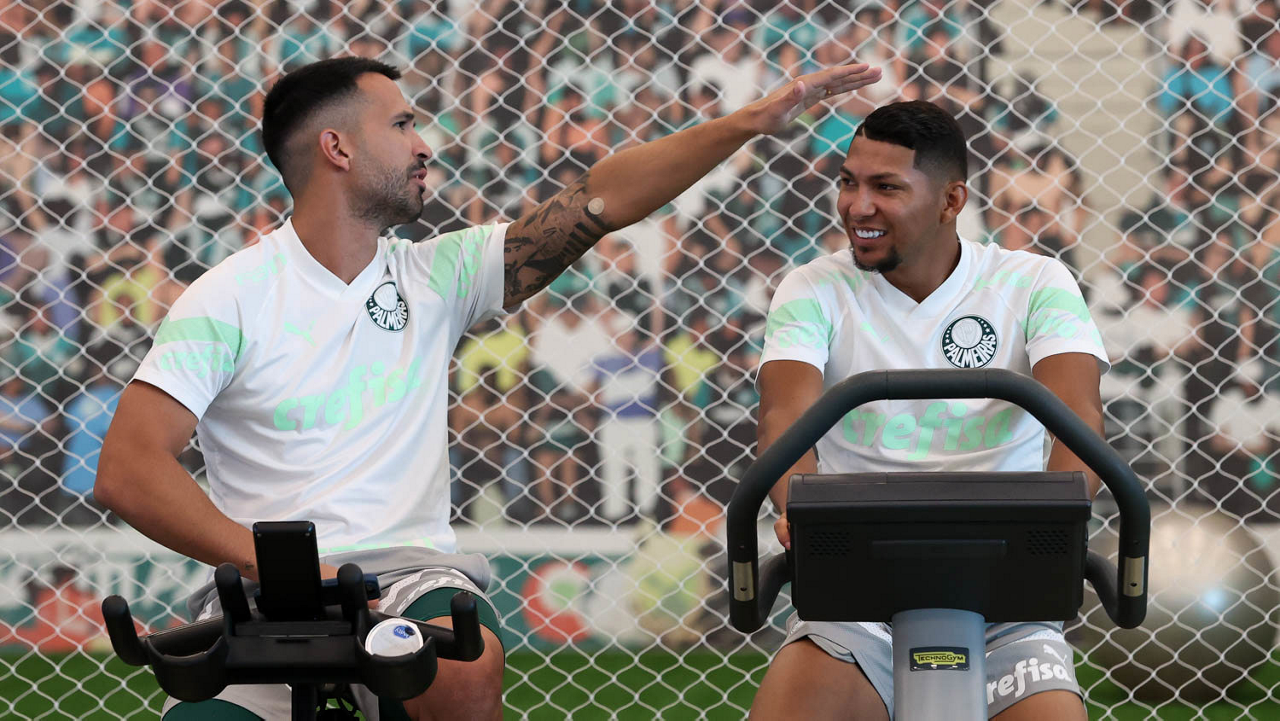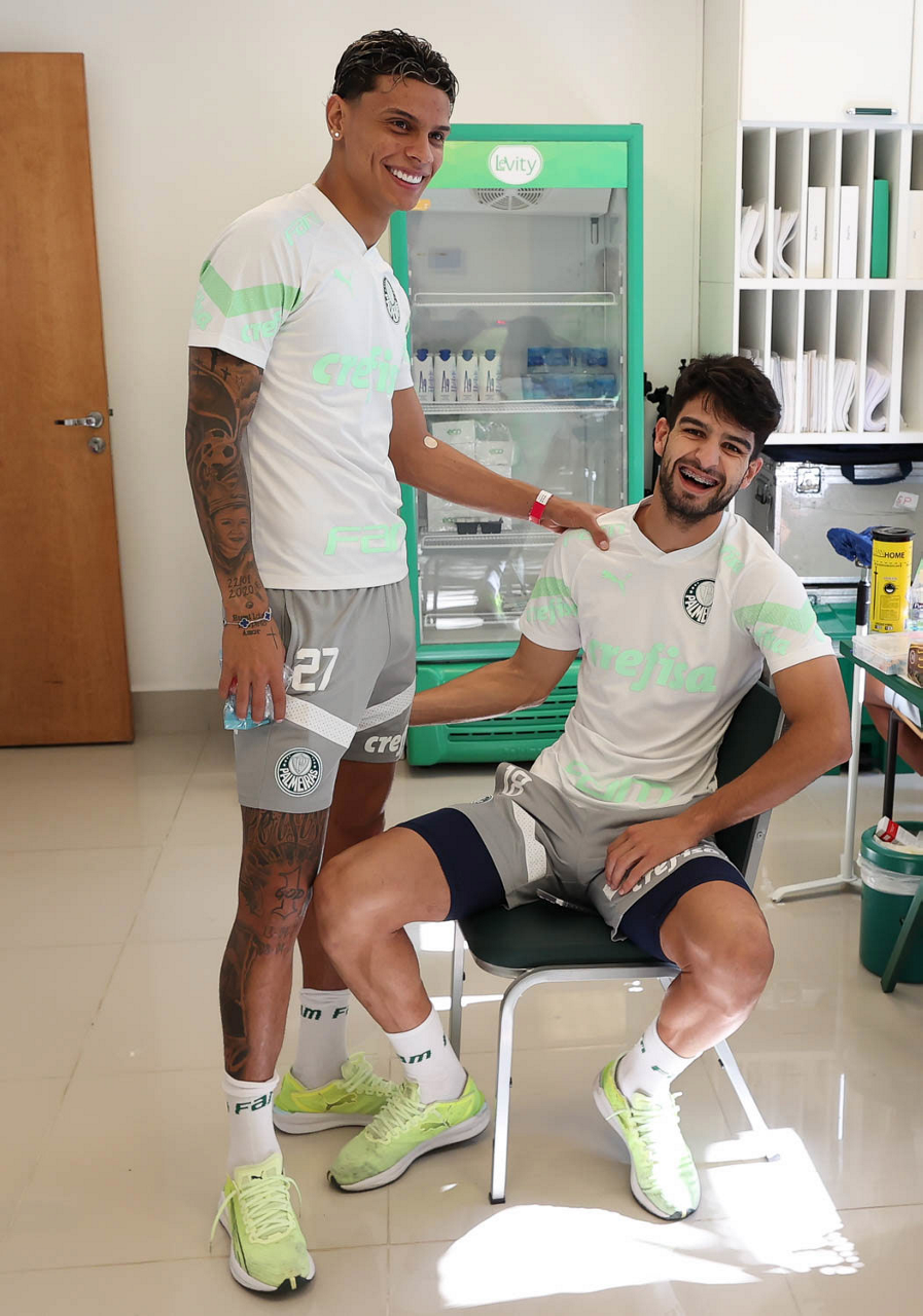 Os jogadores Richard Ríos e Flaco López (D), da SE Palmeiras, durante reapresentação, na Academia de Futebol. (Foto: Cesar Greco/Palmeiras/by Canon)