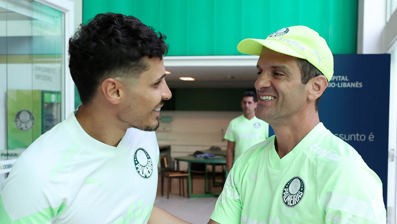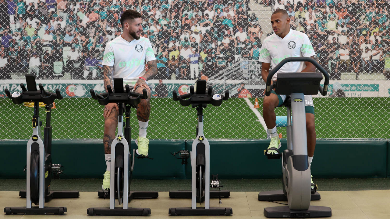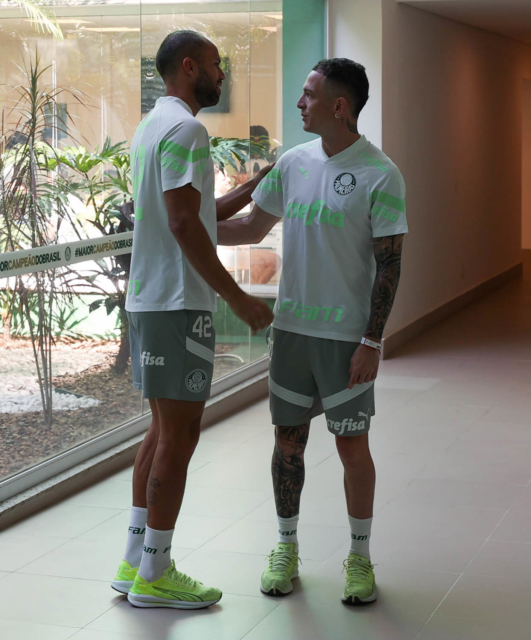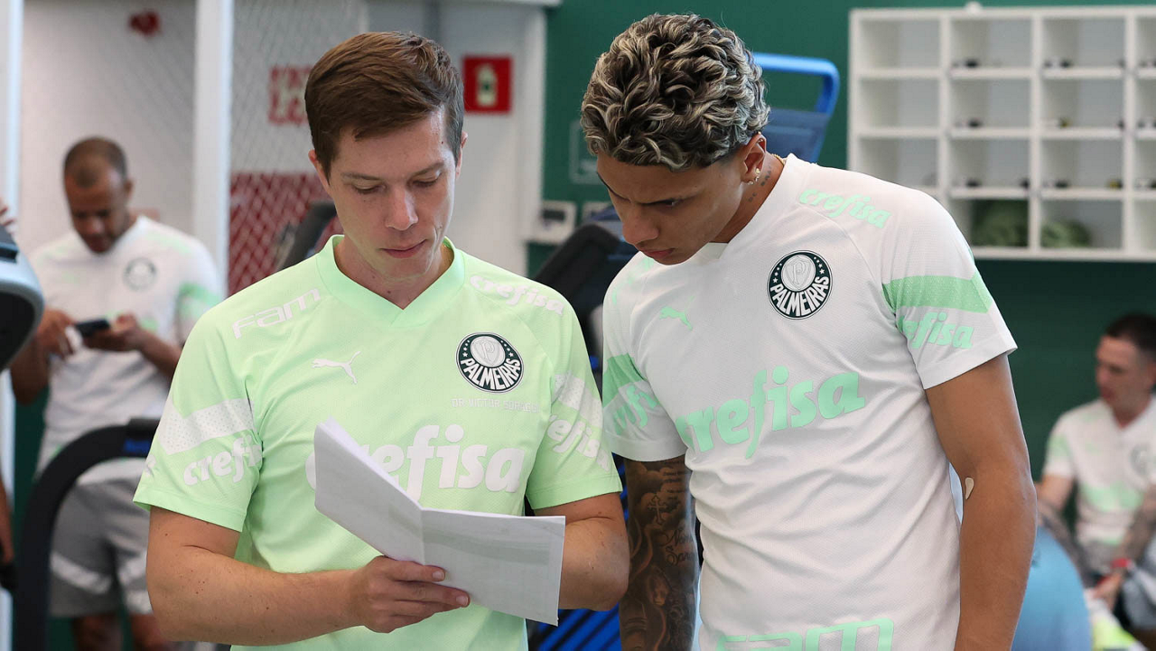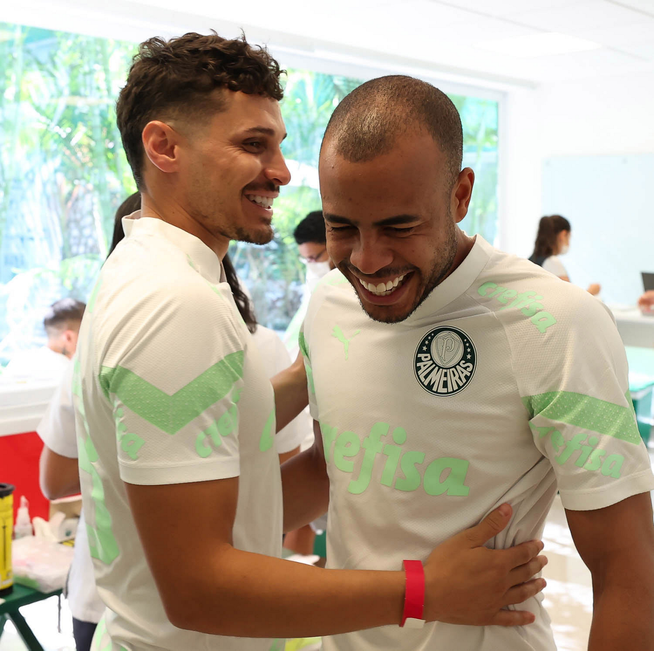 Os jogadores Richard Ríos e Flaco López (D), da SE Palmeiras, durante reapresentação, na Academia de Futebol. (Foto: Cesar Greco/Palmeiras/by Canon)