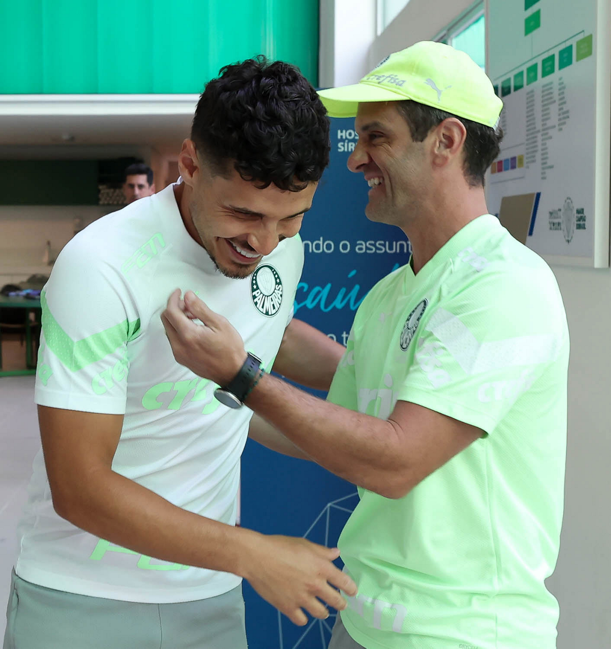 O jogador Raphael Veiga e o preparador físico Marco Aurélio (D), da SE Palmeiras, durante reapresentação, na Academia de Futebol. (Foto: Cesar Greco/Palmeiras/by Canon)