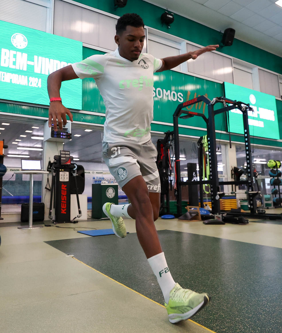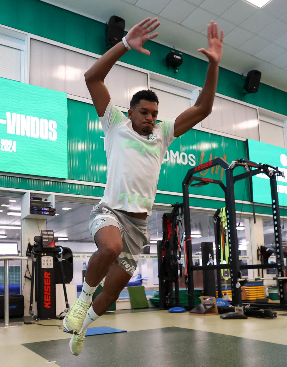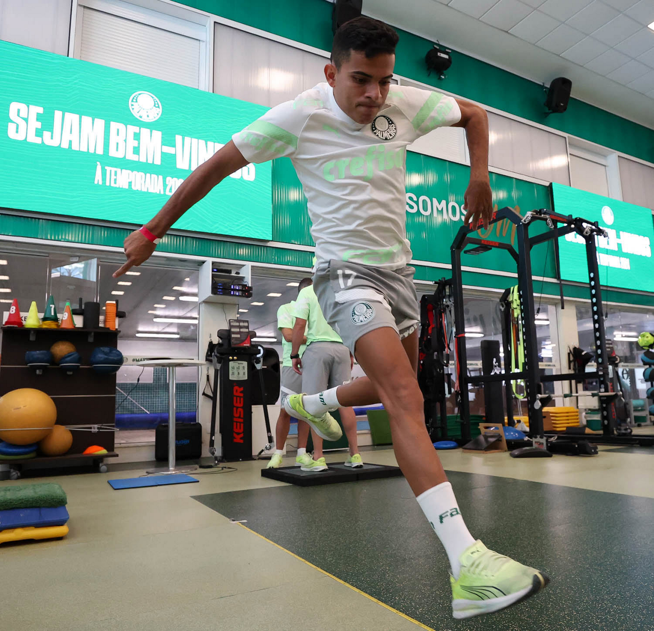 O jogador Gabriel Menino, da SE Palmeiras, durante reapresentação, na Academia de Futebol. (Foto: Cesar Greco/Palmeiras/by Canon)