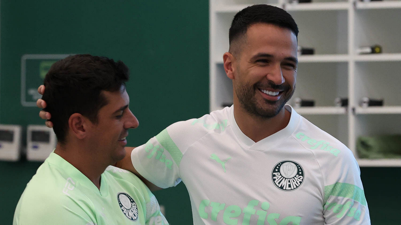 Os jogadores Zé Rafael e Jhonatan (D), da SE Palmeiras, durante reapresentação, na Academia de Futebol. (Foto: Cesar Greco/Palmeiras/by Canon)