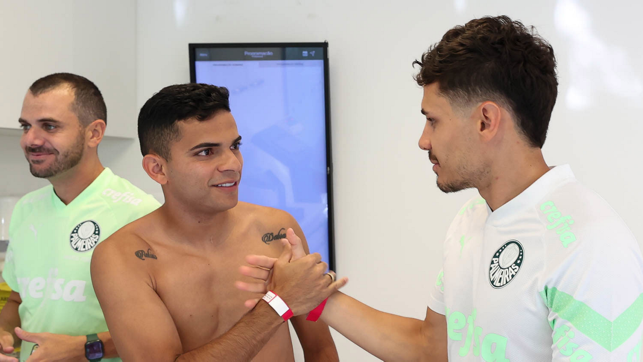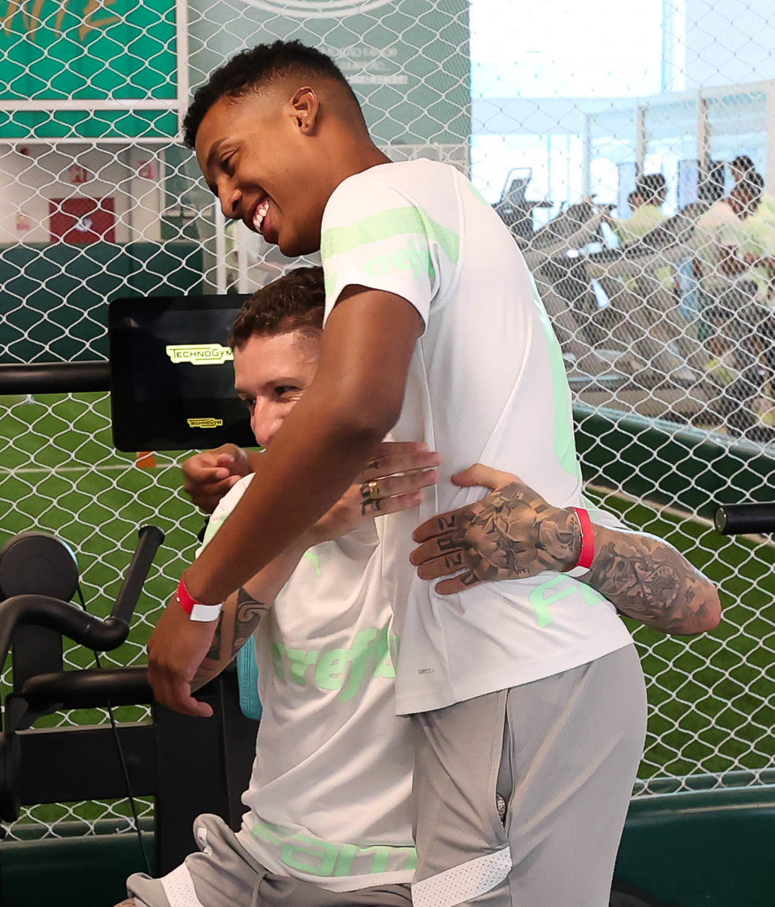 Os jogadores Rony e Luis Guilherme (D), da SE Palmeiras, durante reapresentação, na Academia de Futebol. (Foto: Cesar Greco/Palmeiras/by Canon)