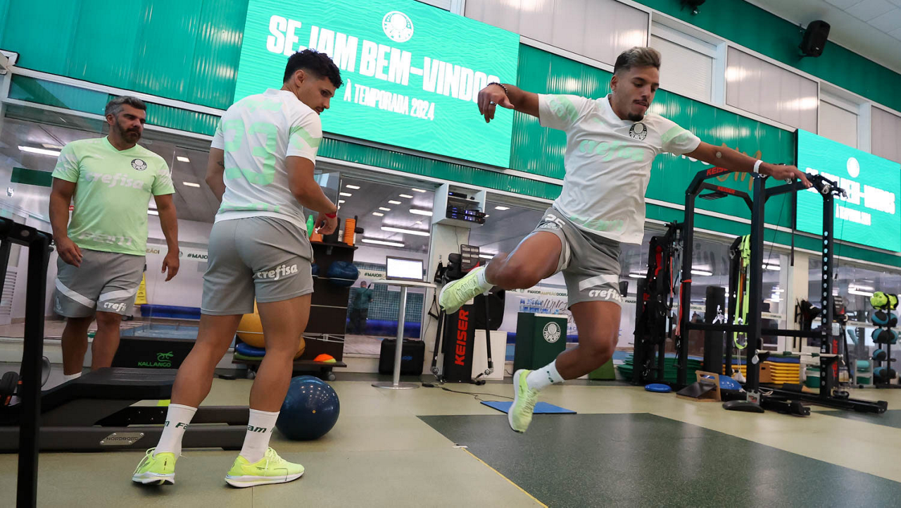 Os jogadores Artur e Caio Paulista (D), da SE Palmeiras, durante reapresentação, na Academia de Futebol. (Foto: Cesar Greco/Palmeiras/by Canon)