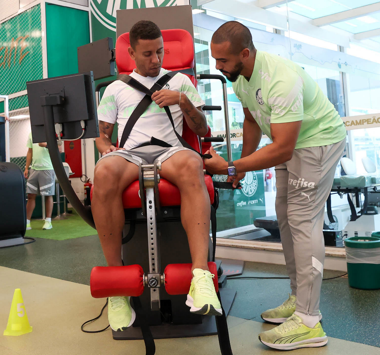 O jogador Dudu e o fisioterapeuta Marcelo Gondo (D), da SE Palmeiras, durante reapresentação, na Academia de Futebol. (Foto: Cesar Greco/Palmeiras/by Canon)