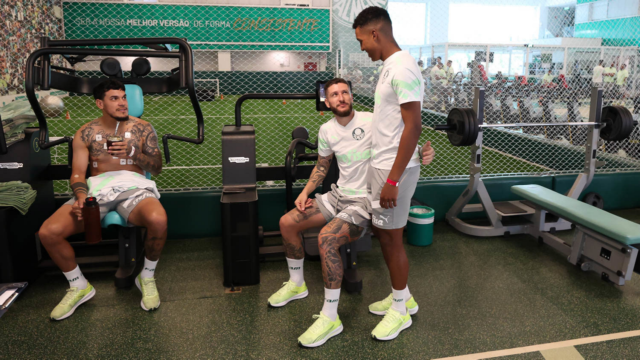 Os jogadores Gustavo Gómez, Zé Rafael e Vanderlan (E/D), da SE Palmeiras, durante reapresentação, na Academia de Futebol. (Foto: Cesar Greco/Palmeiras/by Canon)