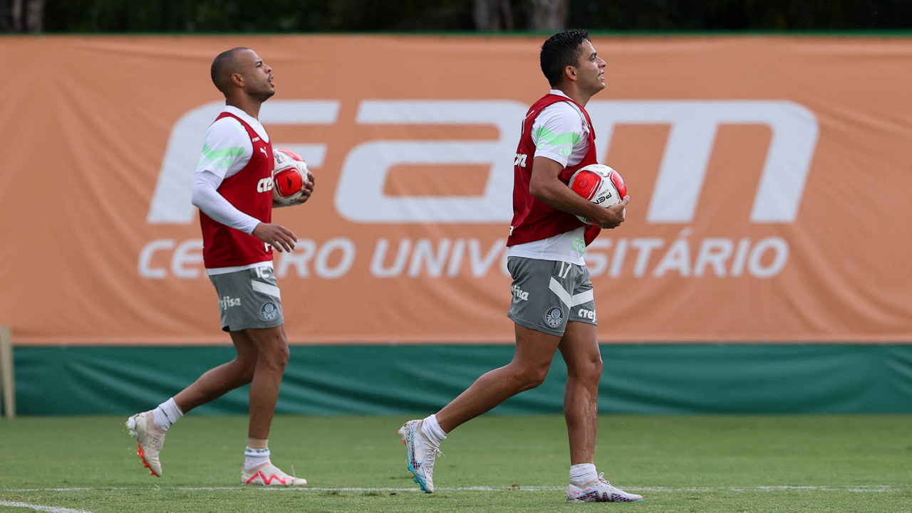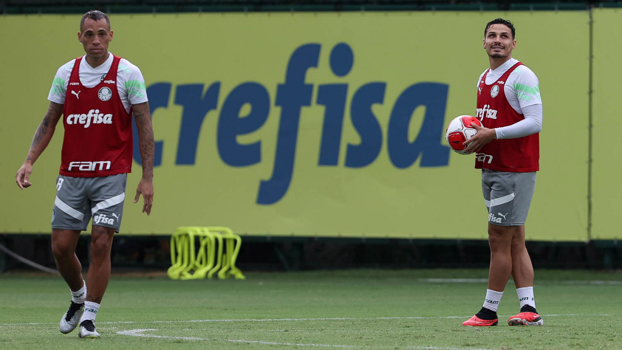 Os jogadores Breno Lopes e Bruno Rodrigues (D), da SE Palmeiras, durante treinamento, na Academia de Futebol. (Foto: Cesar Greco/Palmeiras/by Canon)