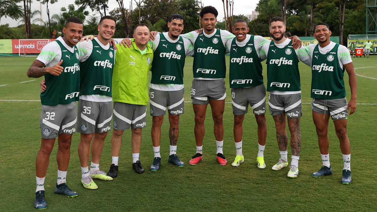 Os jogadores Garcia, Fabinho, Gustavo Gómez, Murilo, Jhonatan, Zé Rafael e Rony (E/D) e o auxiliar técnico Andrey Lopes (E), da SE Palmeiras, durante treinamento, na Academia de Futebol. (Foto: Cesar Greco/Palmeiras/by Canon)