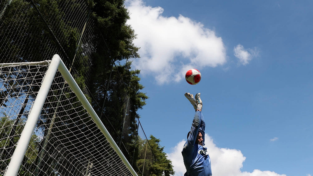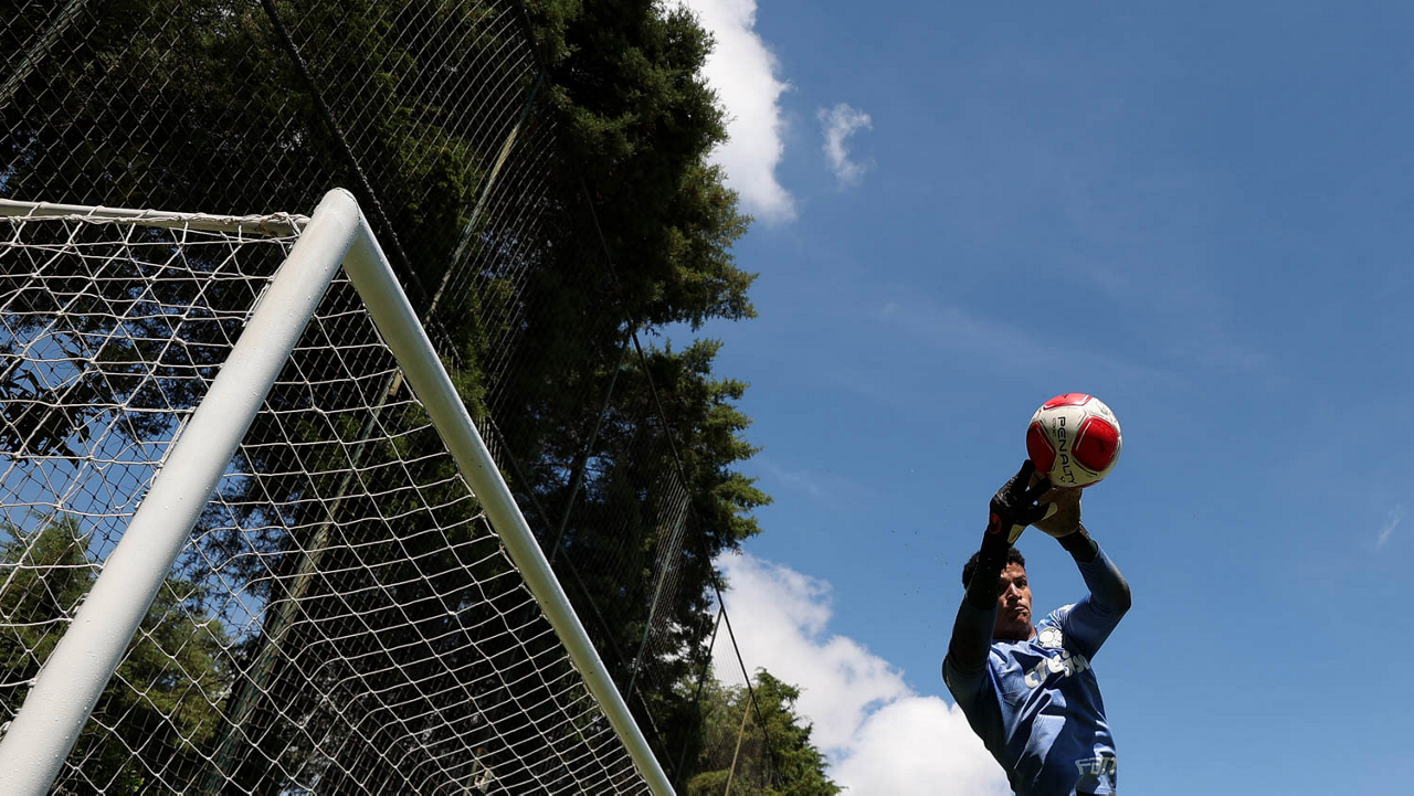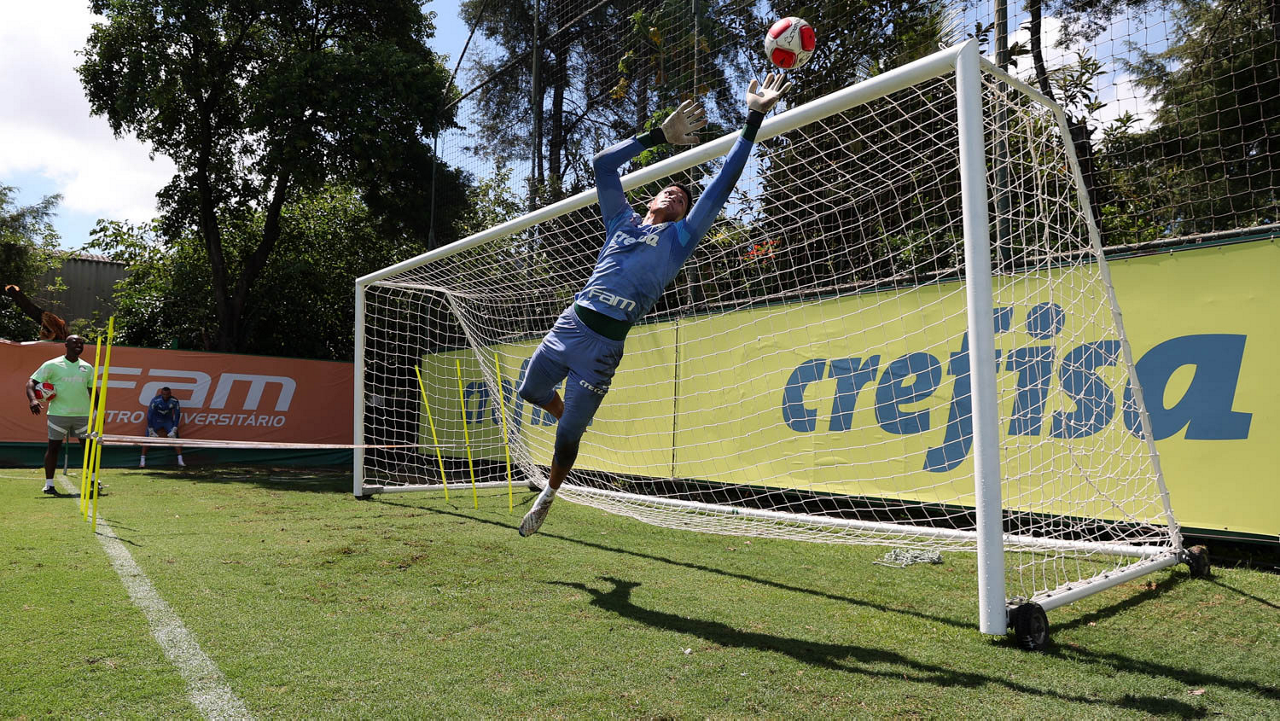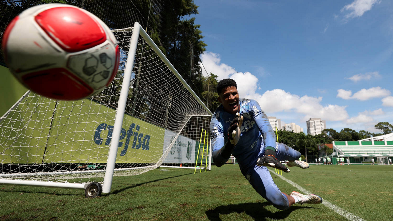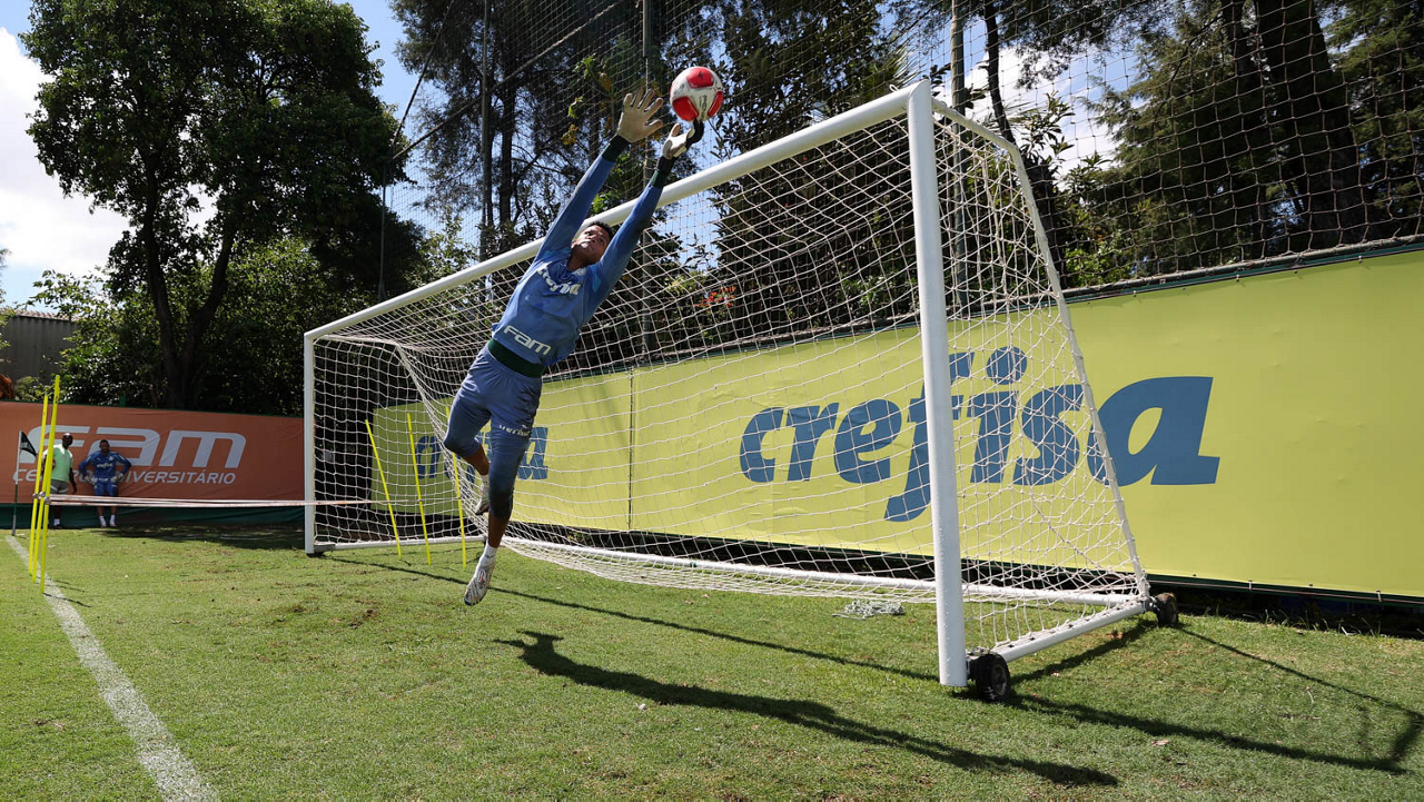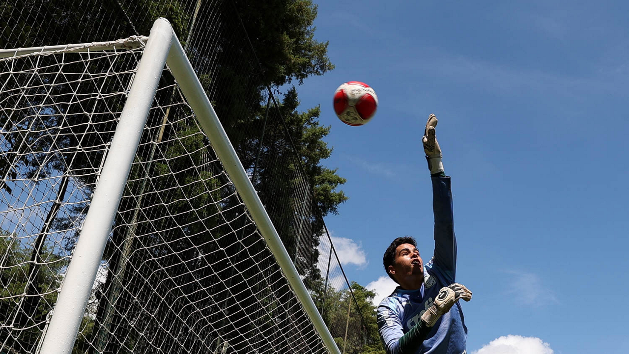 O goleiro Mateus, da SE Palmeiras, durante treinamento, na Academia de Futebol. (Foto: Cesar Greco/Palmeiras/by Canon)