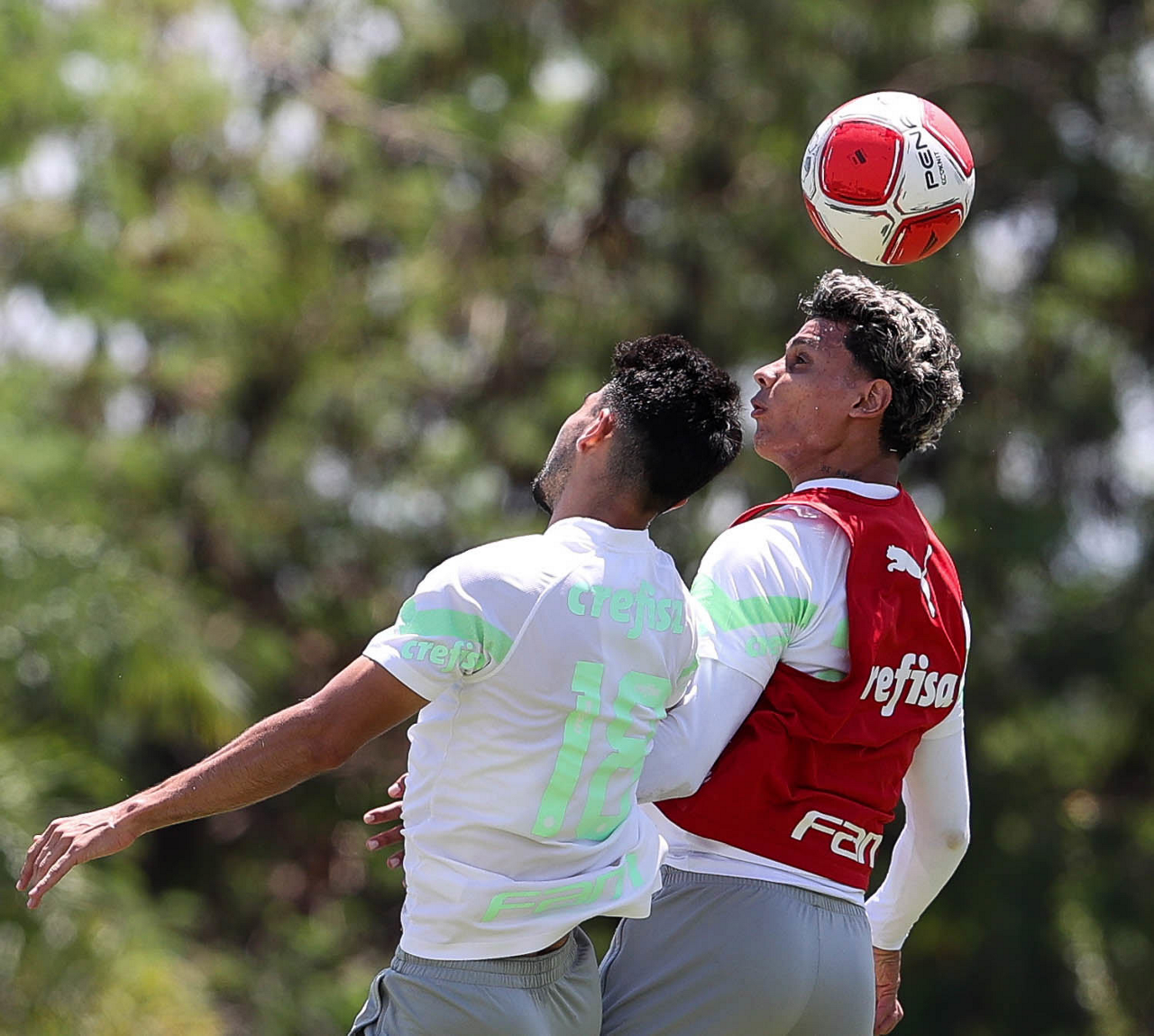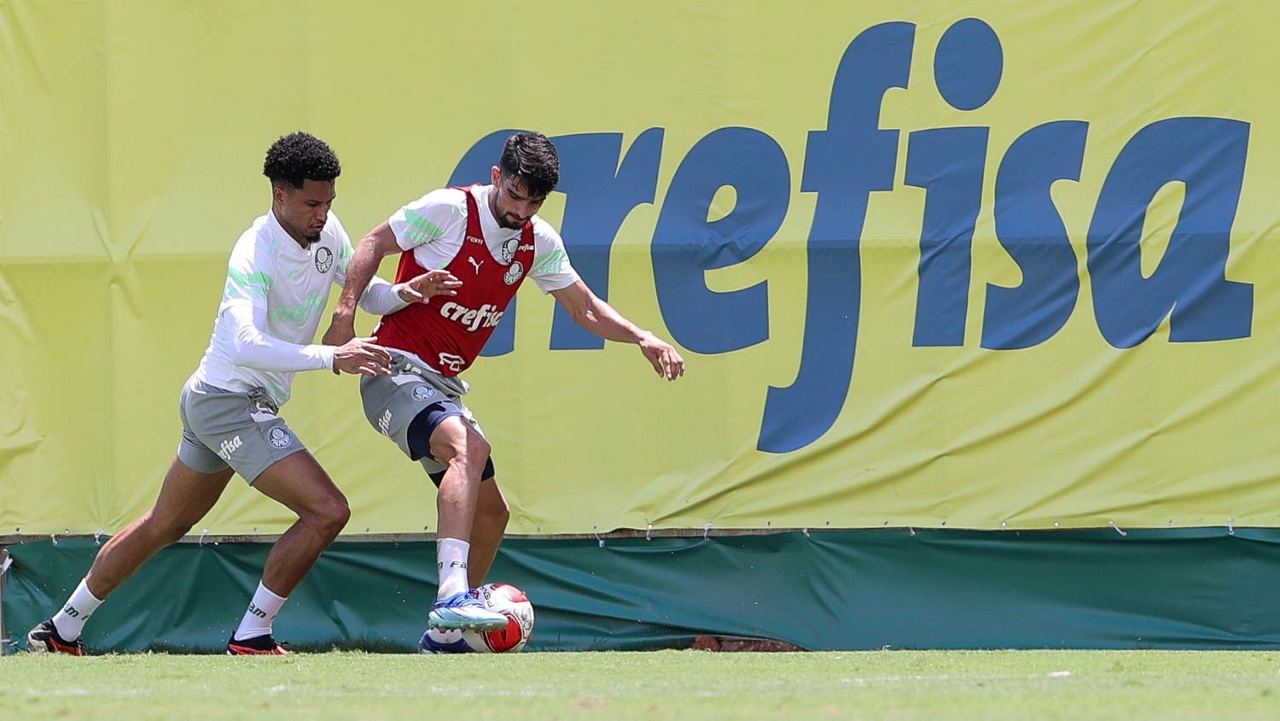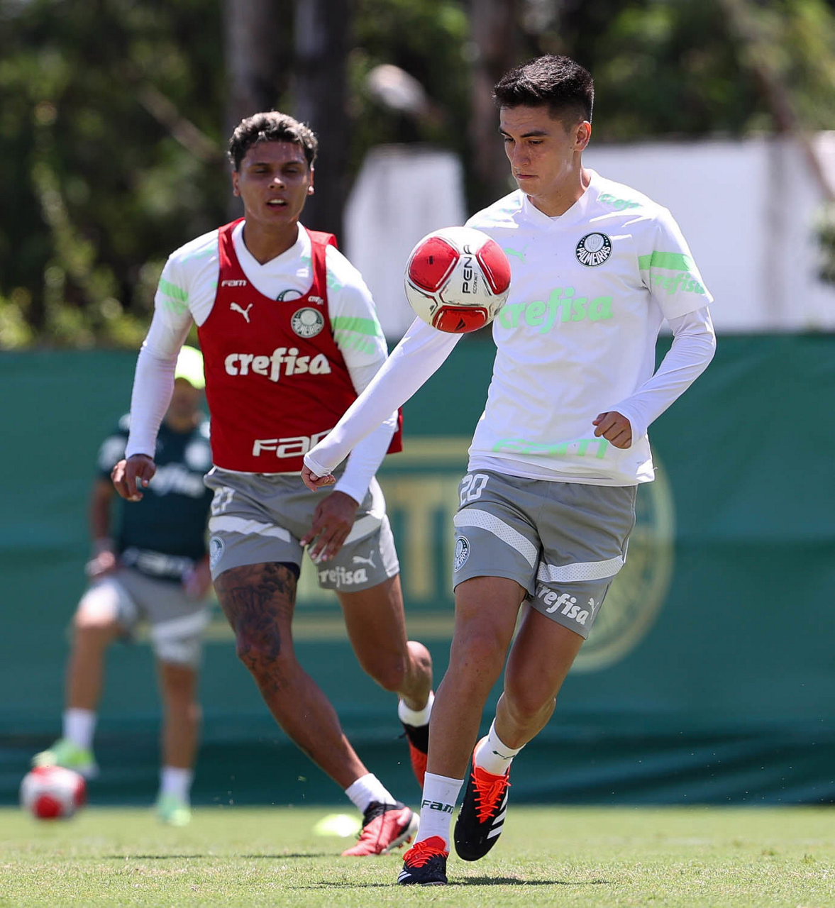 Richard Ríos e Bruno Rodrigues (D), da SE Palmeiras, durante treinamento, na Academia de Futebol. (Foto: Cesar Greco/Palmeiras/by Canon)