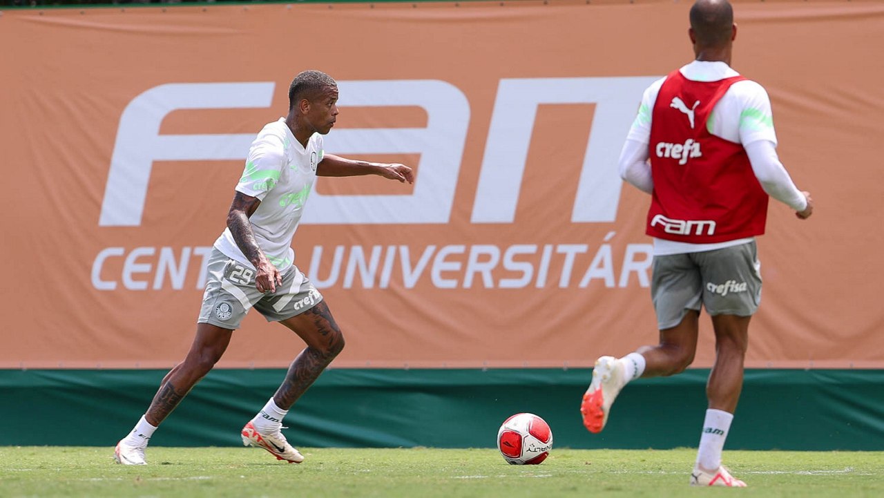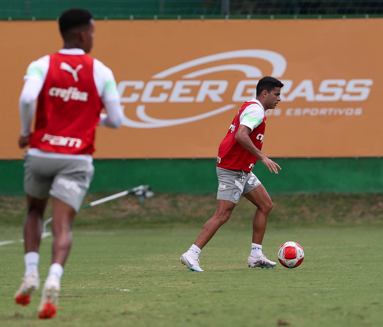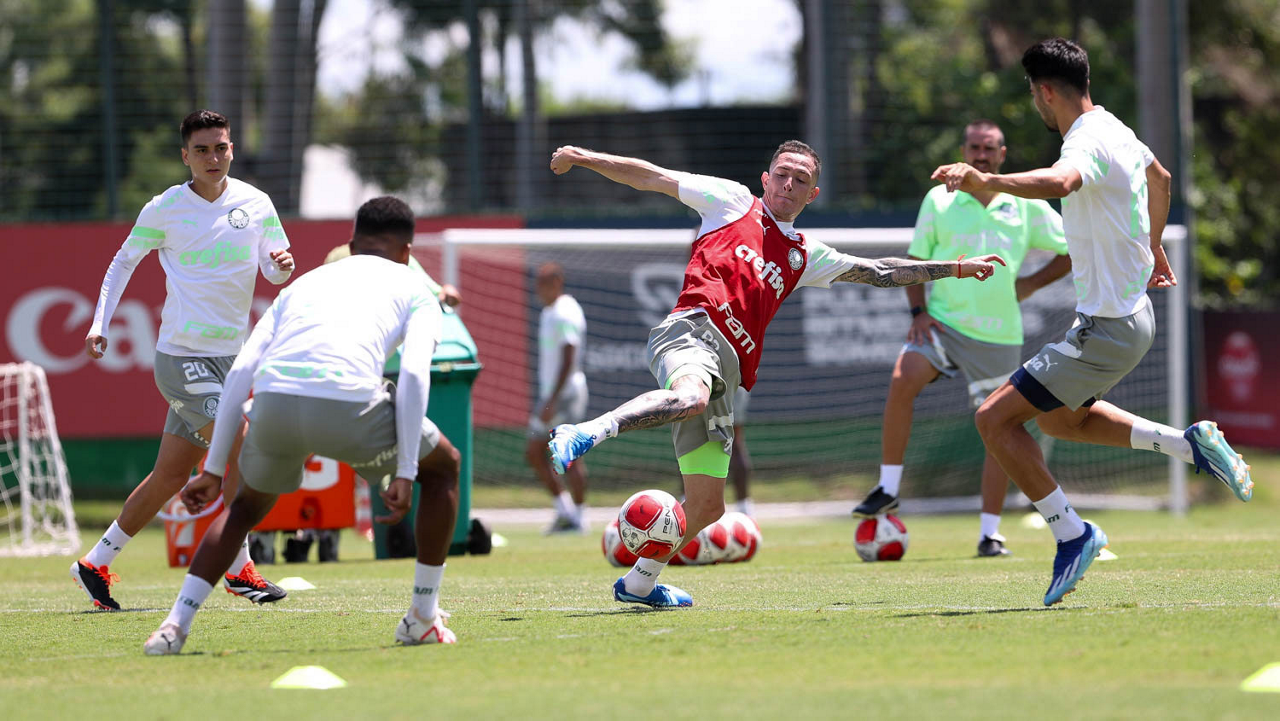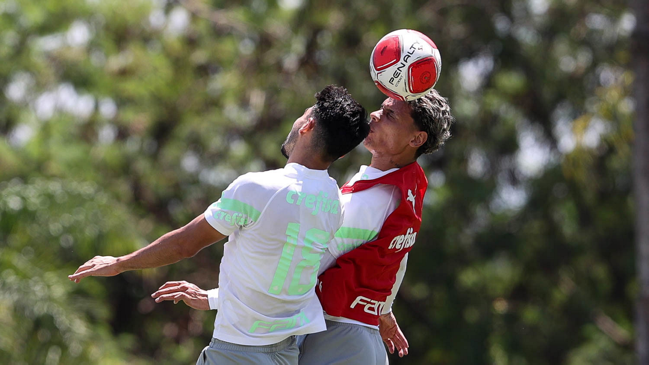 Richard Ríos e Bruno Rodrigues (D), da SE Palmeiras, durante treinamento, na Academia de Futebol. (Foto: Cesar Greco/Palmeiras/by Canon)