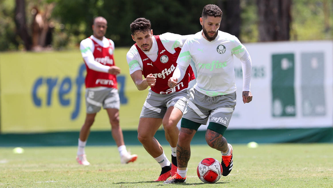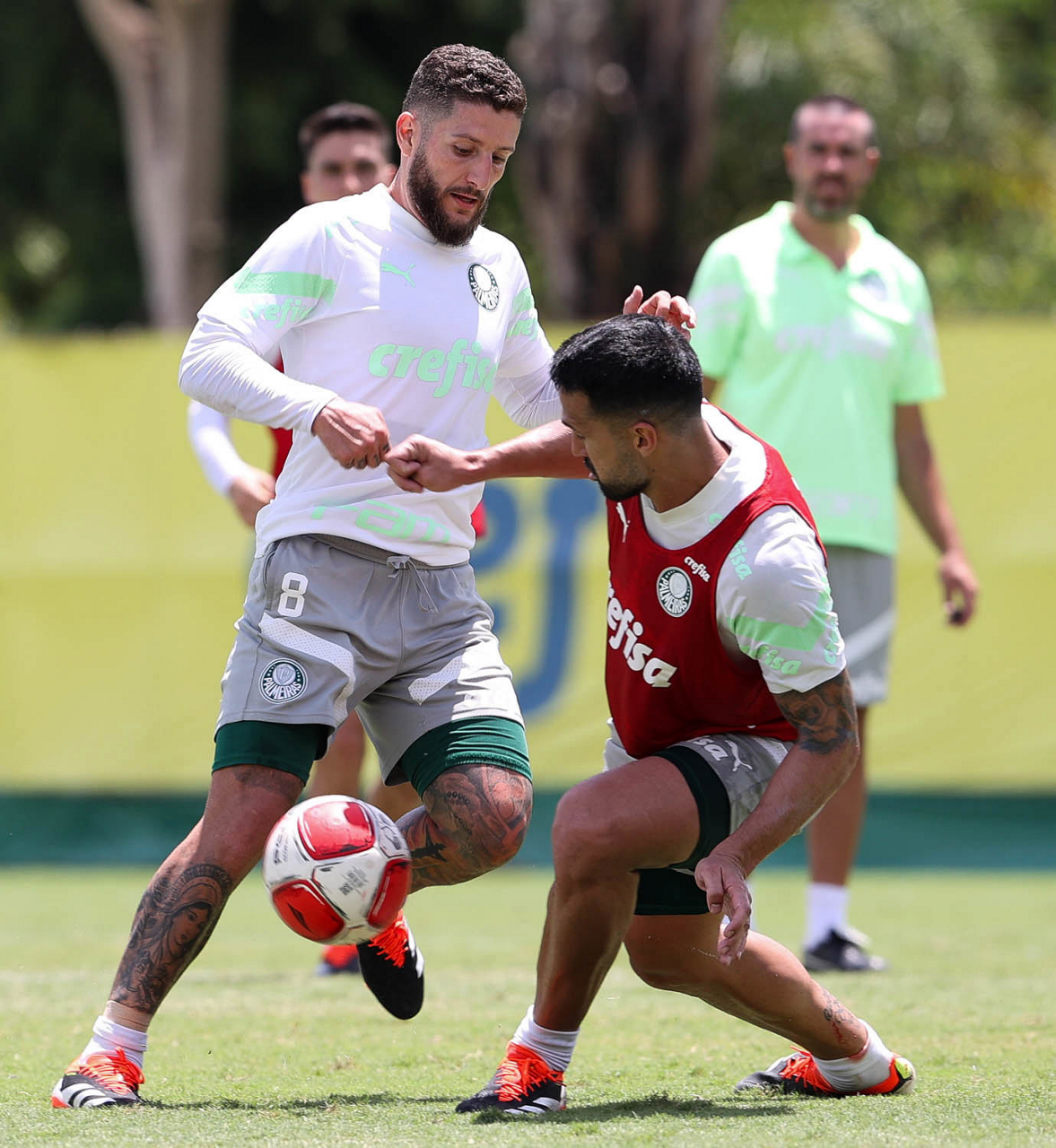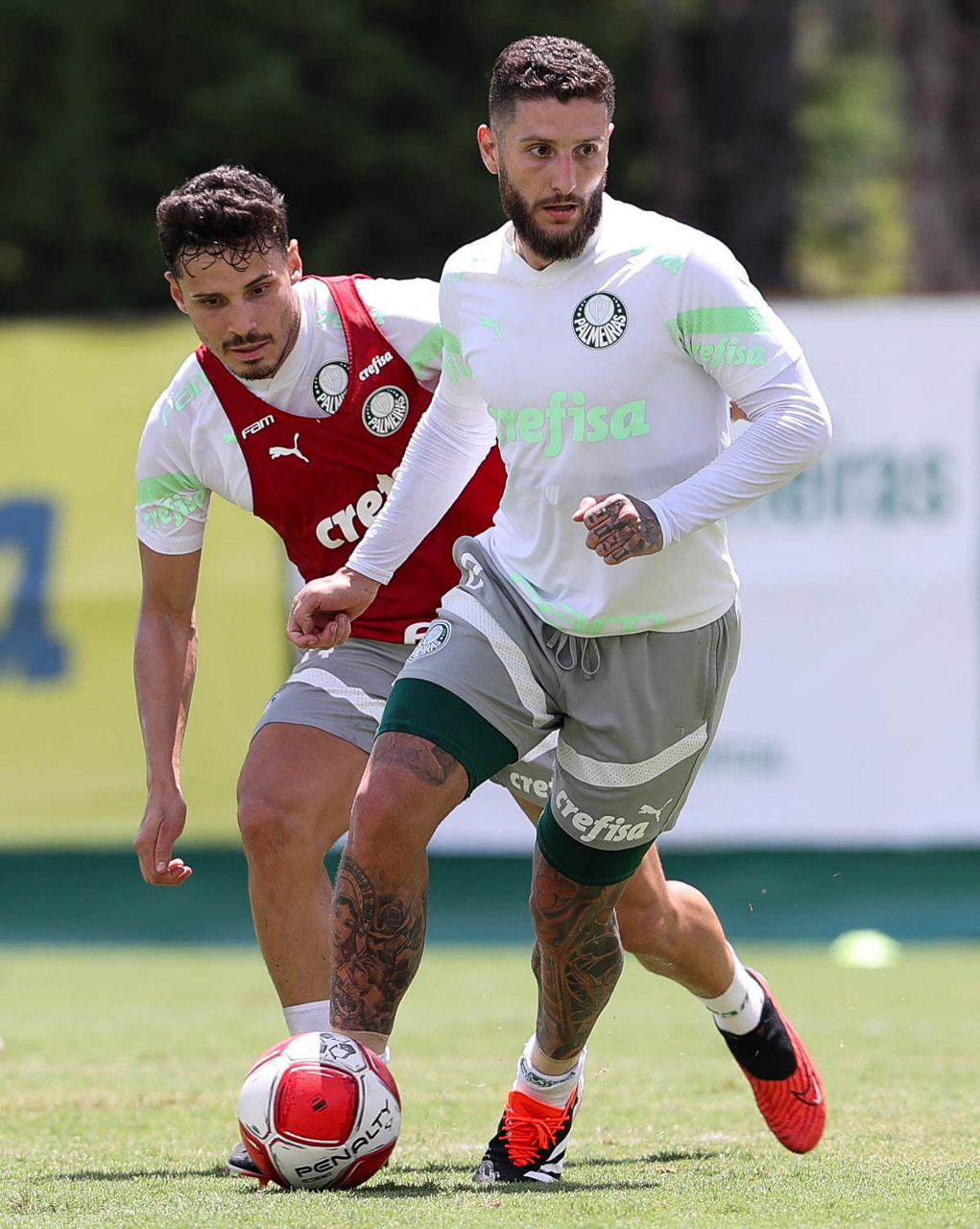 Os jogadores Raphael Veiga e Zé Rafael (D), da SE Palmeiras, durante treinamento, na Academia de Futebol. (Foto: Cesar Greco/Palmeiras/by Canon)