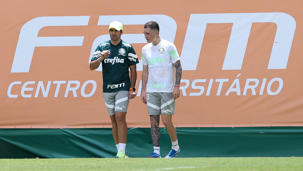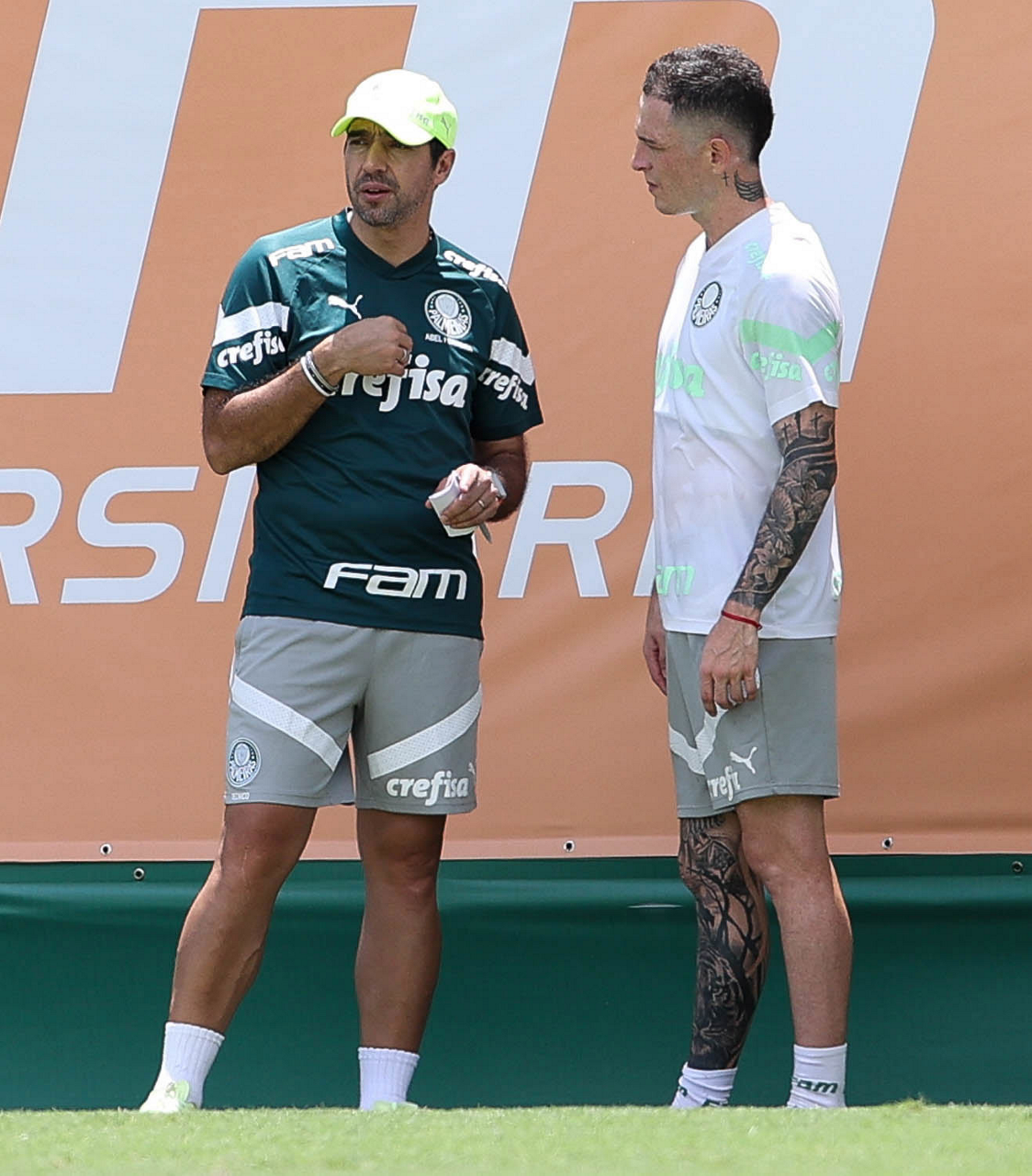 O técnico Abel Ferreira e o jogador Raphael Veiga (D), da SE Palmeiras, durante treinamento, na Academia de Futebol. (Foto: Cesar Greco/Palmeiras/by Canon)