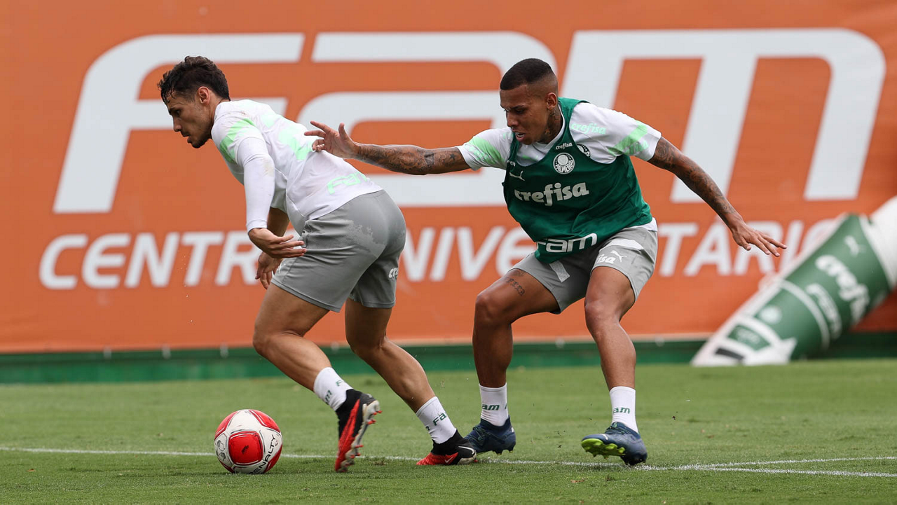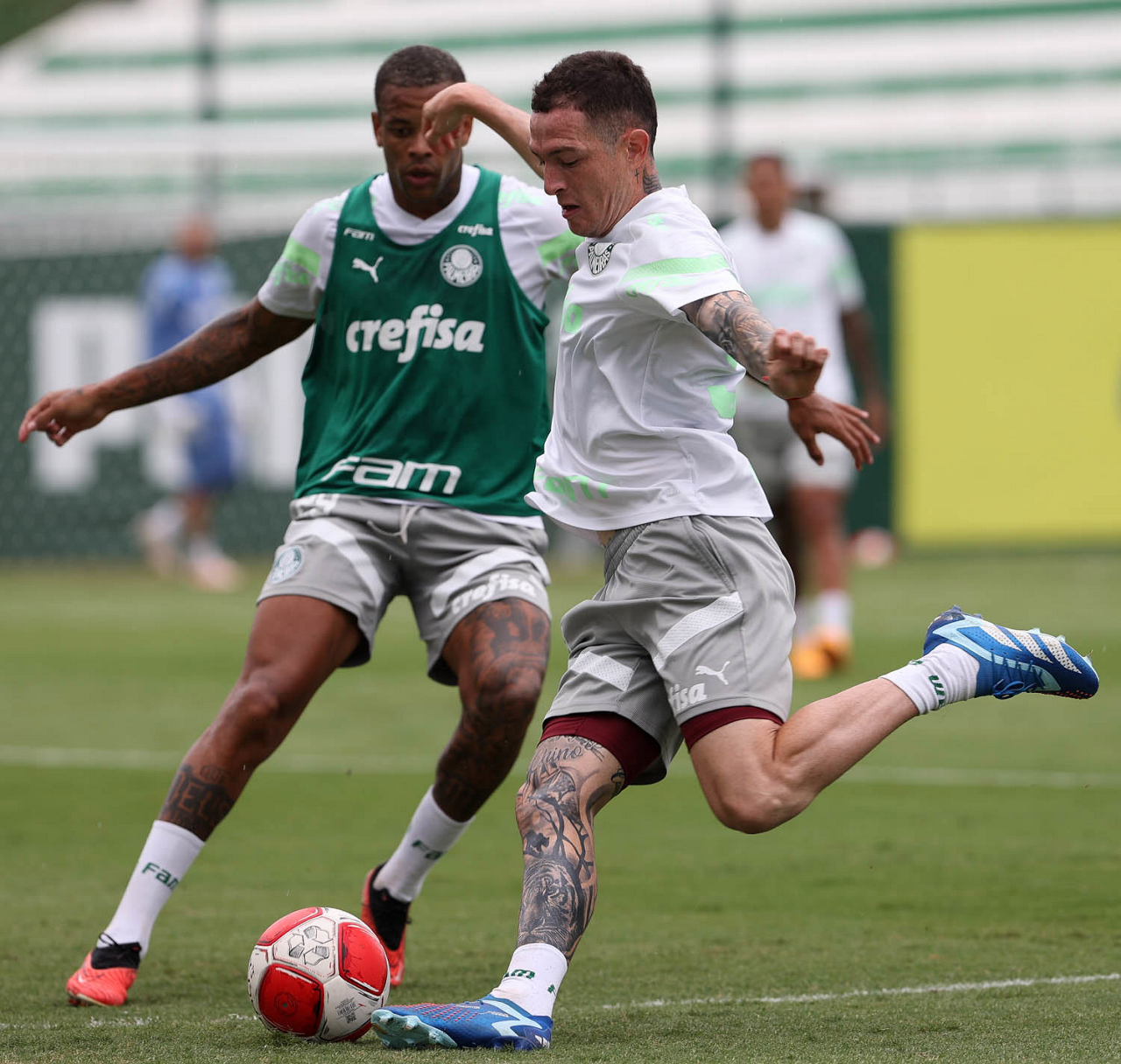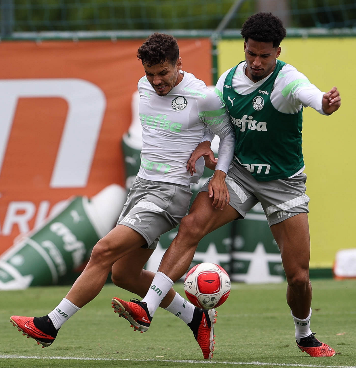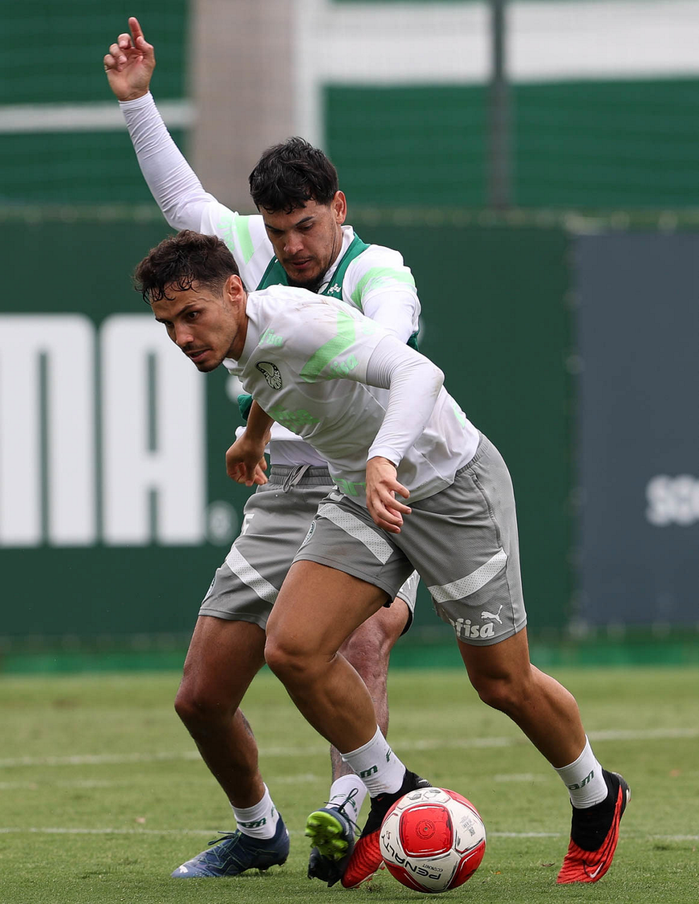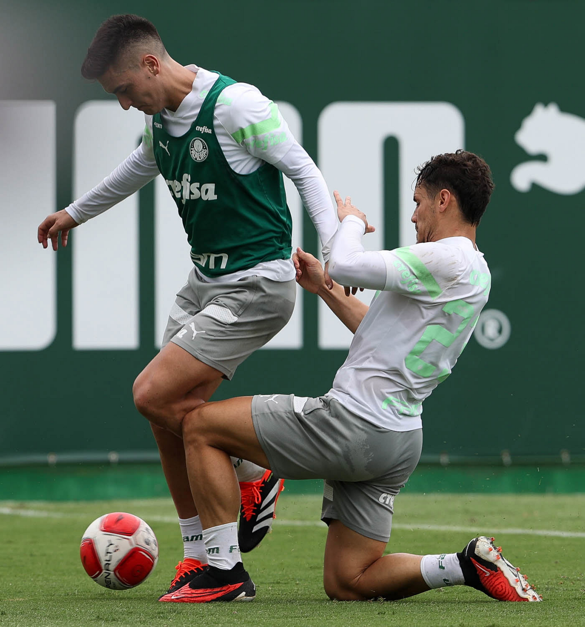 Os jogadores Jhonatan e Richard Ríos (D), da SE Palmeiras, durante treinamento, na Academia de Futebol. (Foto: Cesar Greco/Palmeiras/by Canon)