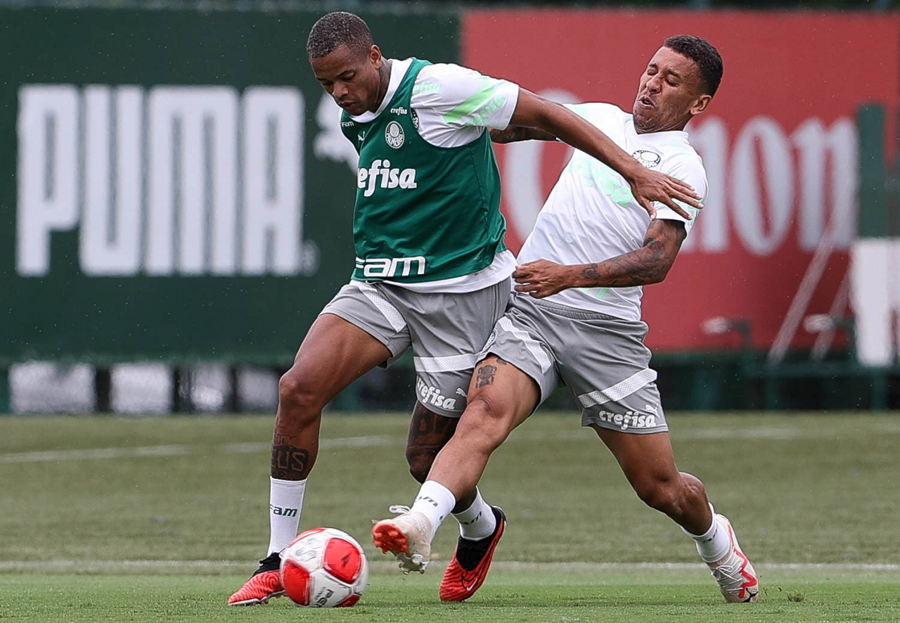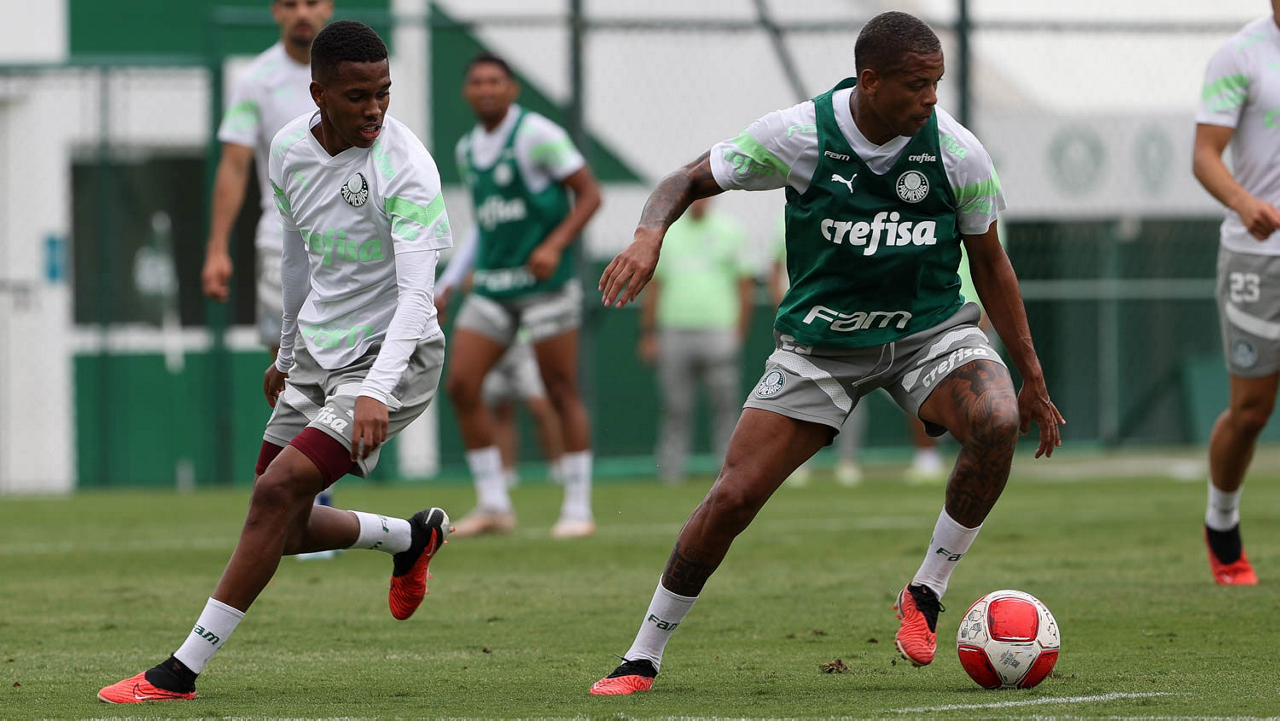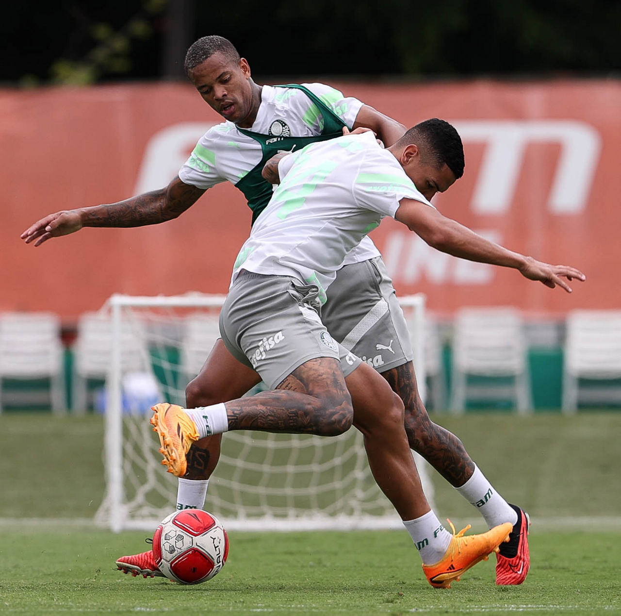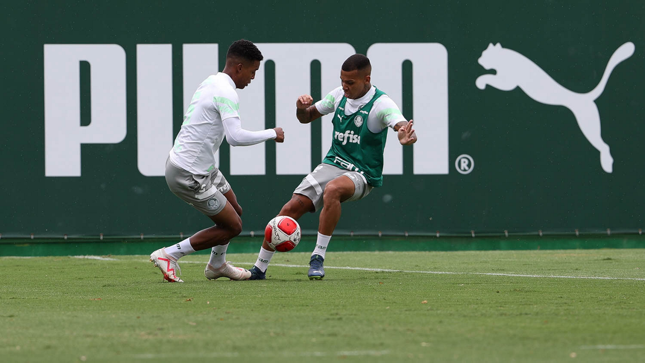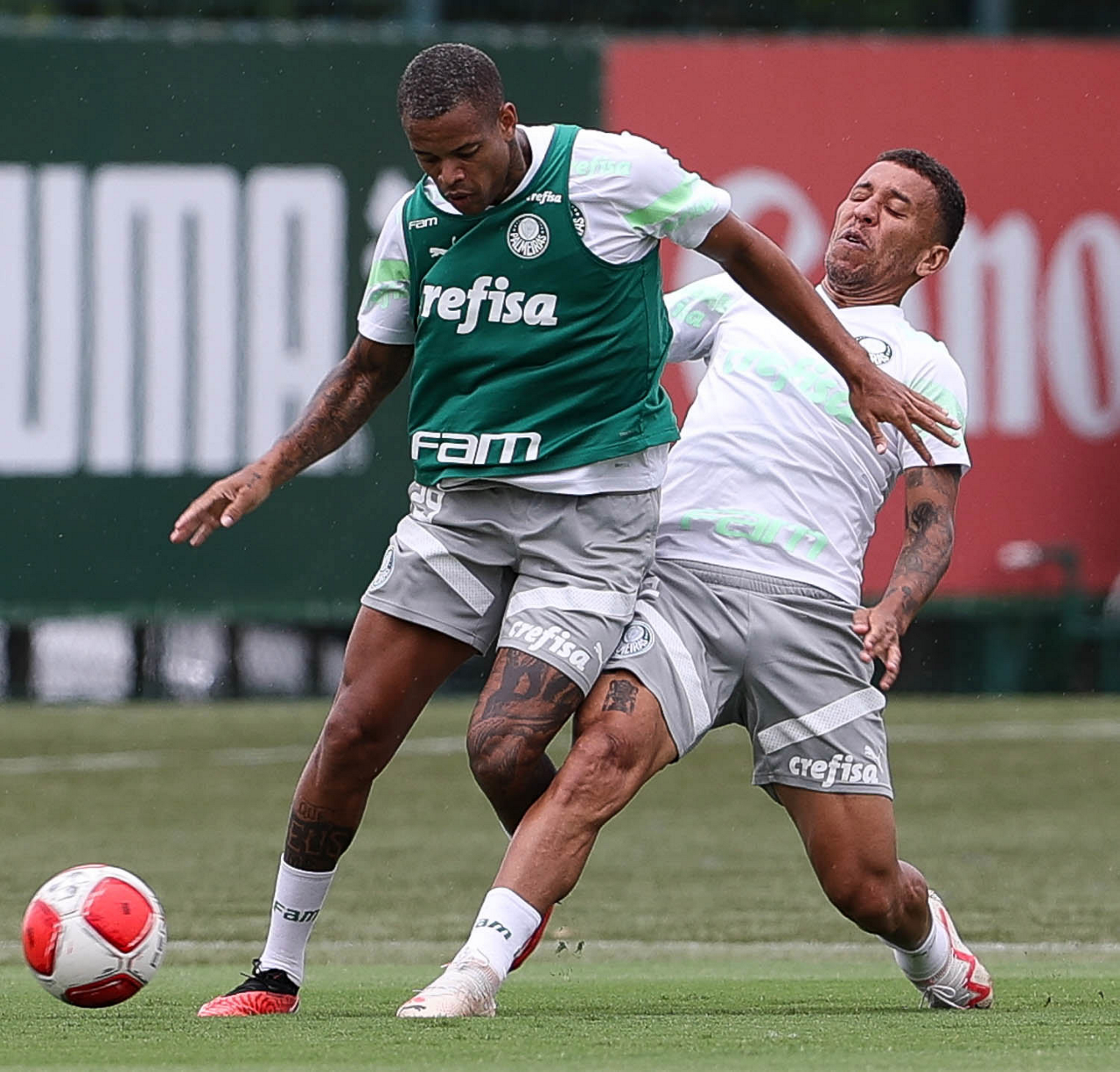 Os jogadores Jhonatan e Richard Ríos (D), da SE Palmeiras, durante treinamento, na Academia de Futebol. (Foto: Cesar Greco/Palmeiras/by Canon)