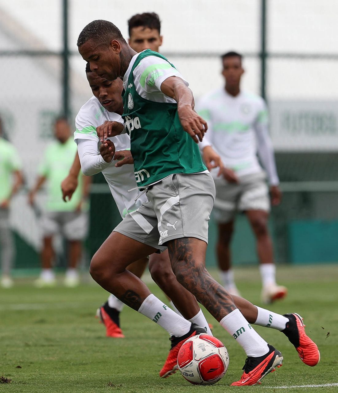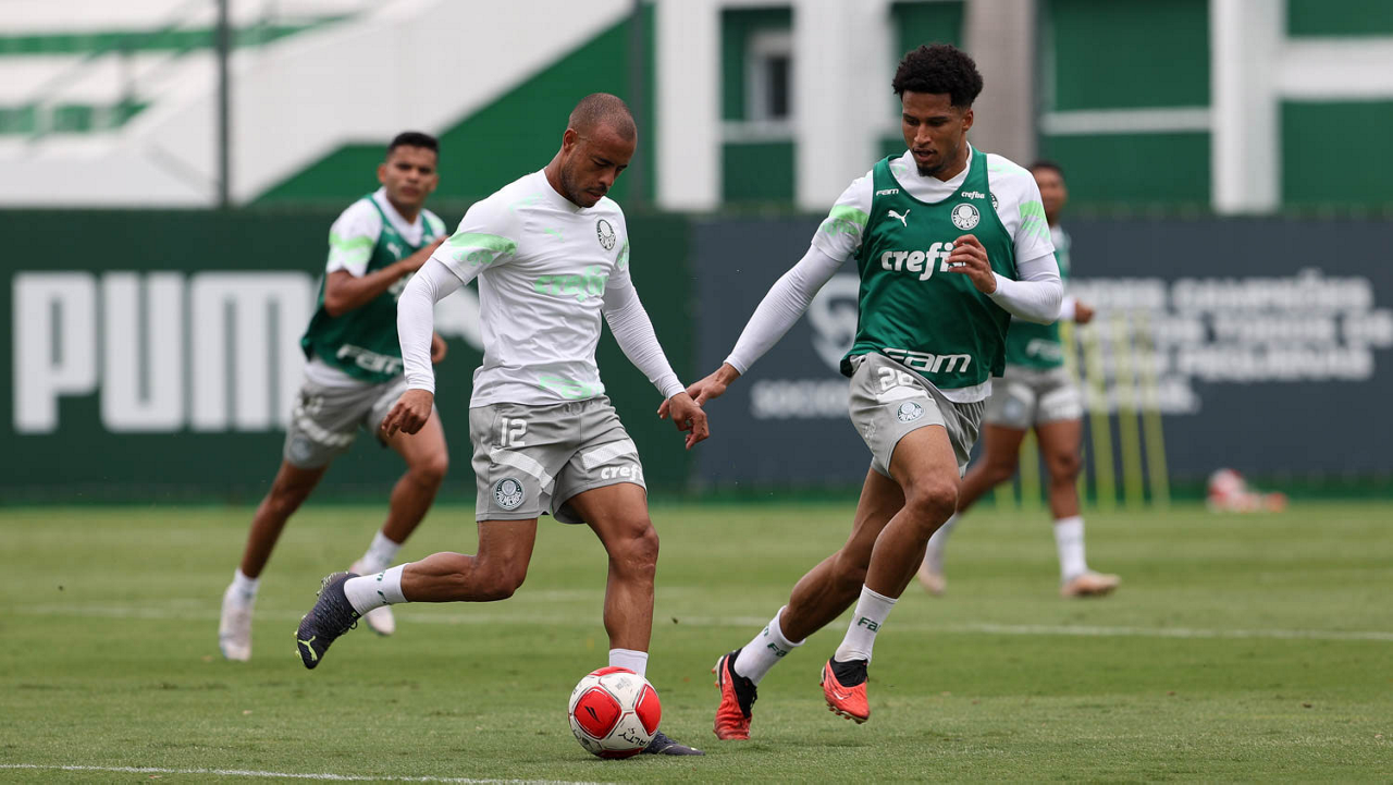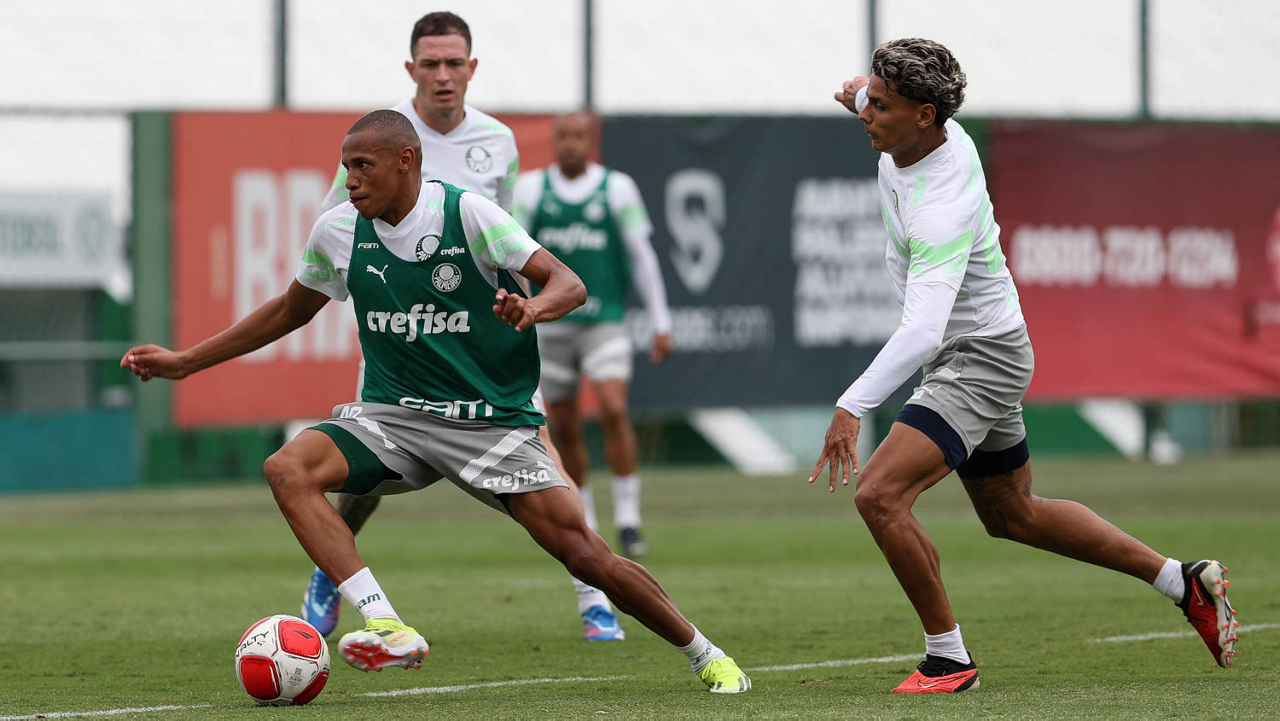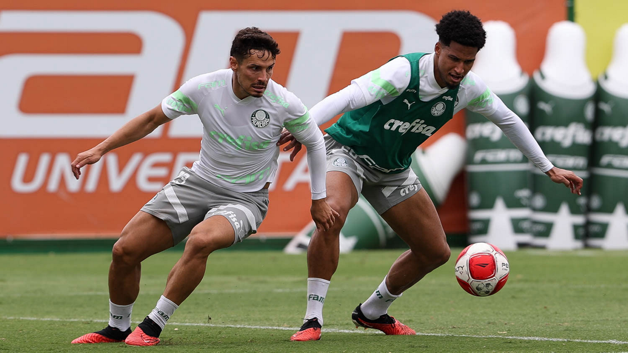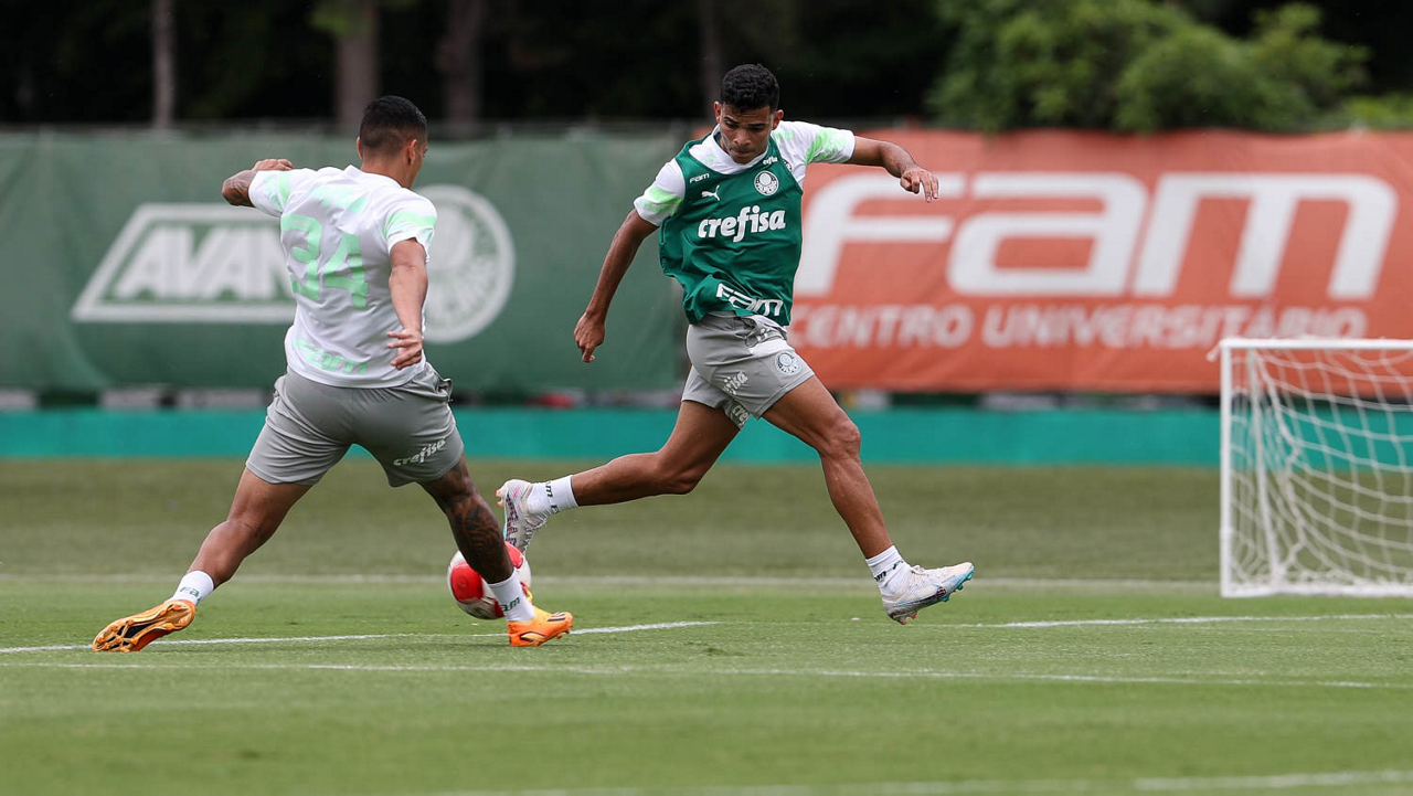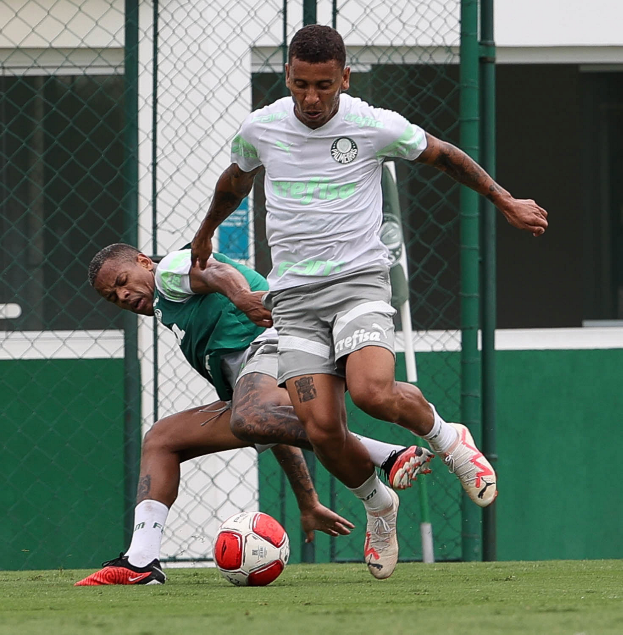 Os jogadores Jhonatan e Richard Ríos (D), da SE Palmeiras, durante treinamento, na Academia de Futebol. (Foto: Cesar Greco/Palmeiras/by Canon)