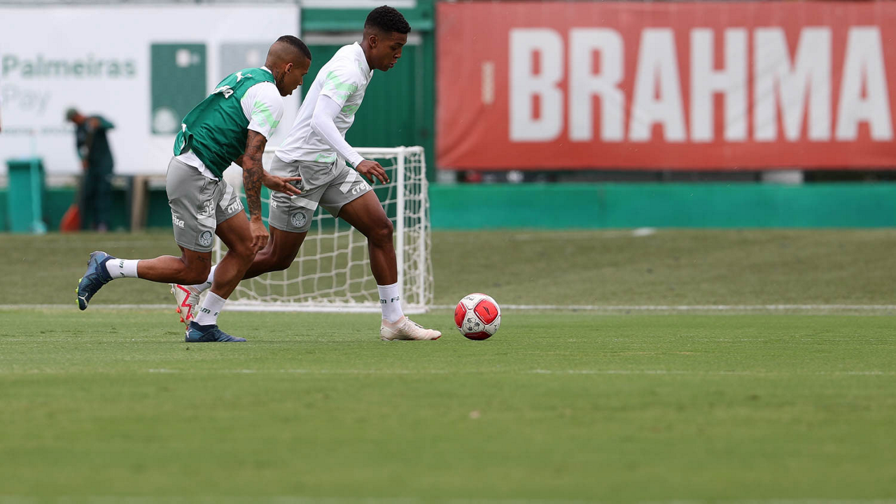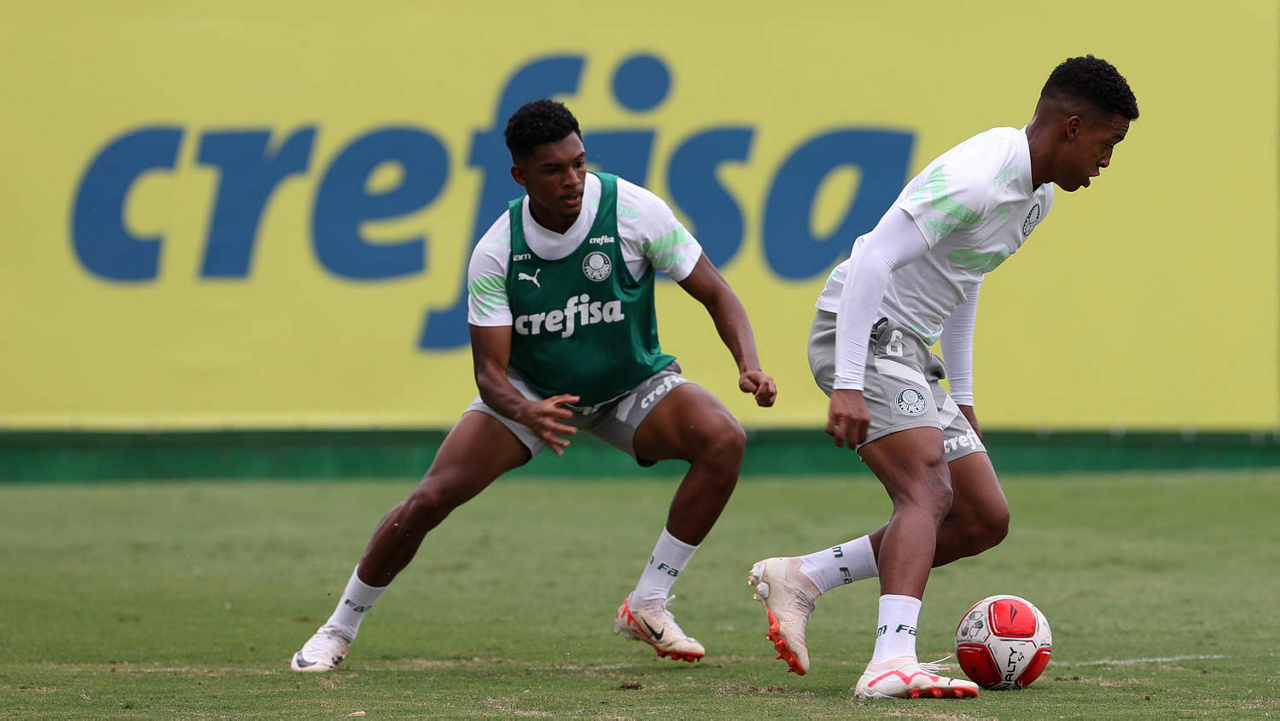 Os jogadores Breno Lopes e Luis Guilherme (D), da SE Palmeiras, durante treinamento, na Academia de Futebol. (Foto: Cesar Greco/Palmeiras/by Canon)