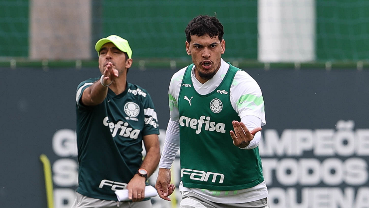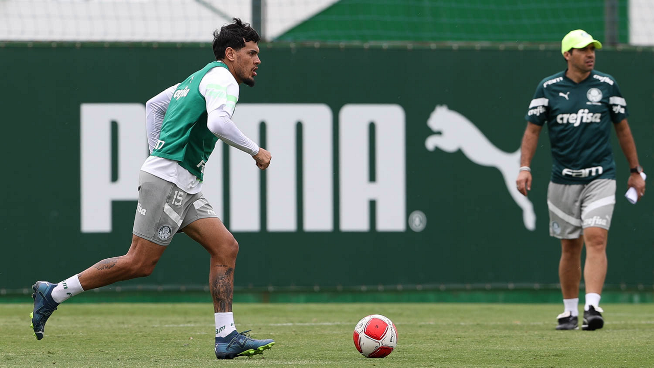 O técnico Abel Ferreira e o jogador Gustavo Gómez (D), da SE Palmeiras, durante treinamento, na Academia de Futebol. (Foto: Cesar Greco/Palmeiras/by Canon)