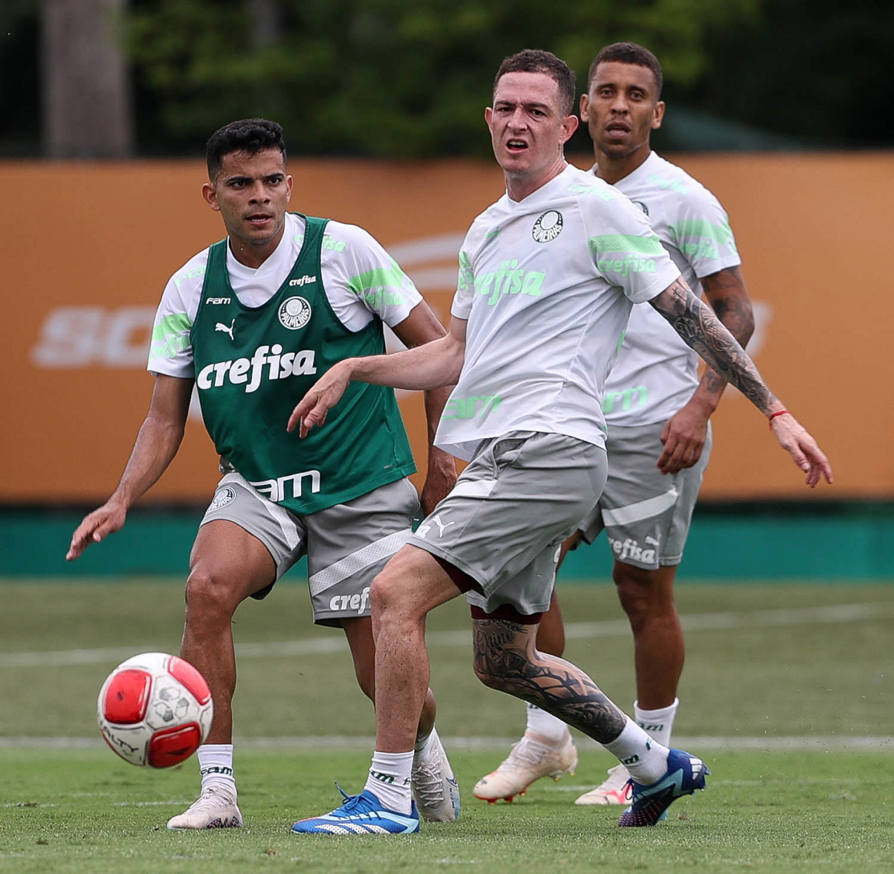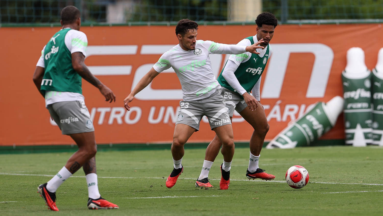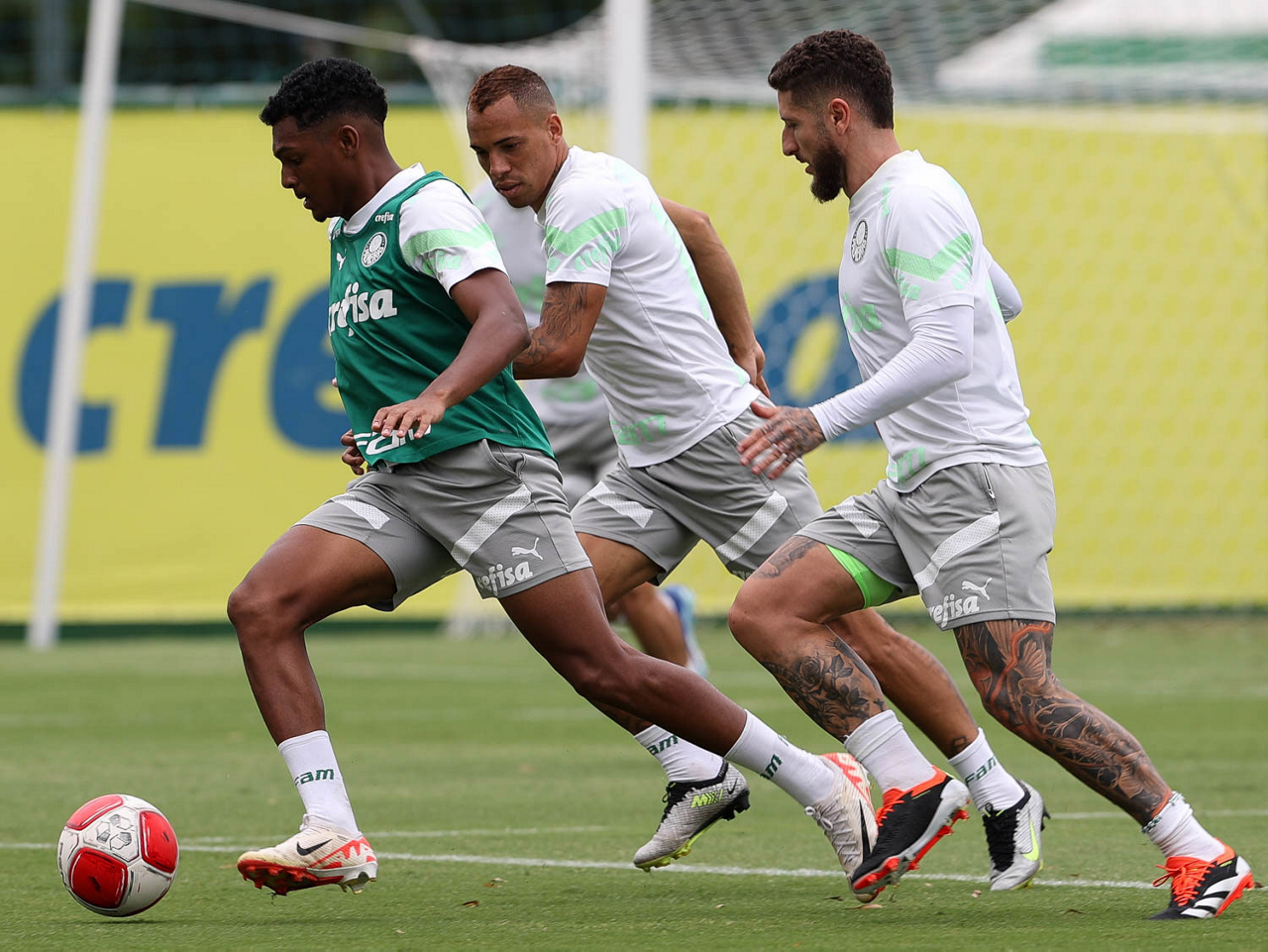 Os jogadores Luis Guilherme, Breno Lopes e Zé Rafael (E/D), da SE Palmeiras, durante treinamento, na Academia de Futebol. (Foto: Cesar Greco/Palmeiras/by Canon)