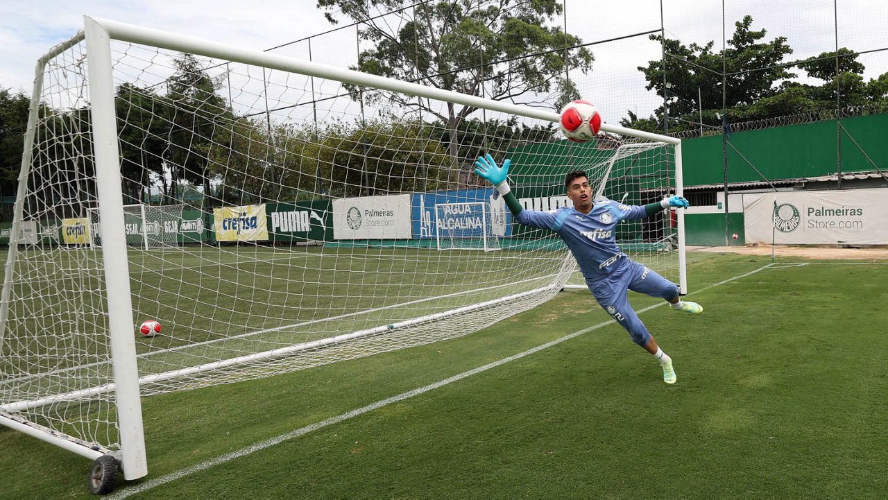O goleiro Mateus, da SE Palmeiras, durante treinamento, na Academia de Futebol. (Foto: Cesar Greco/Palmeiras/by Canon)