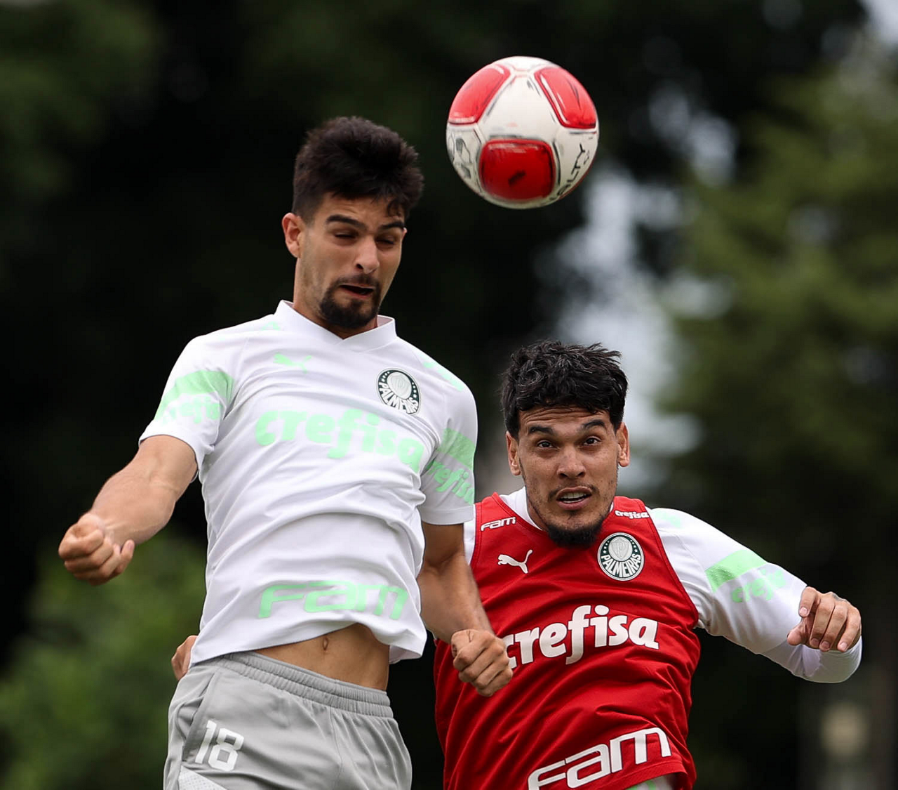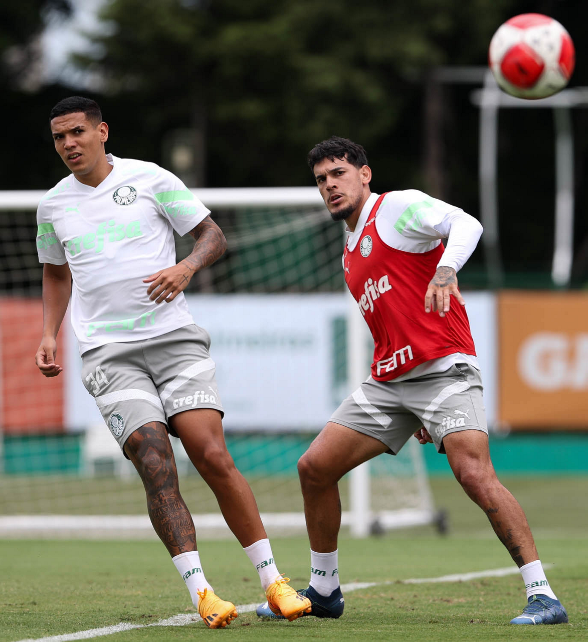 Os jogadores Gustavo Gómez e Raphael Veiga (D), da SE Palmeiras, durante treinamento, na Academia de Futebol. (Foto: Cesar Greco/Palmeiras/by Canon)