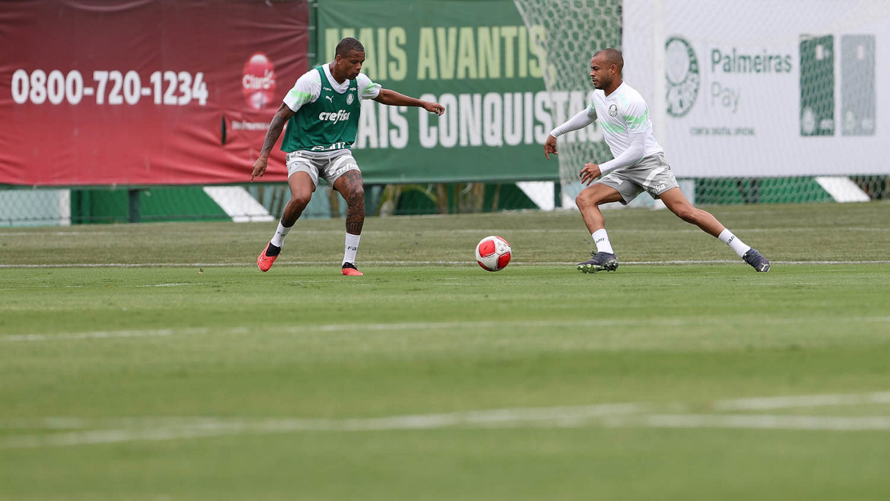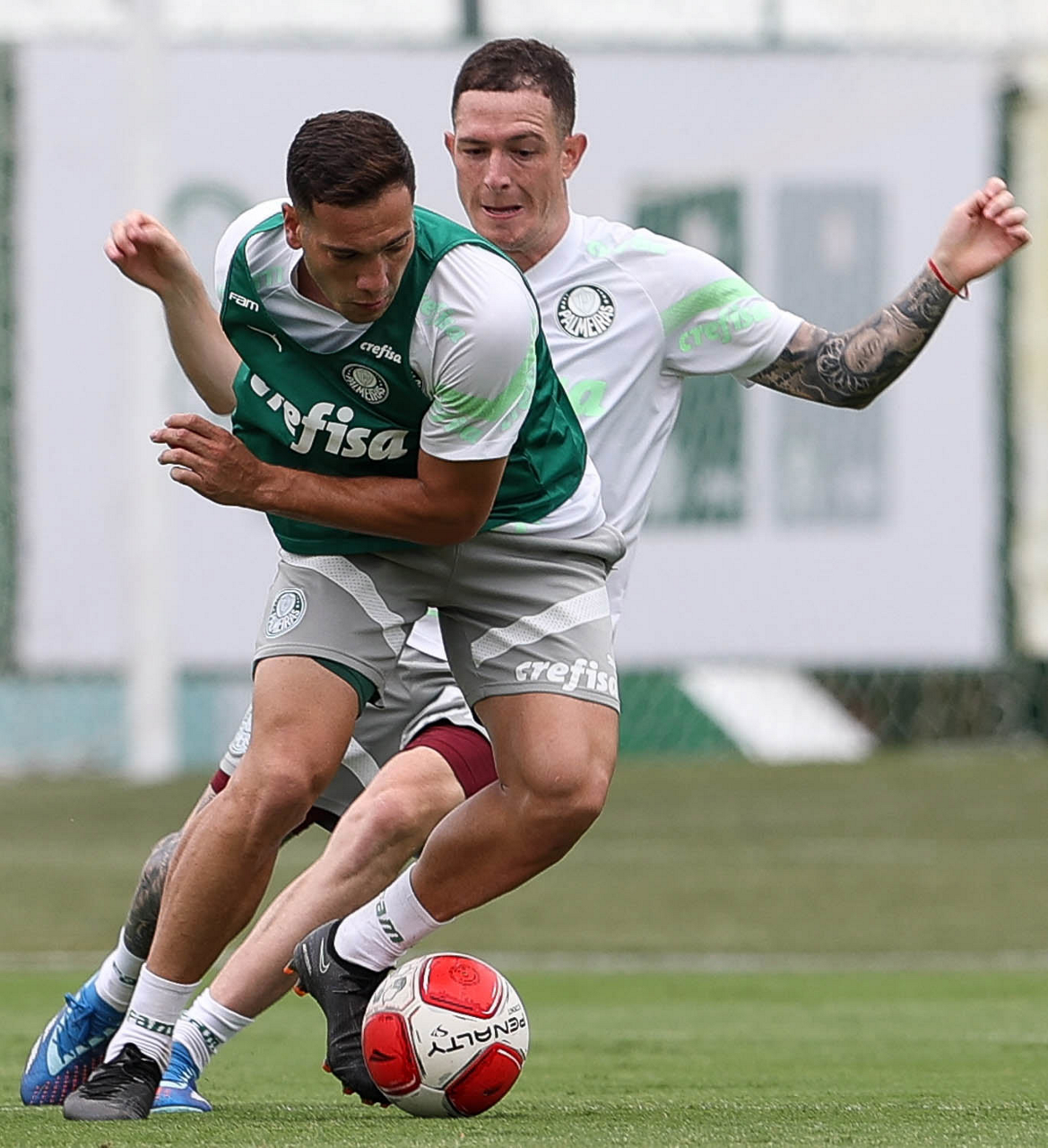 Os jogadores Eduard Atuesta e Raphael Veiga (D), da SE Palmeiras, durante treinamento, na Academia de Futebol. (Foto: Cesar Greco/Palmeiras/by Canon)