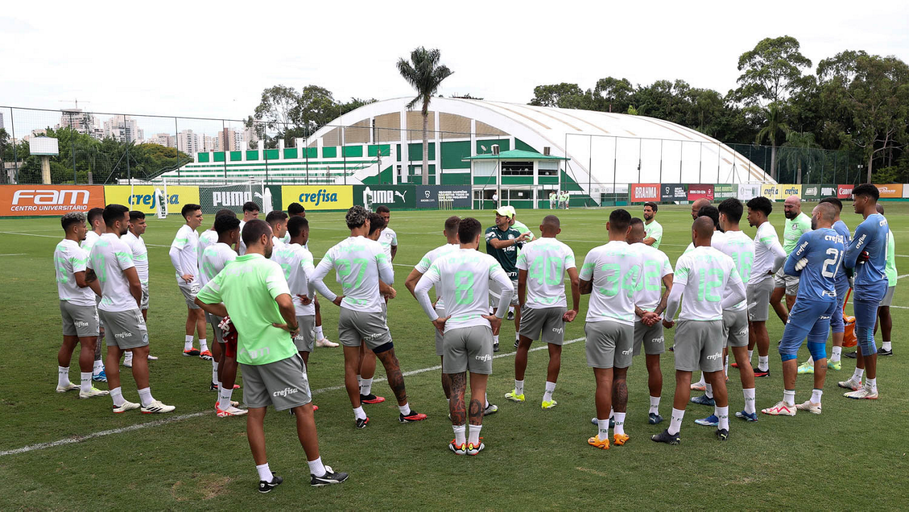 O técnico Abel Ferreira, da SE Palmeiras, conversa com o elenco durante treinamento, na Academia de Futebol. (Foto: Cesar Greco/Palmeiras/by Canon)