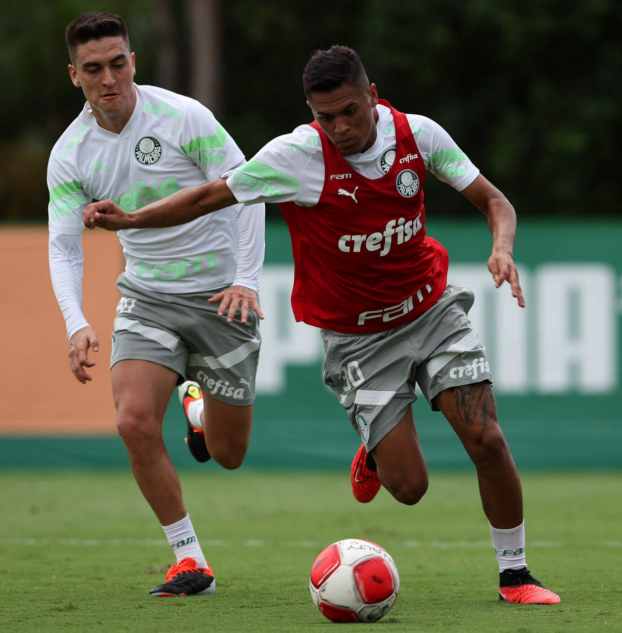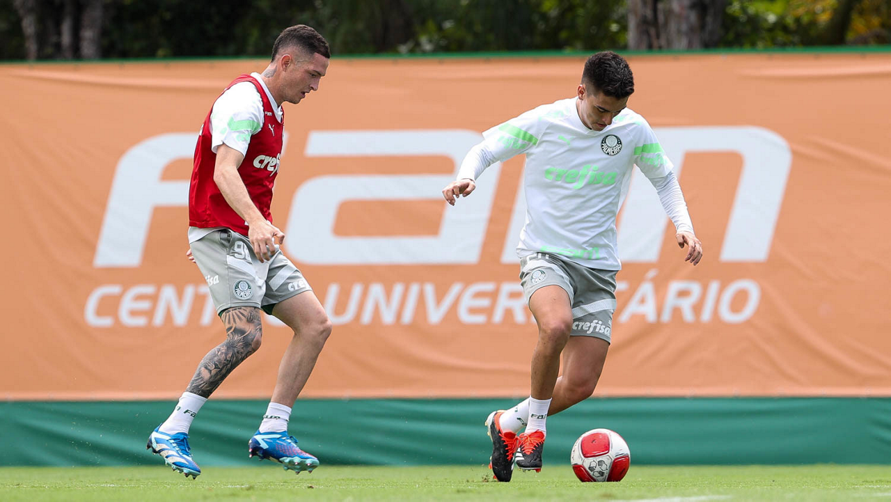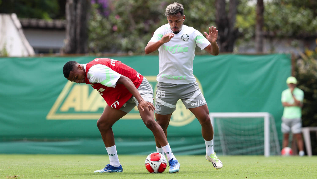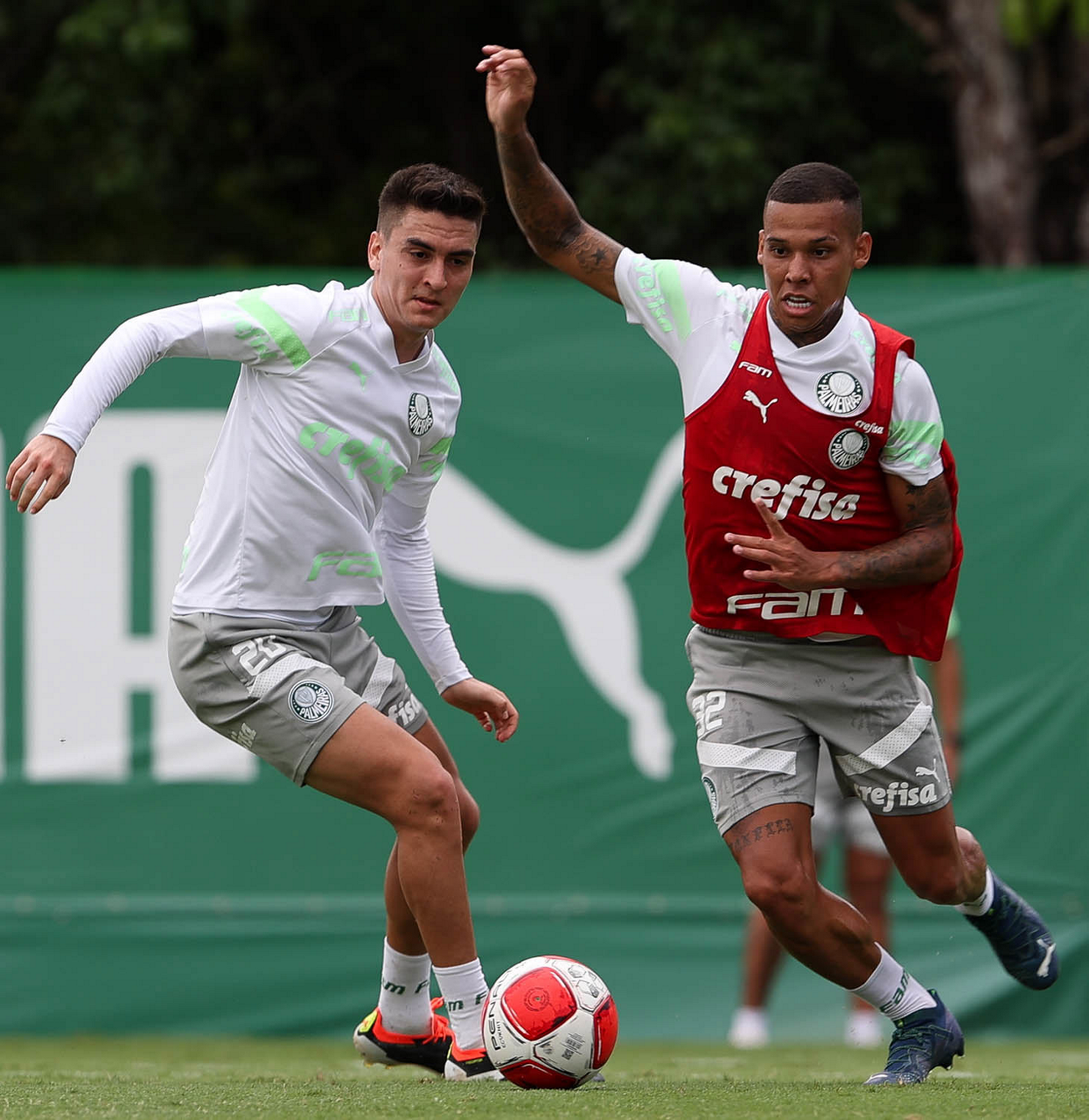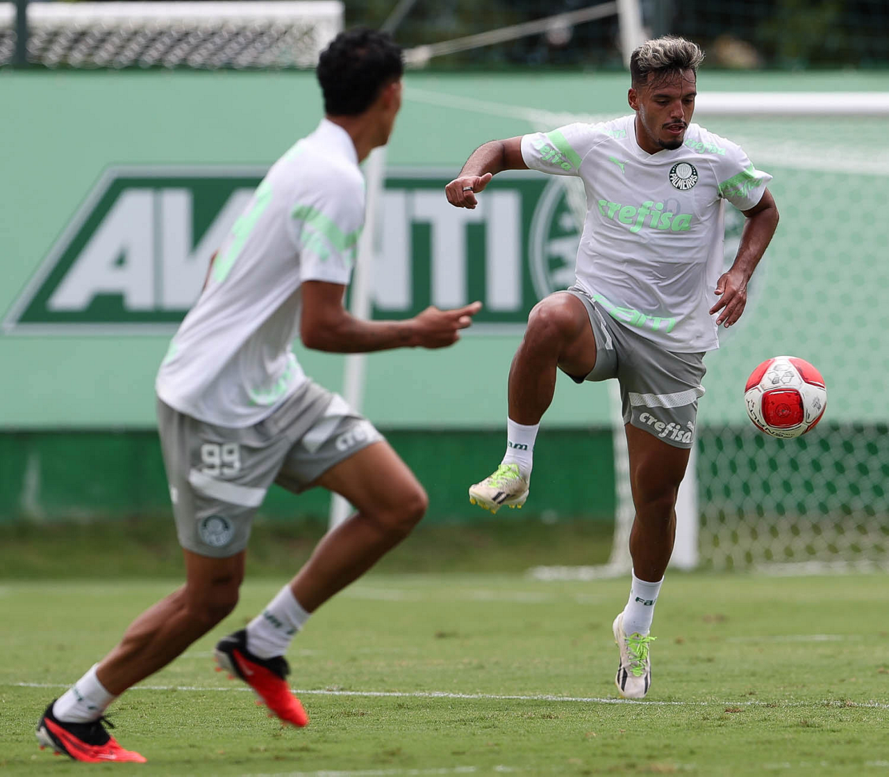 O jogador Gabriel Menino (D), da SE Palmeiras, durante treinamento, na Academia de Futebol. (Foto: Cesar Greco/Palmeiras/by Canon)