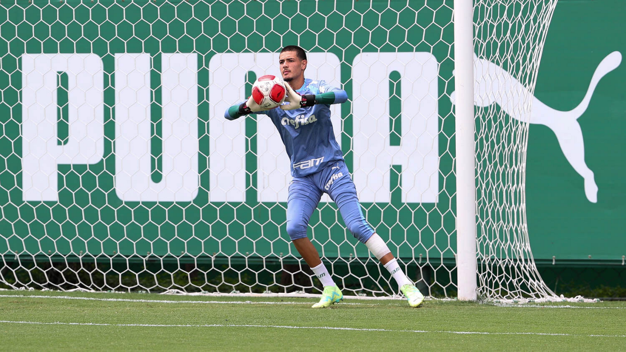 O goleiro Mateus, da SE Palmeiras, durante treinamento, na Academia de Futebol. (Foto: Cesar Greco/Palmeiras/by Canon)