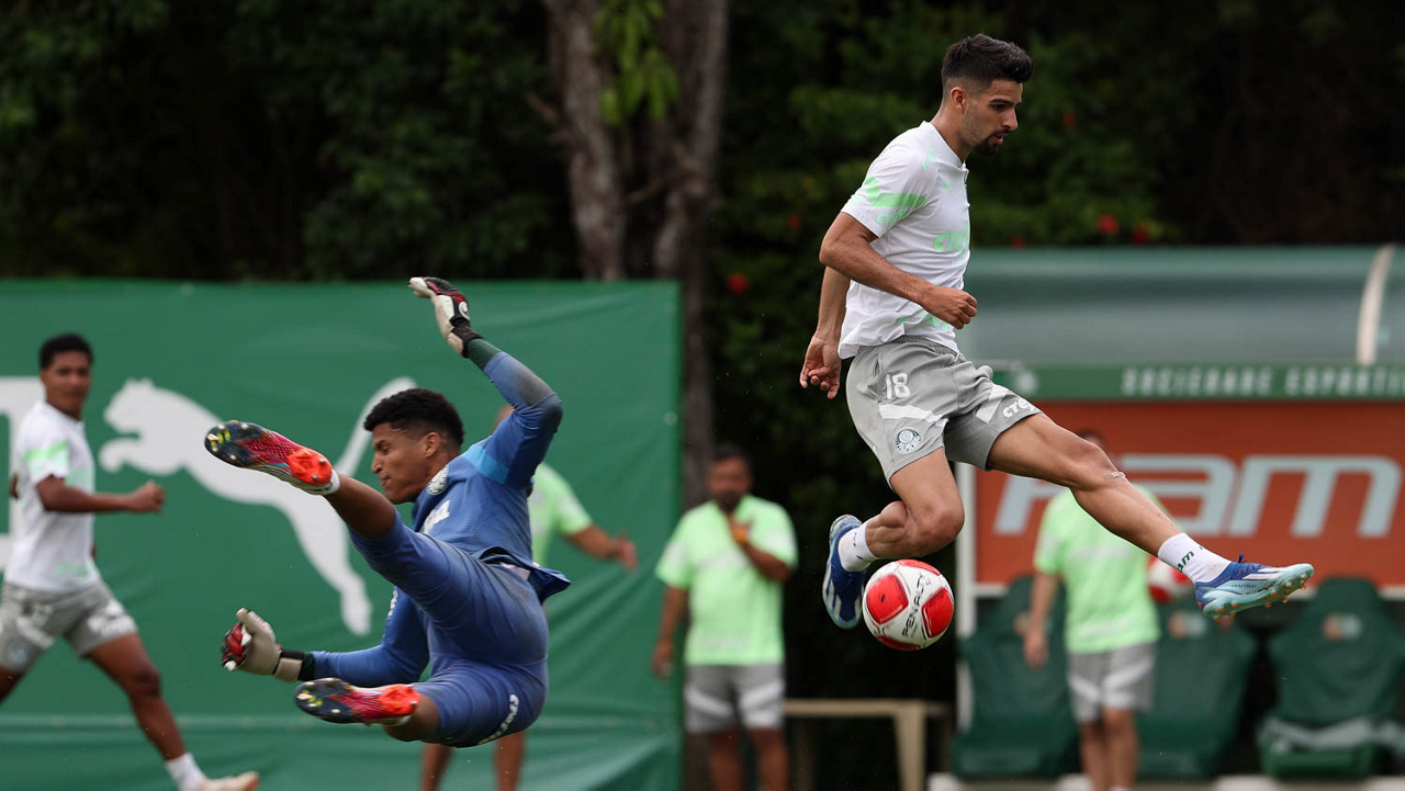 O jogador Fabinho (D), da SE Palmeiras, durante treinamento, na Academia de Futebol. (Foto: Cesar Greco/Palmeiras/by Canon)