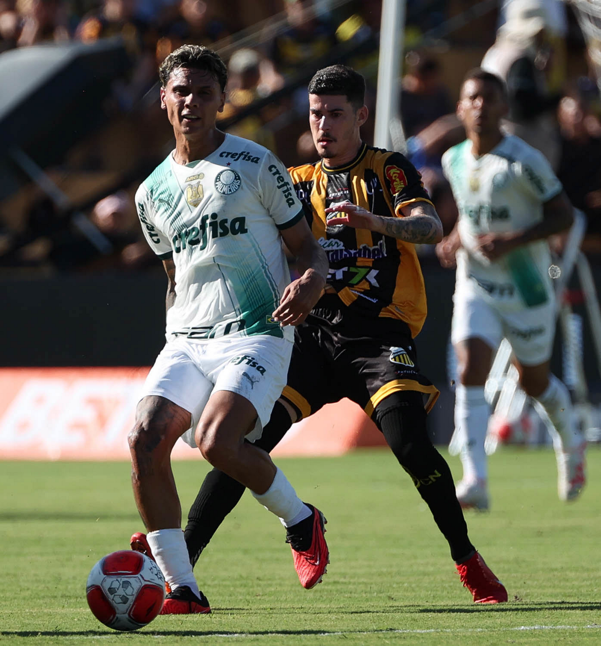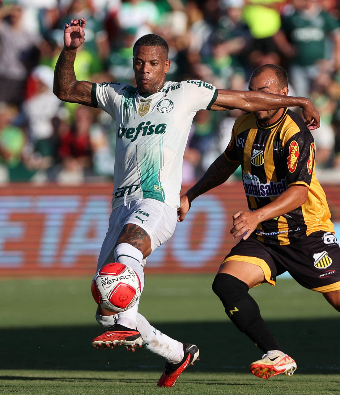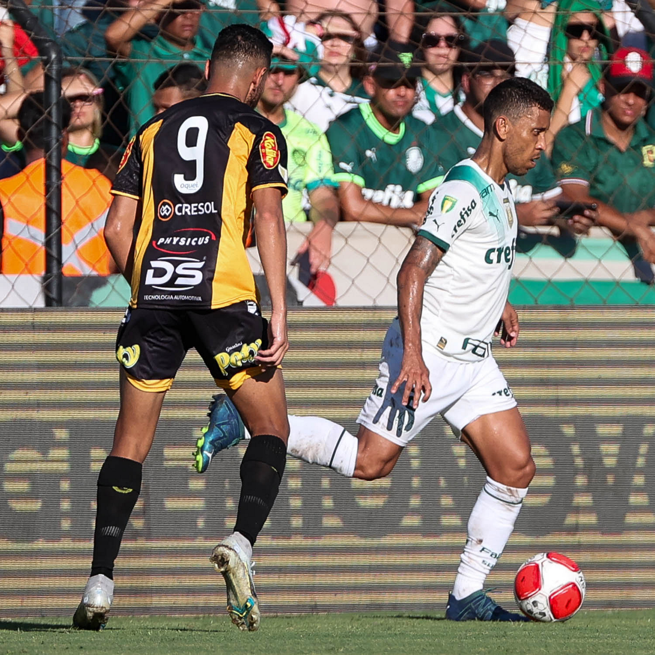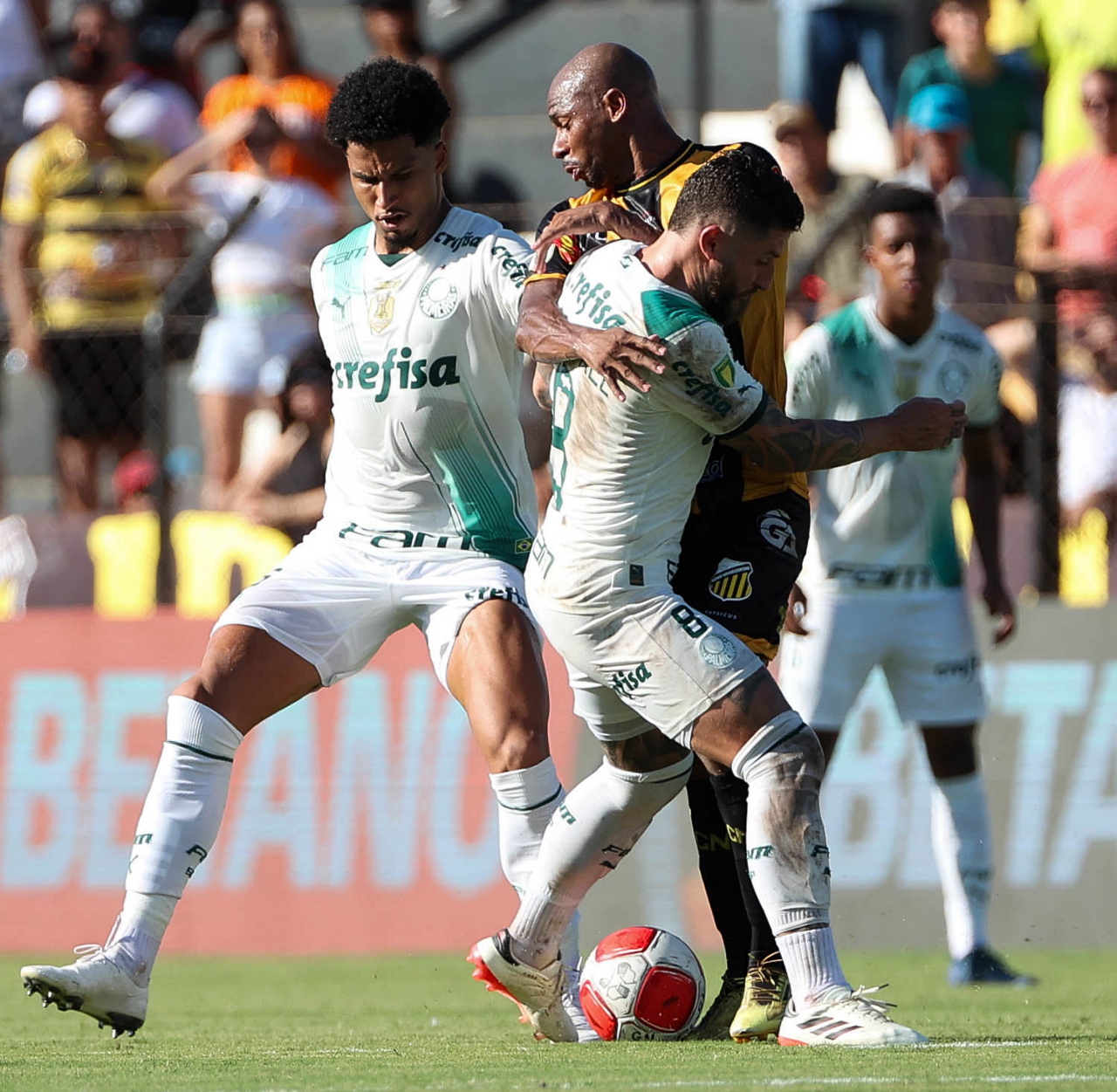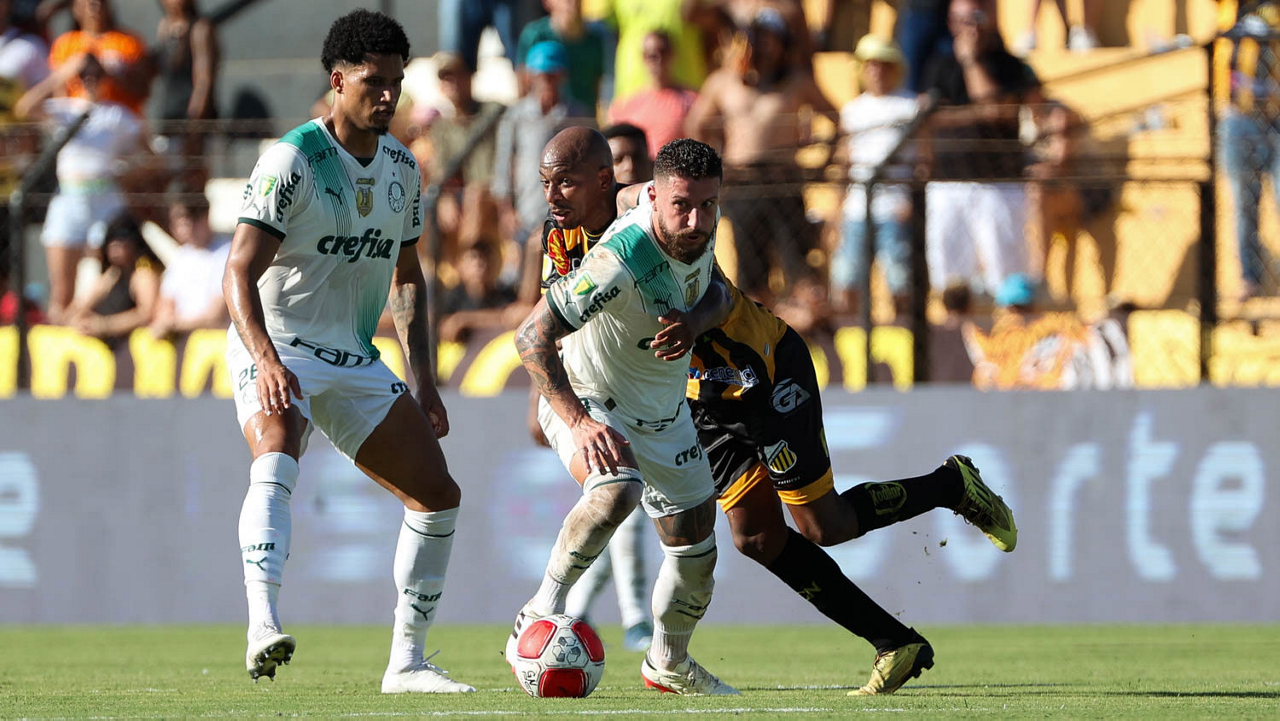 Os jogadores Murilo e Zé Rafael (D), da SE Palmeiras, disputam bola com o jogador do G Novorizontino, durante partida válida pela primeira rodada, do Campeonato Paulista, Série A1, no Estádio Dr. Jorge Ismael de Biasi. (Foto: Cesar Greco/Palmeiras/by Canon)