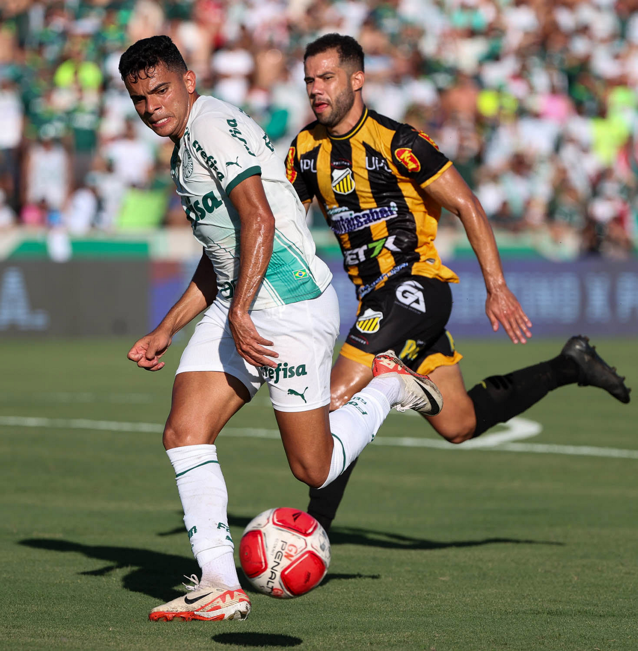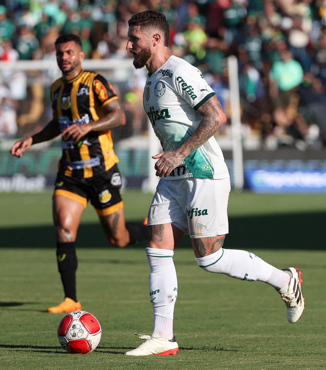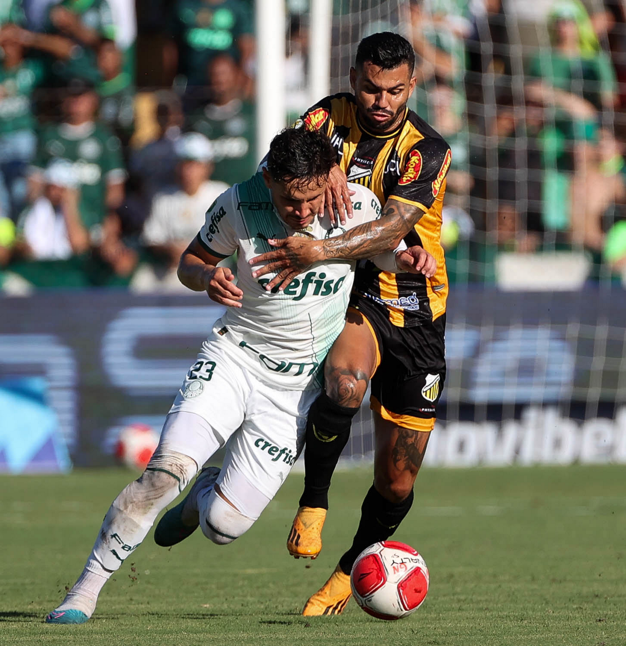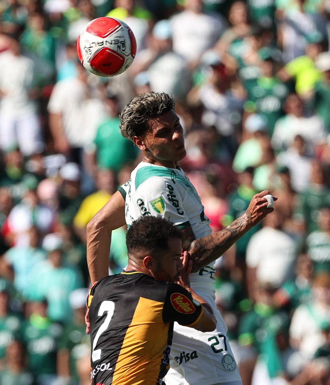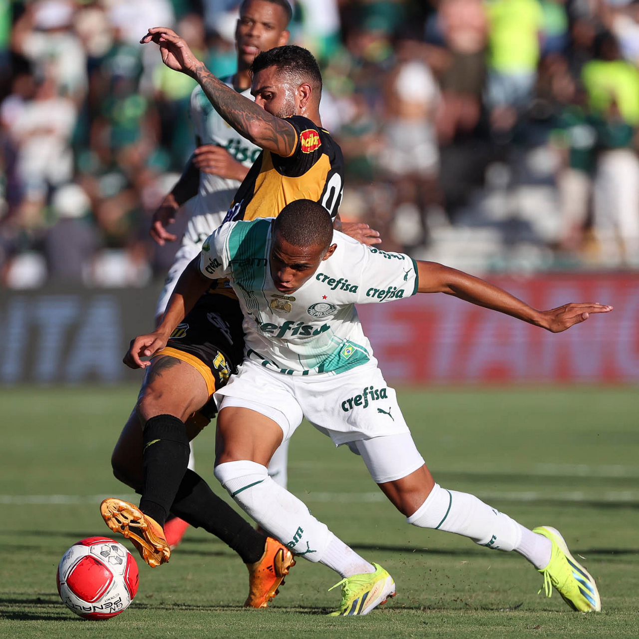 Os jogadores Murilo e Zé Rafael (D), da SE Palmeiras, disputam bola com o jogador do G Novorizontino, durante partida válida pela primeira rodada, do Campeonato Paulista, Série A1, no Estádio Dr. Jorge Ismael de Biasi. (Foto: Cesar Greco/Palmeiras/by Canon)