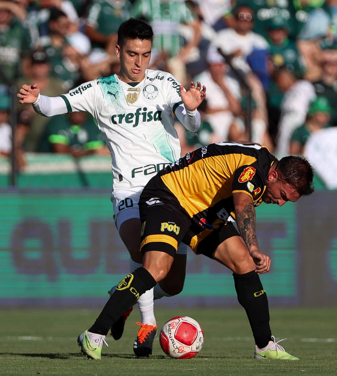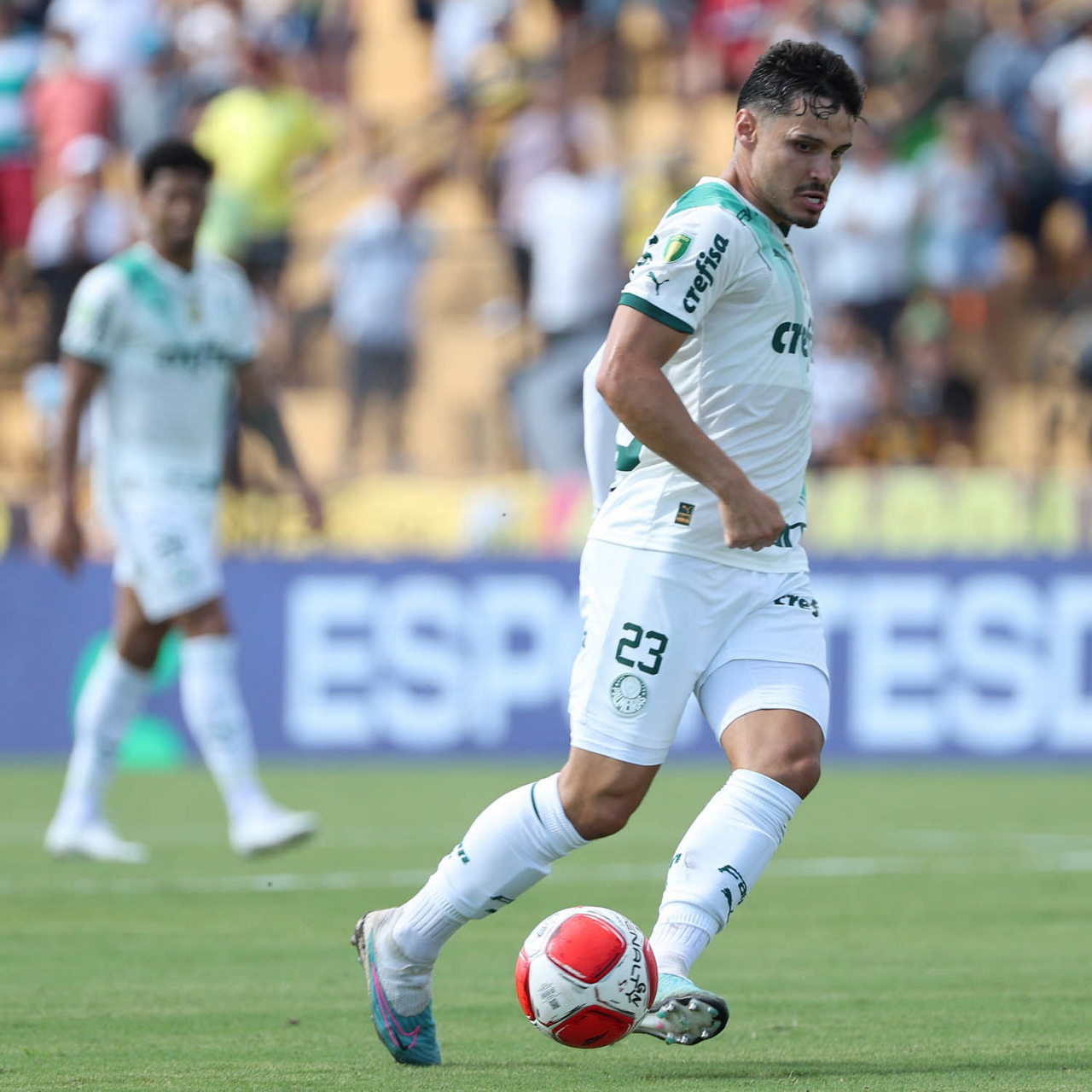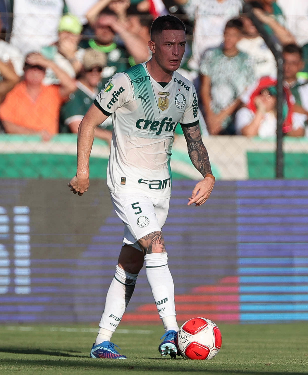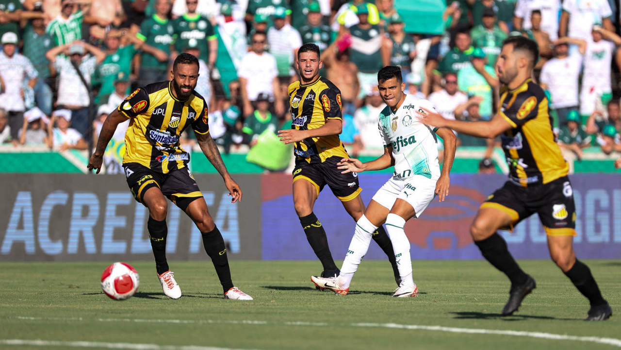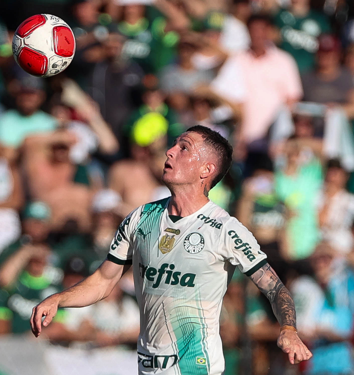 Os jogadores Murilo e Zé Rafael (D), da SE Palmeiras, disputam bola com o jogador do G Novorizontino, durante partida válida pela primeira rodada, do Campeonato Paulista, Série A1, no Estádio Dr. Jorge Ismael de Biasi. (Foto: Cesar Greco/Palmeiras/by Canon)
