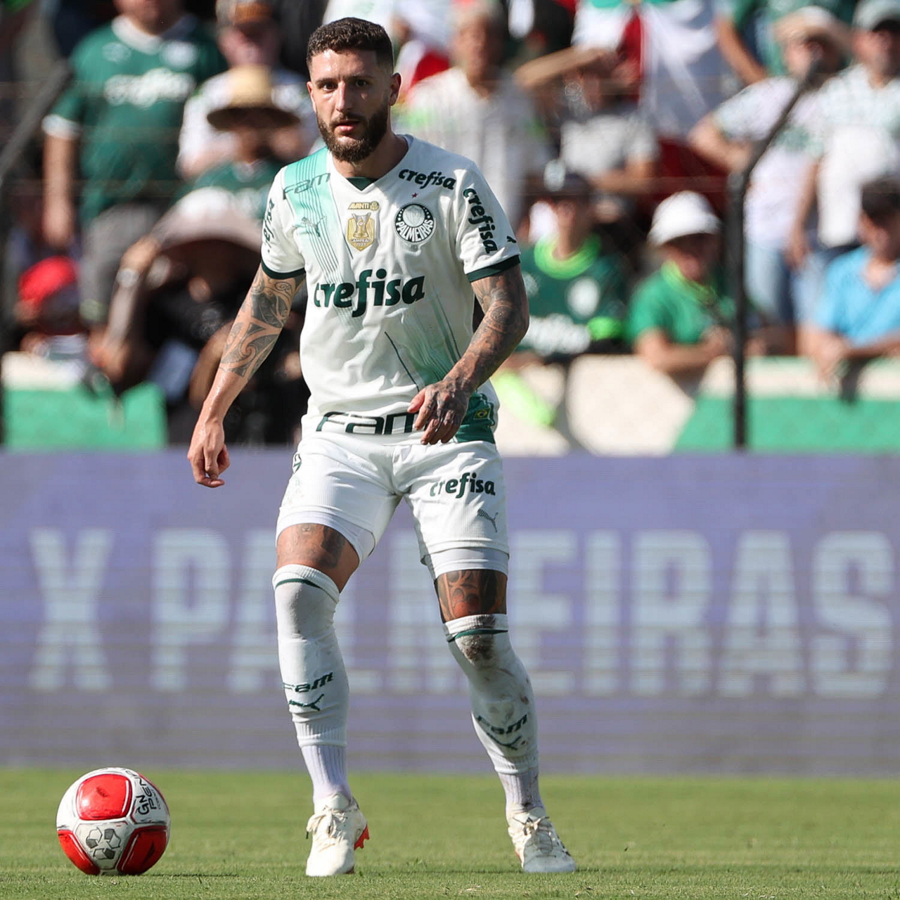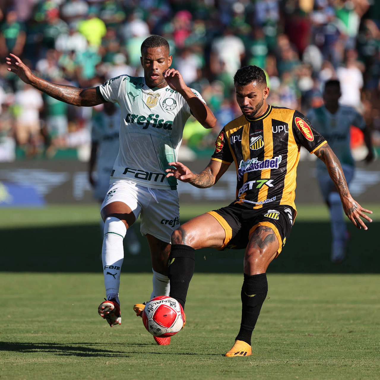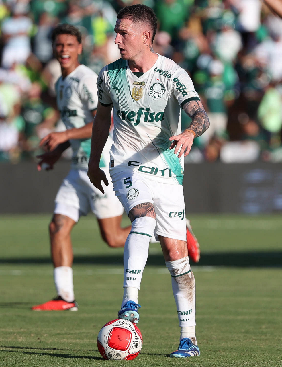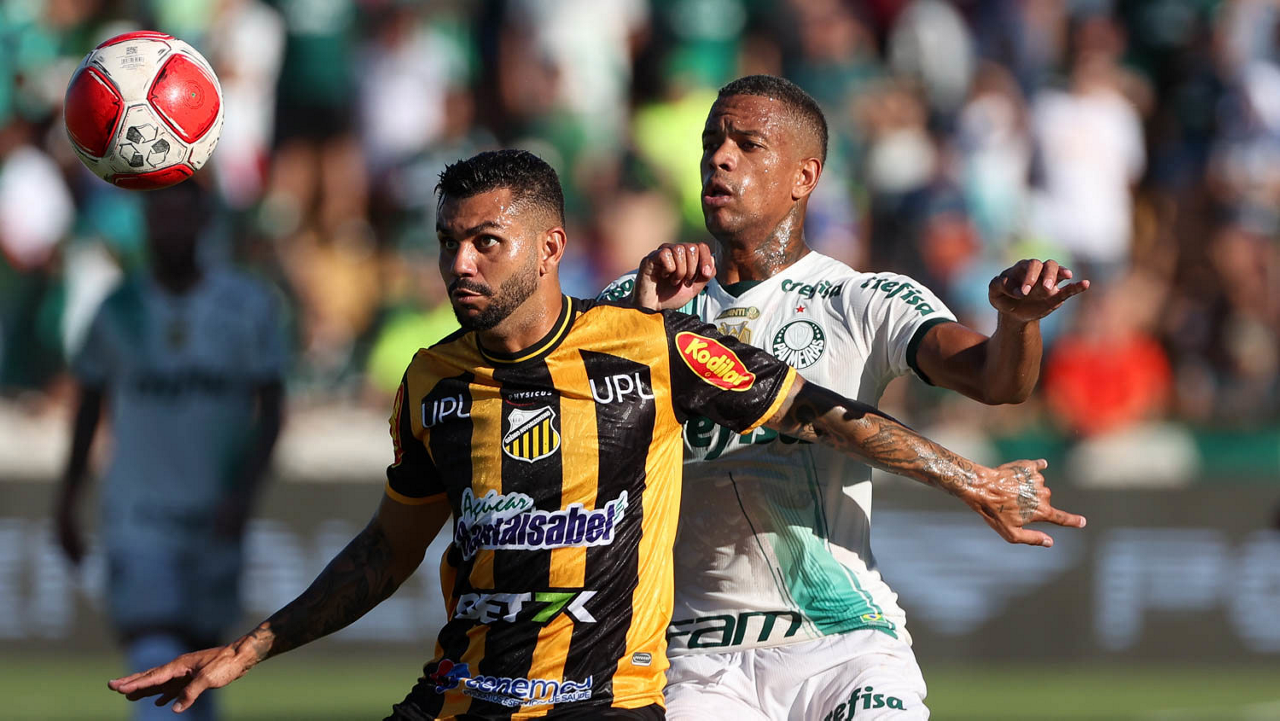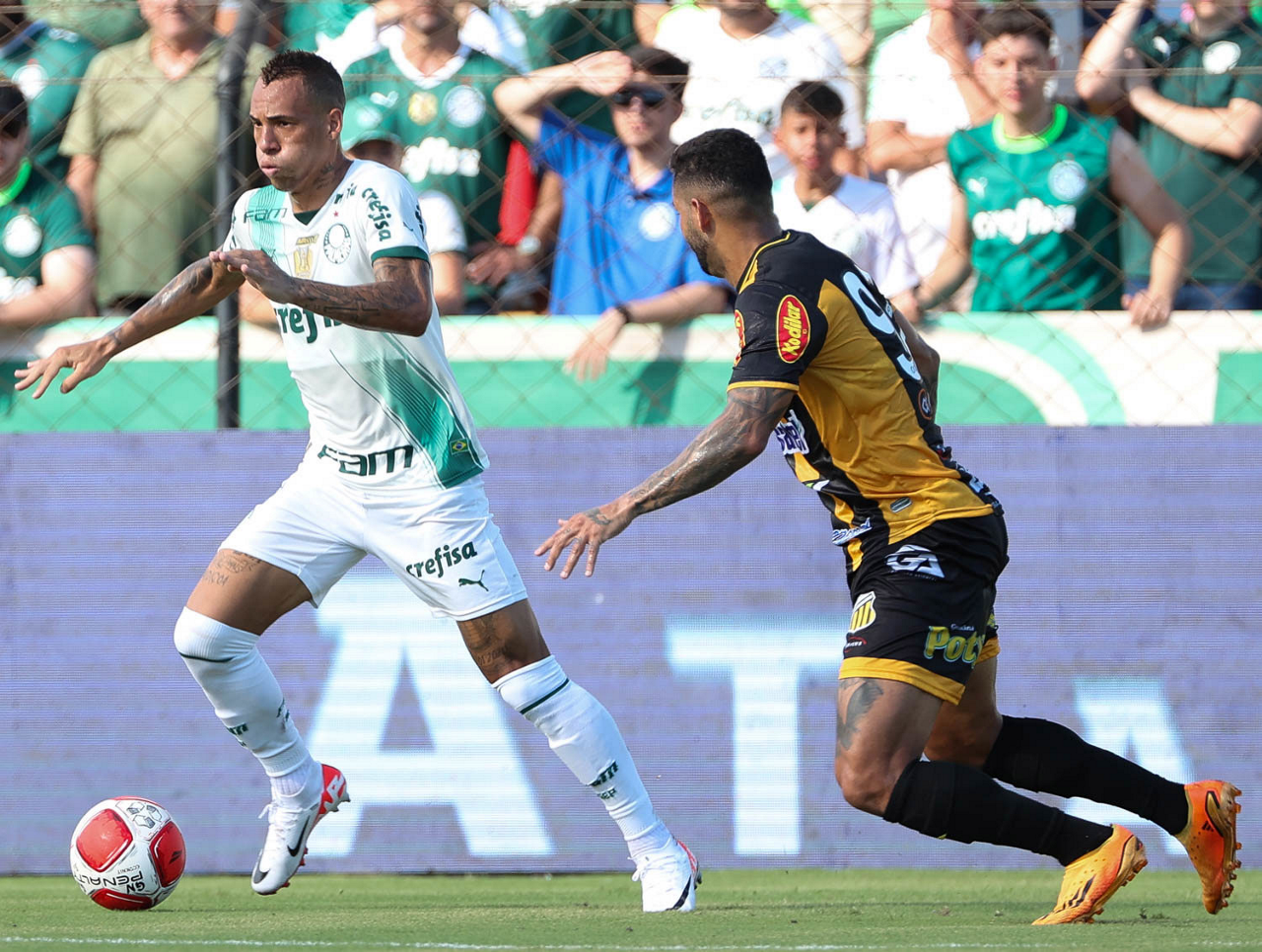 Os jogadores Murilo e Zé Rafael (D), da SE Palmeiras, disputam bola com o jogador do G Novorizontino, durante partida válida pela primeira rodada, do Campeonato Paulista, Série A1, no Estádio Dr. Jorge Ismael de Biasi. (Foto: Cesar Greco/Palmeiras/by Canon)