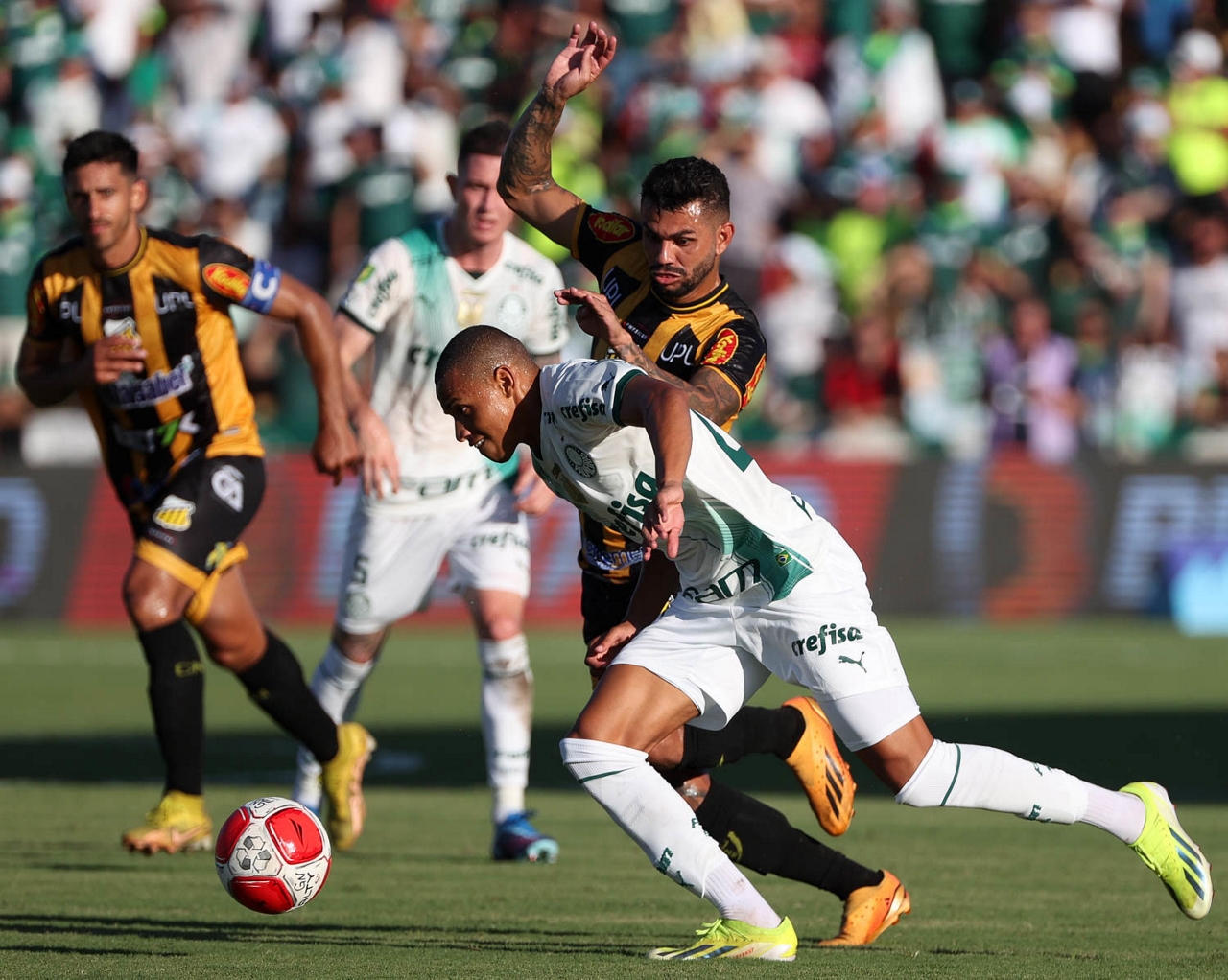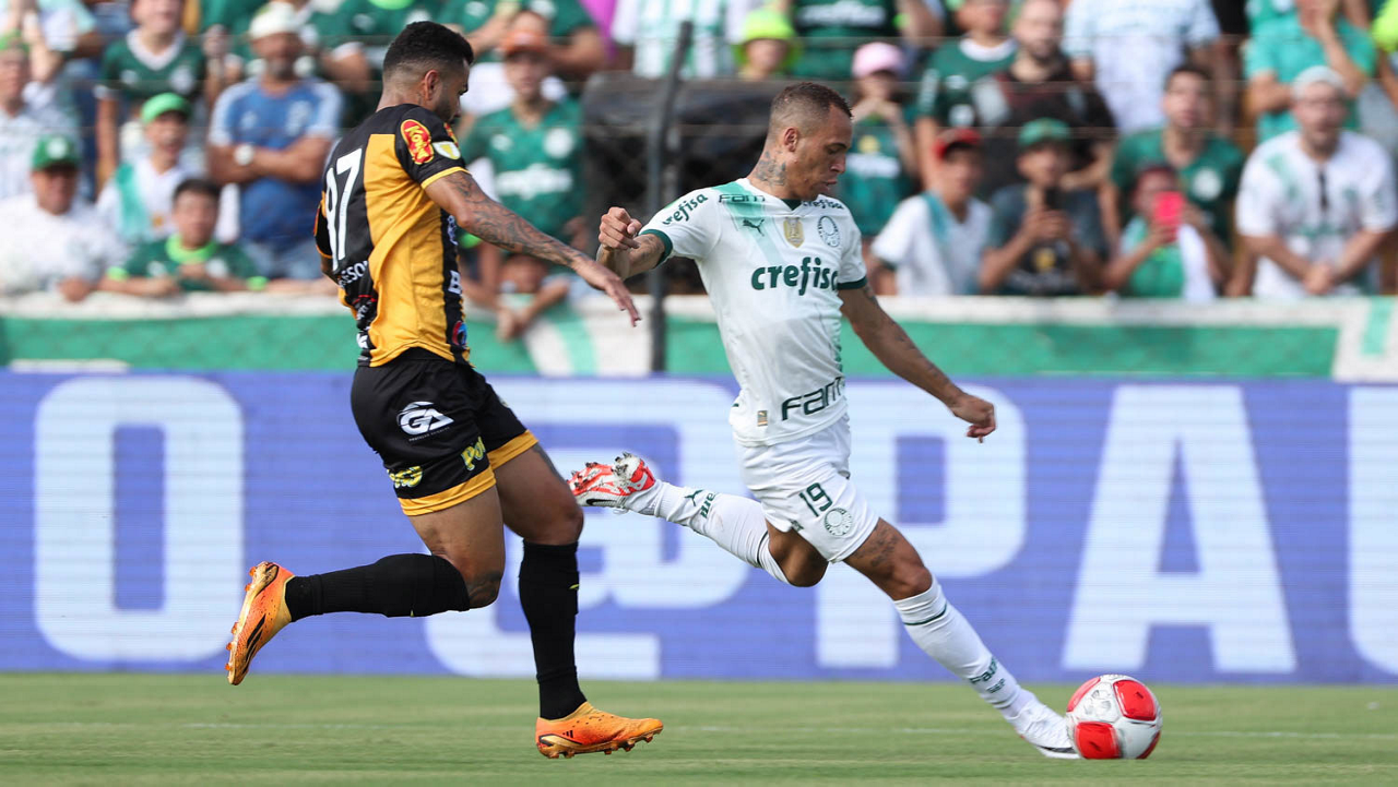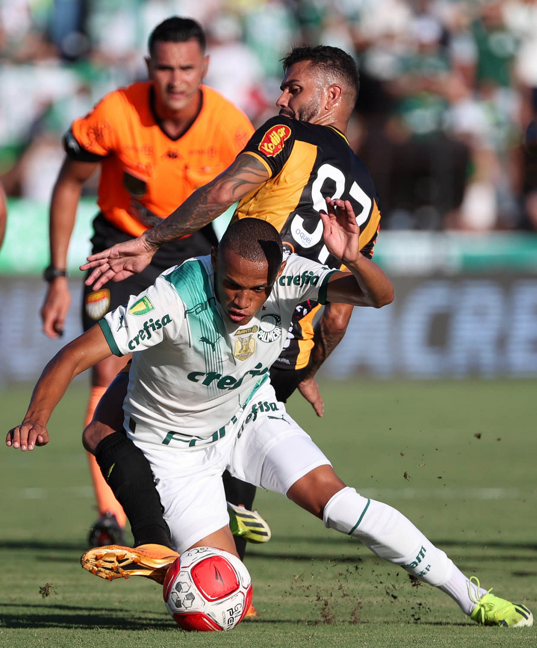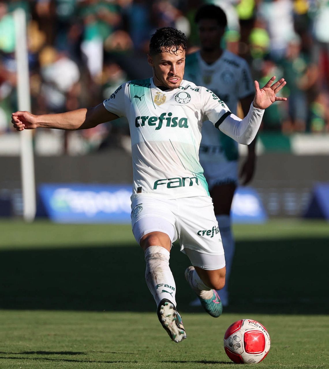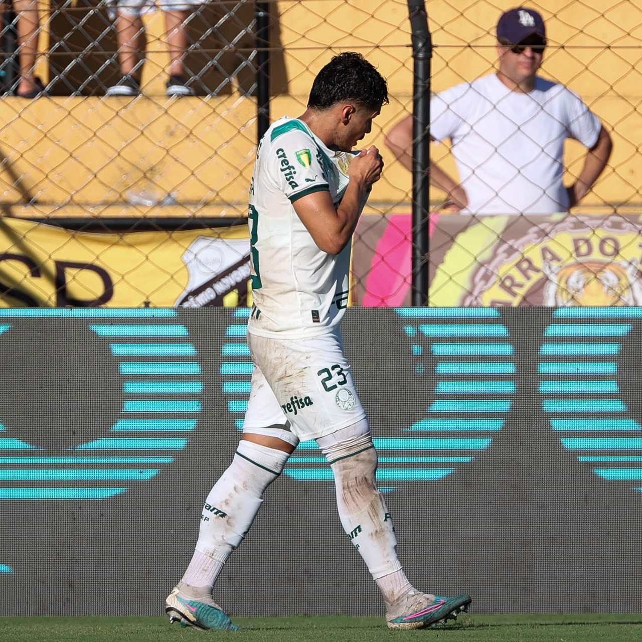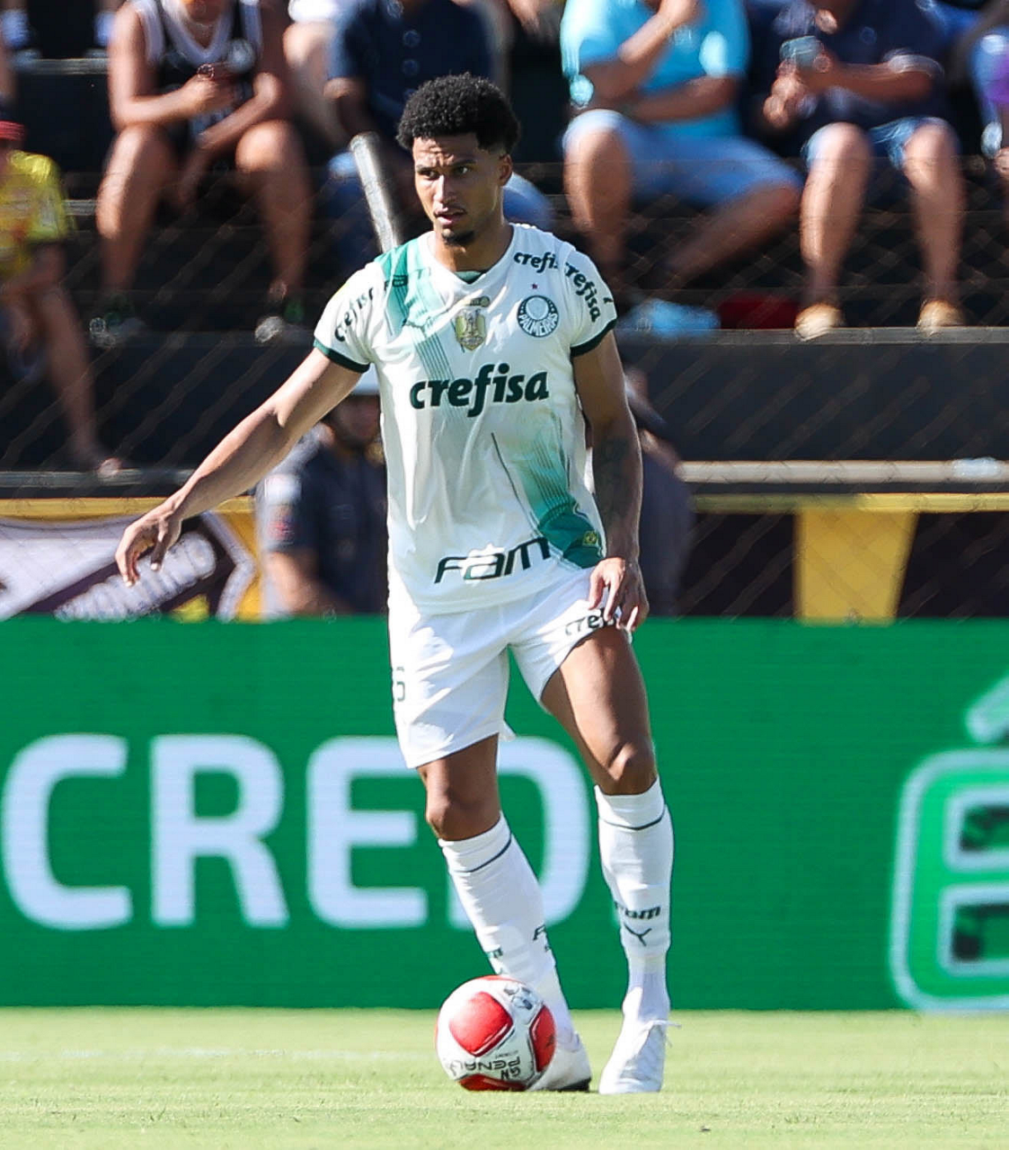 Os jogadores Murilo e Zé Rafael (D), da SE Palmeiras, disputam bola com o jogador do G Novorizontino, durante partida válida pela primeira rodada, do Campeonato Paulista, Série A1, no Estádio Dr. Jorge Ismael de Biasi. (Foto: Cesar Greco/Palmeiras/by Canon)