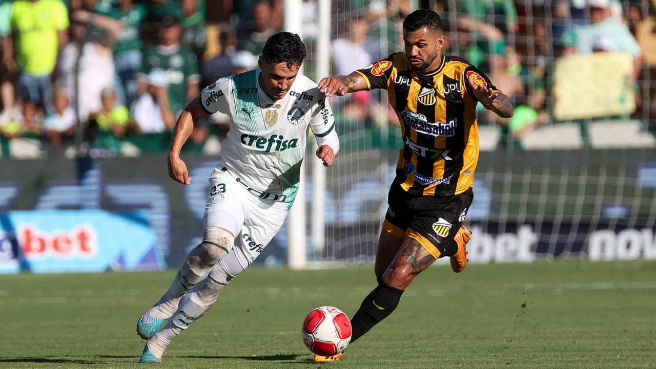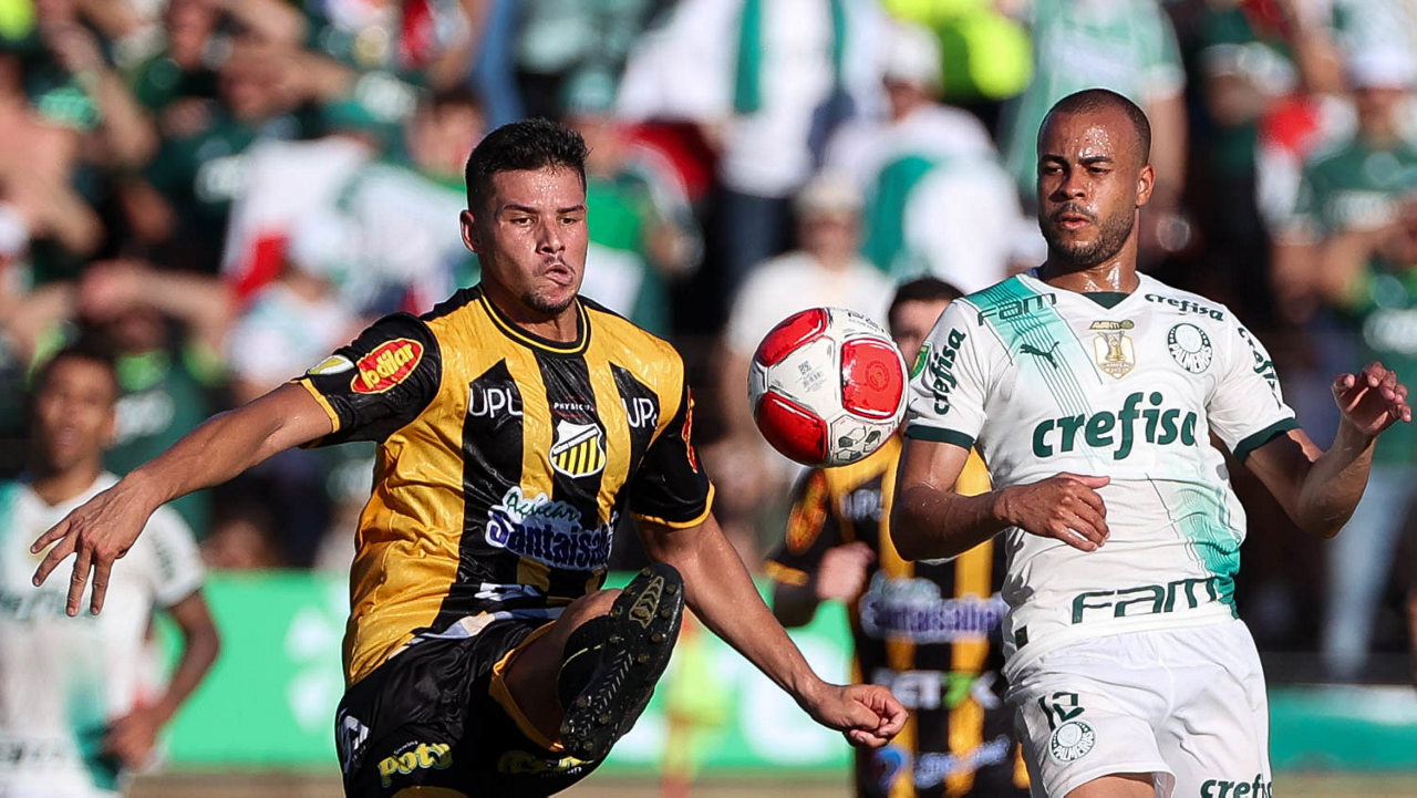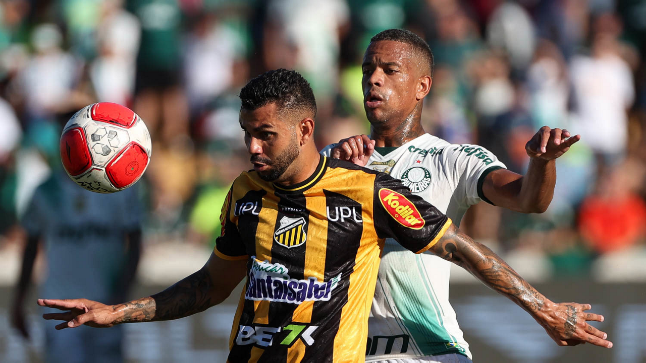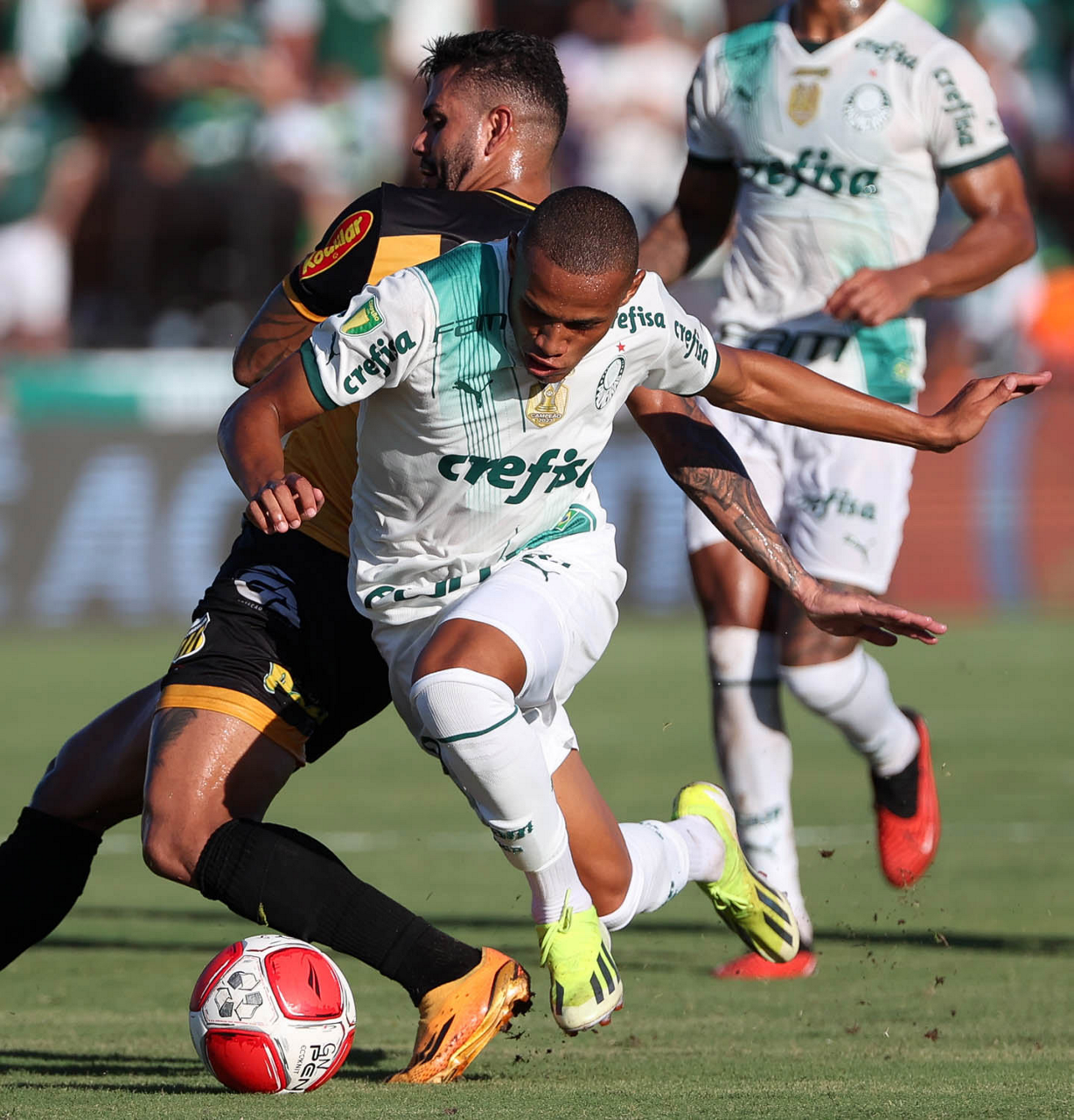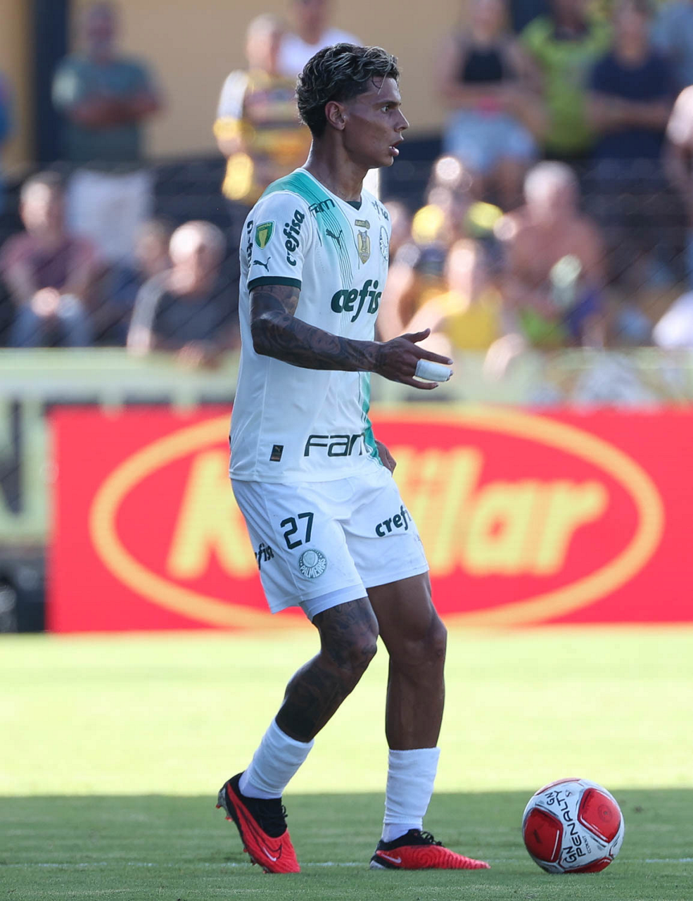 Os jogadores Murilo e Zé Rafael (D), da SE Palmeiras, disputam bola com o jogador do G Novorizontino, durante partida válida pela primeira rodada, do Campeonato Paulista, Série A1, no Estádio Dr. Jorge Ismael de Biasi. (Foto: Cesar Greco/Palmeiras/by Canon)