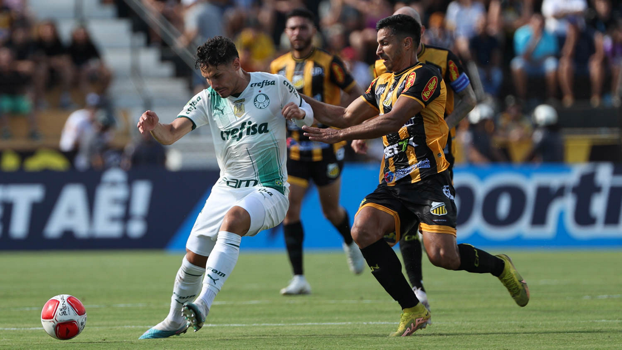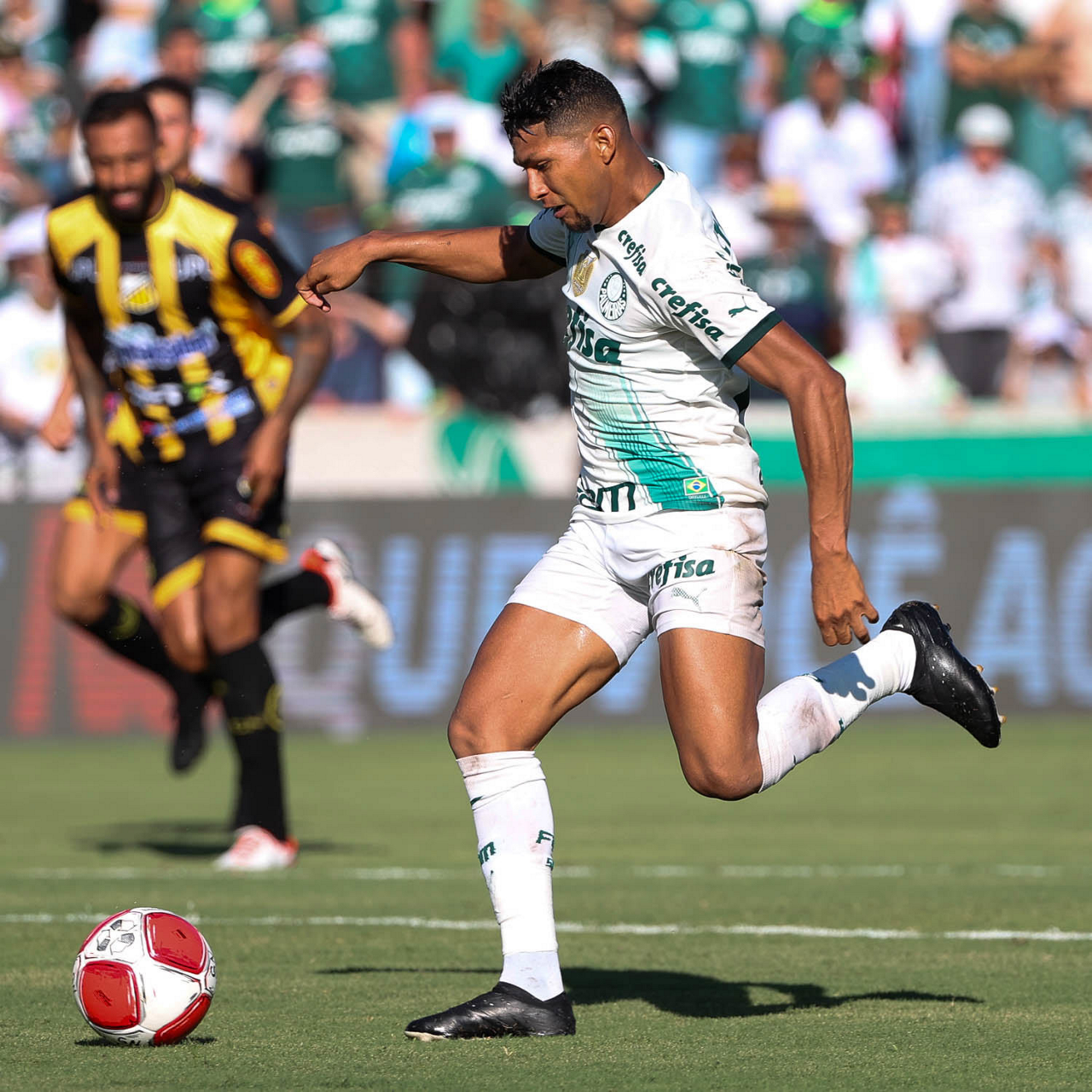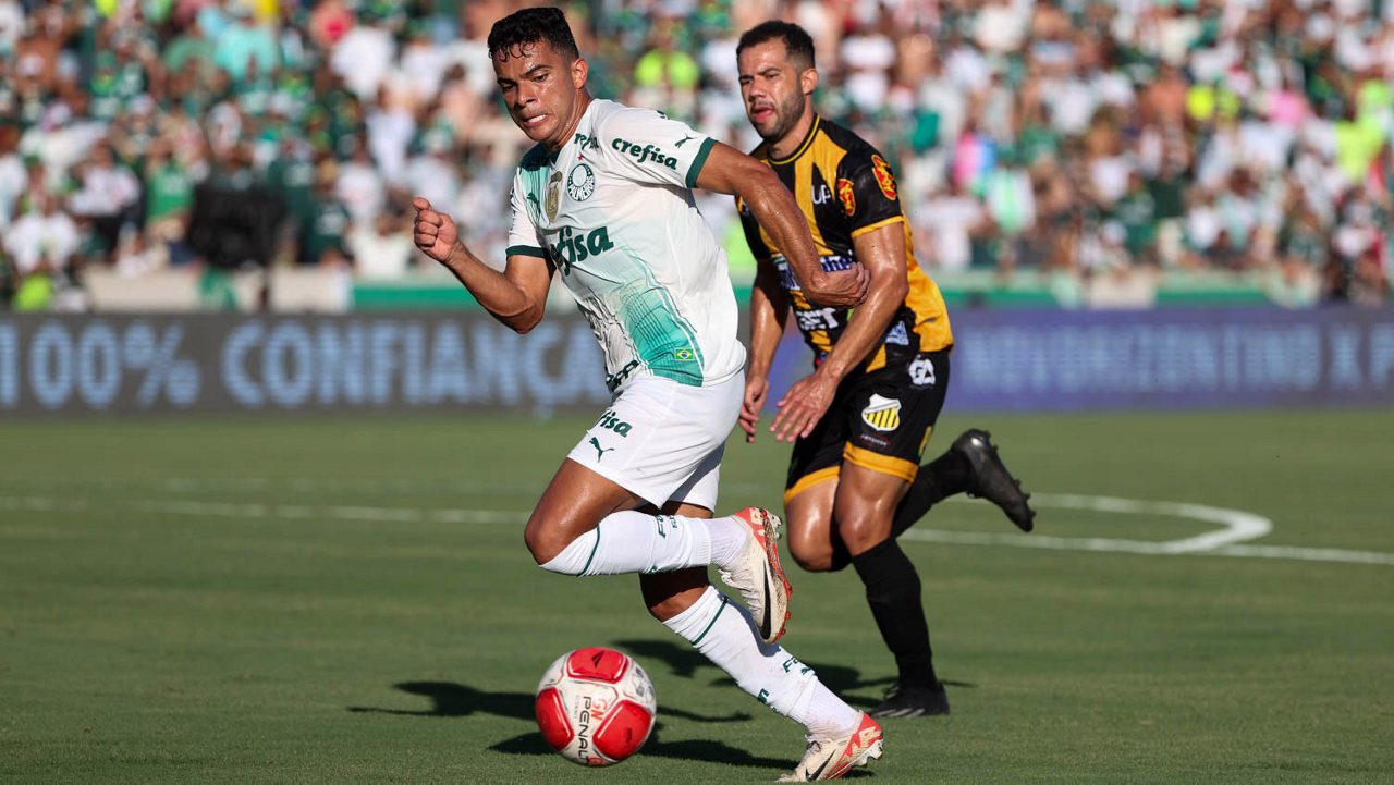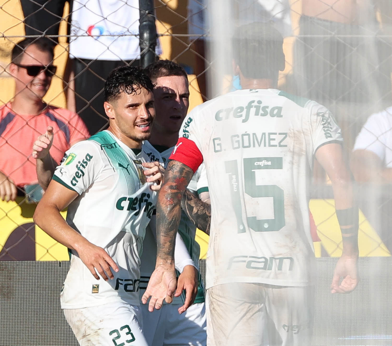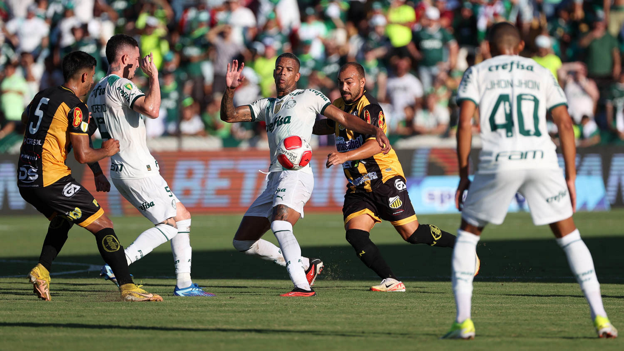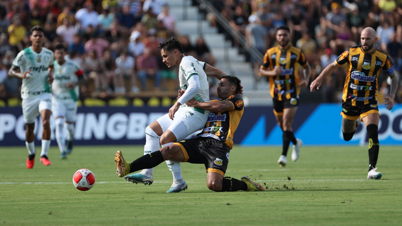 Os jogadores Murilo e Zé Rafael (D), da SE Palmeiras, disputam bola com o jogador do G Novorizontino, durante partida válida pela primeira rodada, do Campeonato Paulista, Série A1, no Estádio Dr. Jorge Ismael de Biasi. (Foto: Cesar Greco/Palmeiras/by Canon)