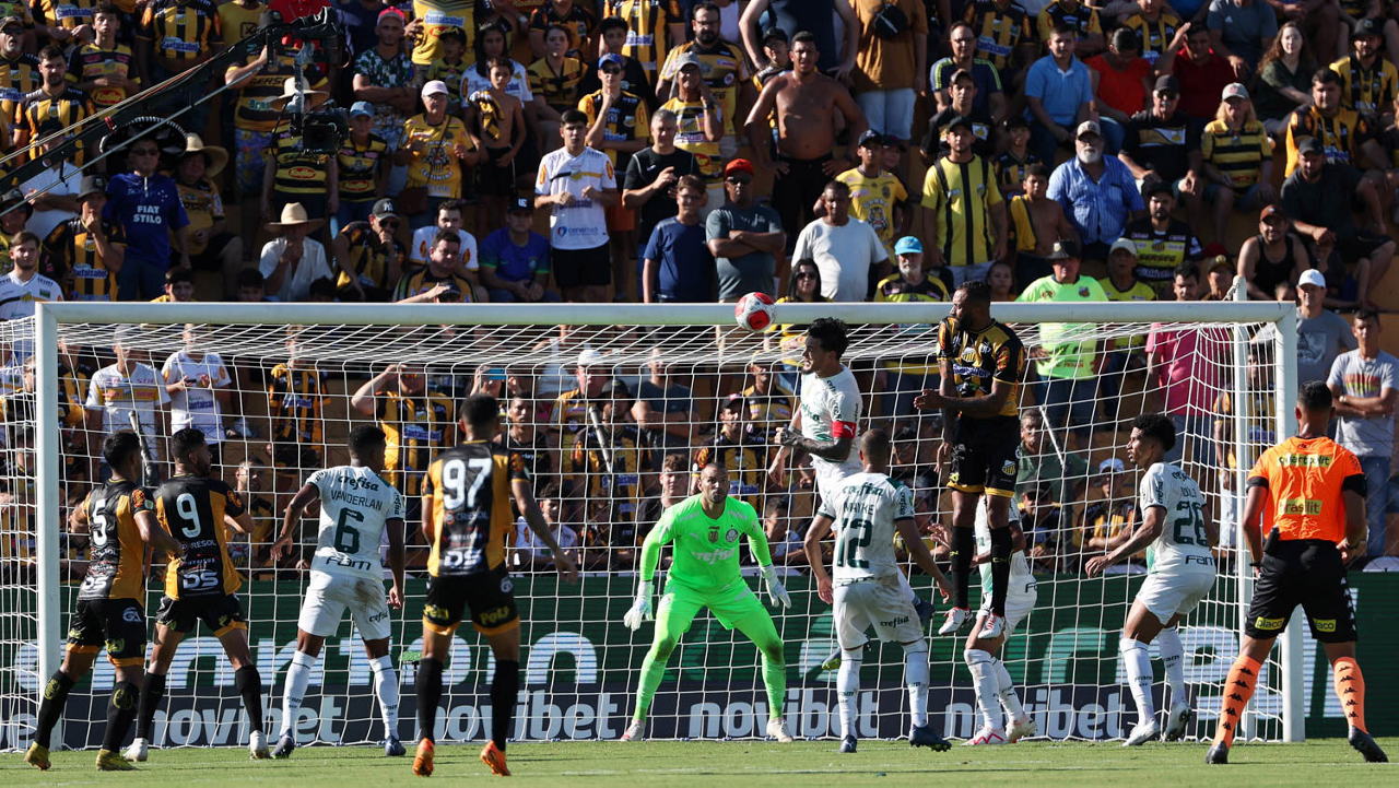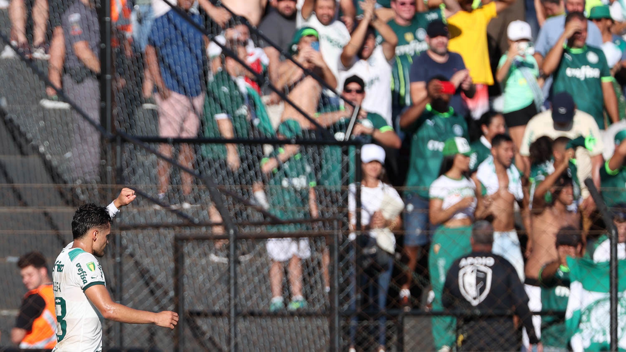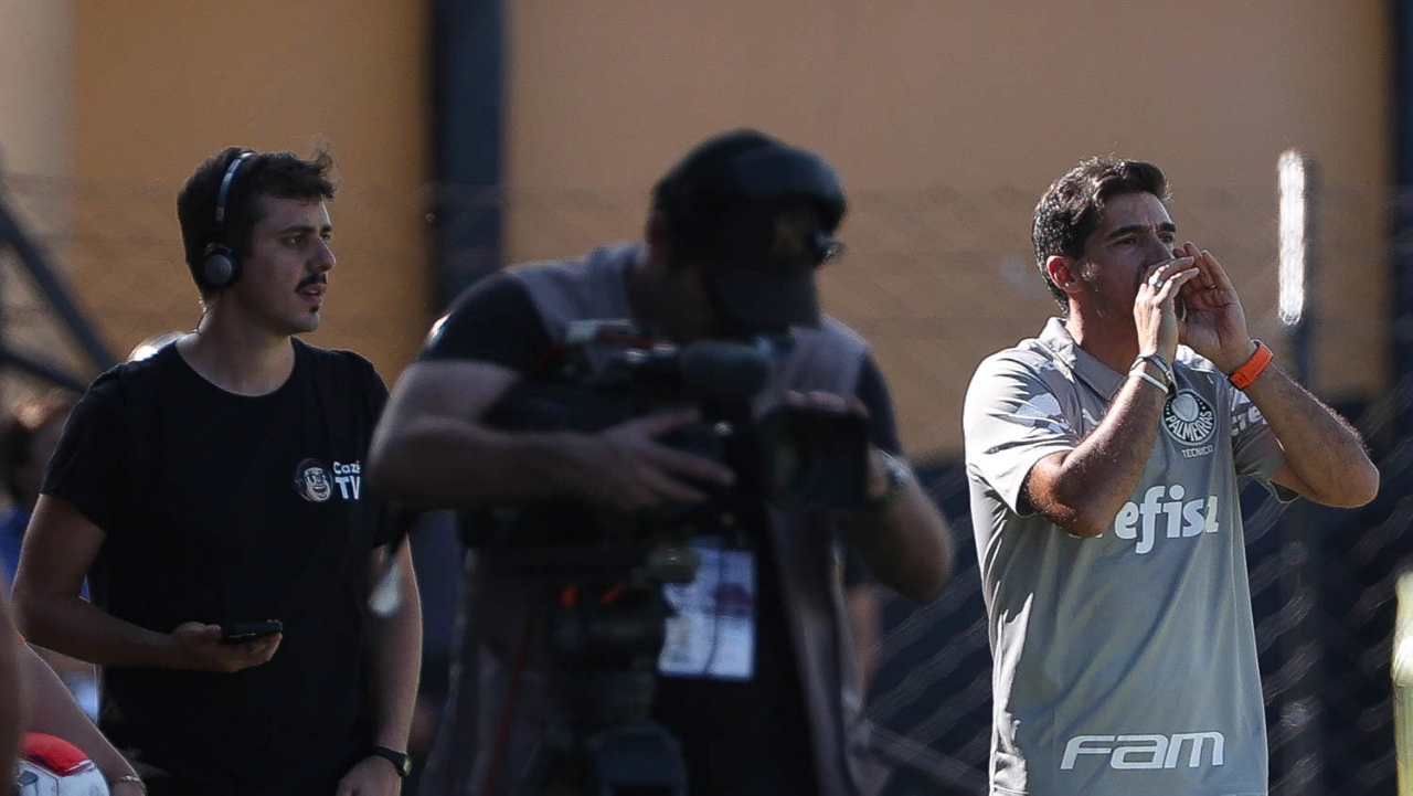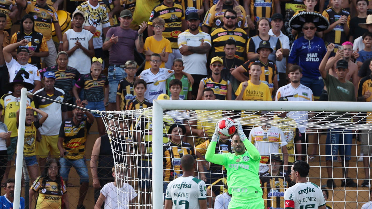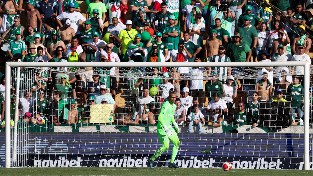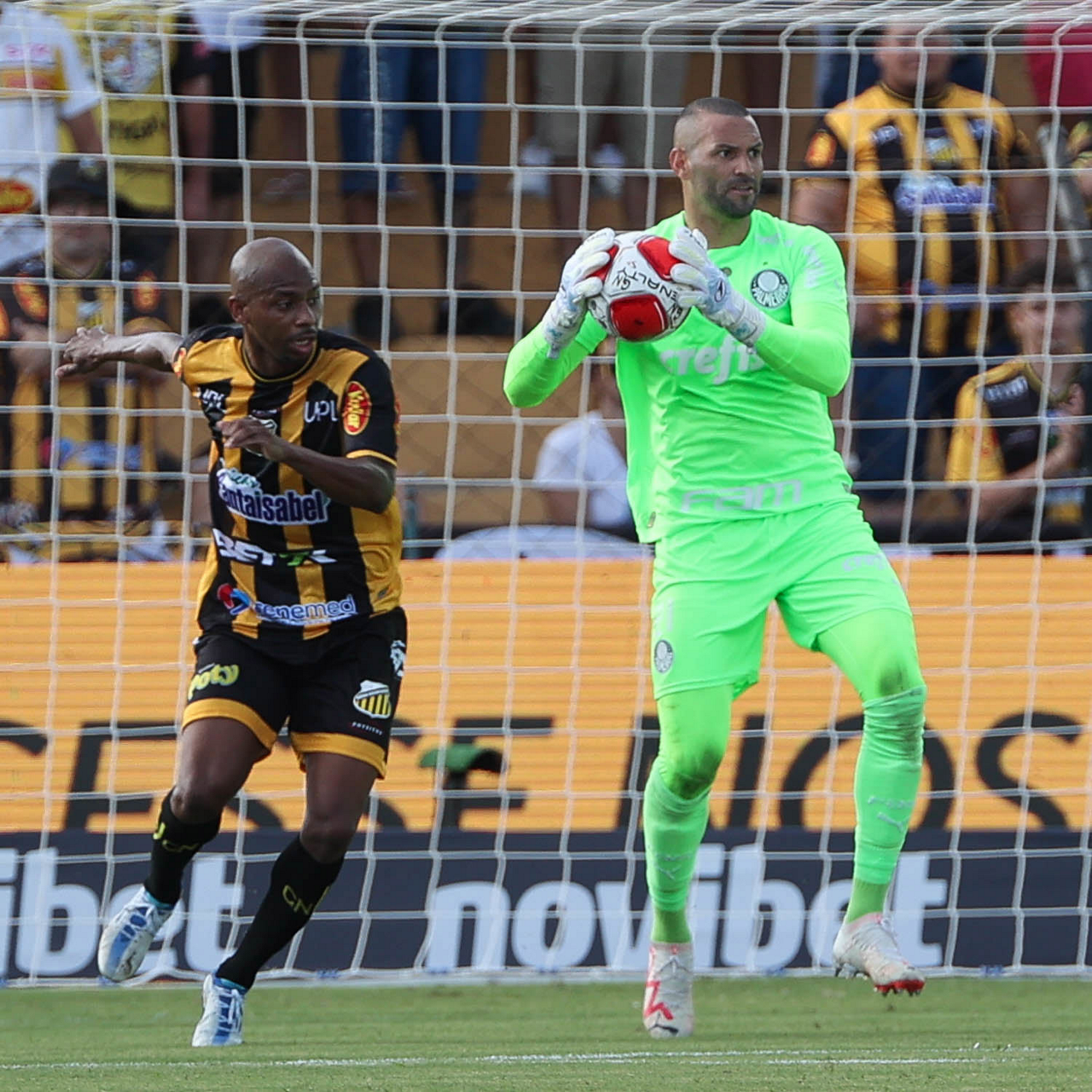 Os jogadores Murilo e Zé Rafael (D), da SE Palmeiras, disputam bola com o jogador do G Novorizontino, durante partida válida pela primeira rodada, do Campeonato Paulista, Série A1, no Estádio Dr. Jorge Ismael de Biasi. (Foto: Cesar Greco/Palmeiras/by Canon)