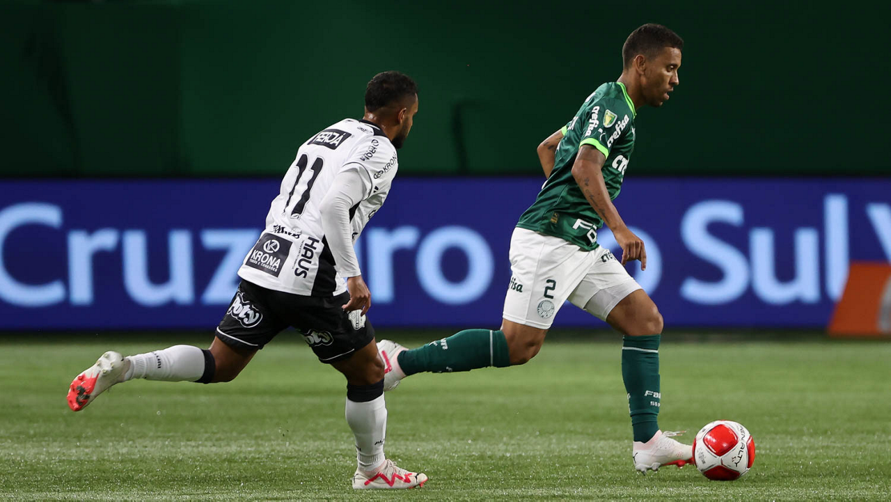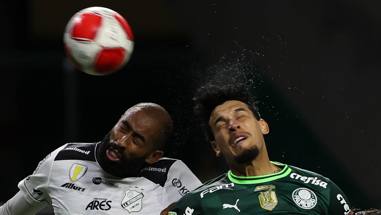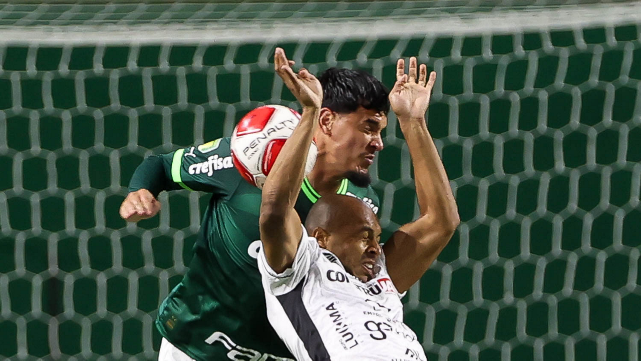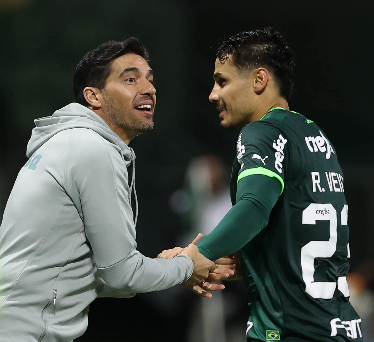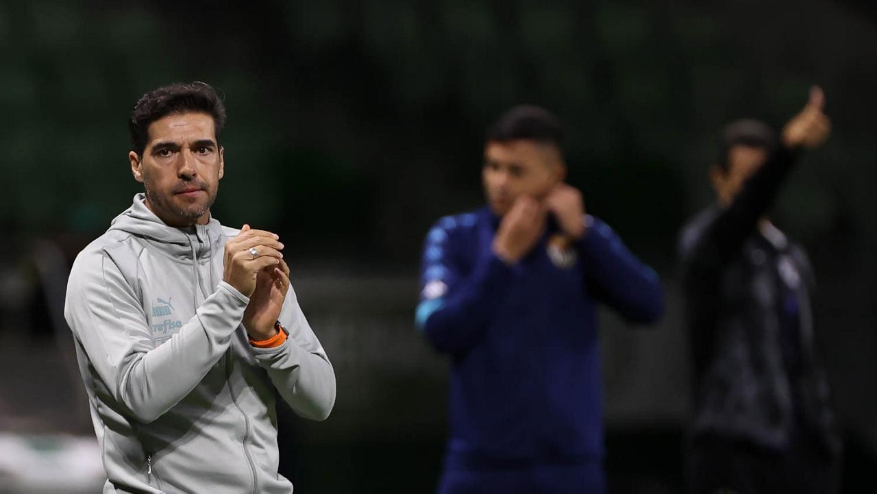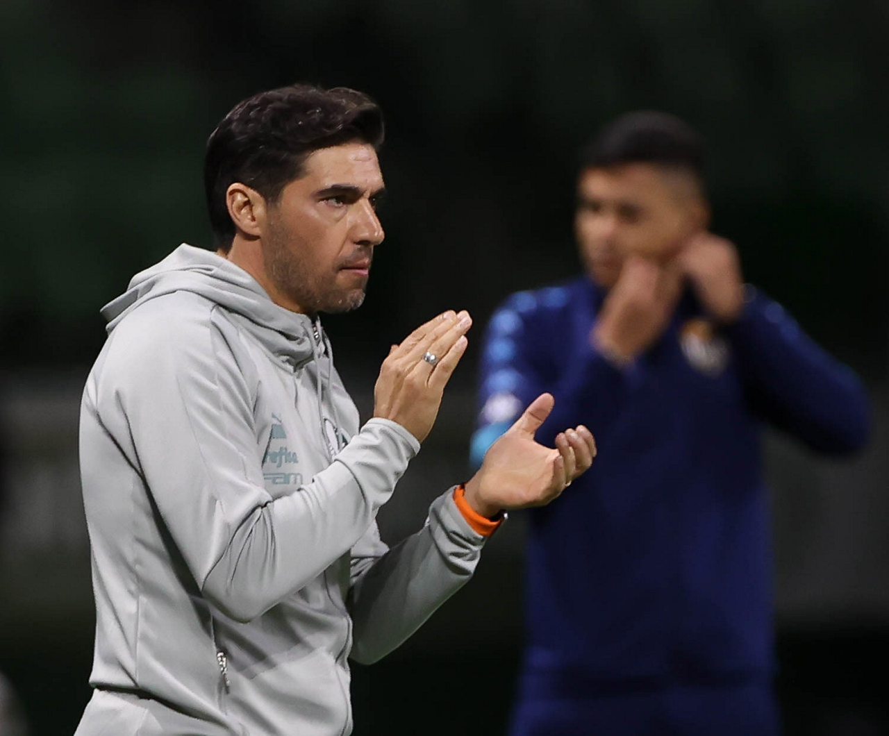 O técnico Abel Ferreira e o jogador Gustavo Gómez (D), da SE Palmeiras, em jogo contra a equipe da AA Internacional - Limeira, durante partida válida pela segunda rodada, do Campeonato Paulista, Série A1, na arena Allianz Parque. (Foto: Cesar Greco/Palmeiras/by Canon)