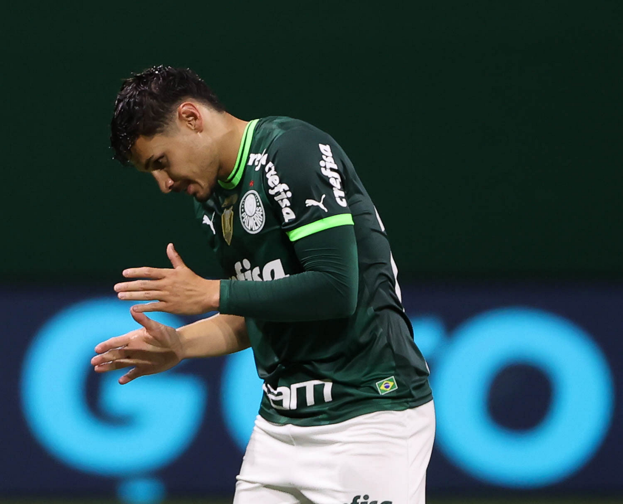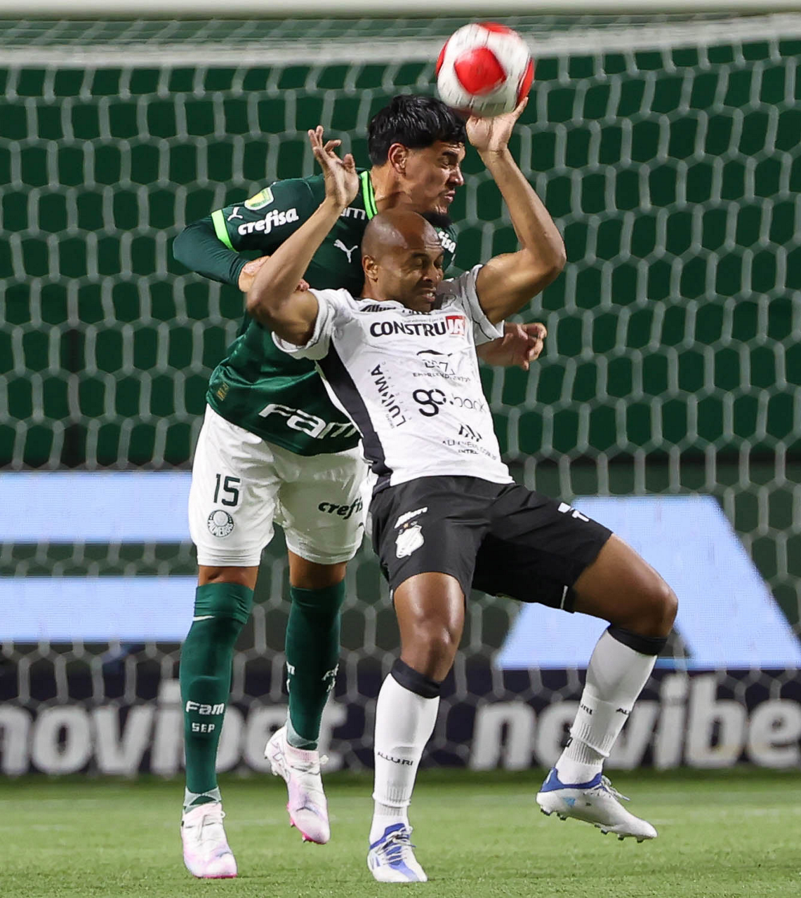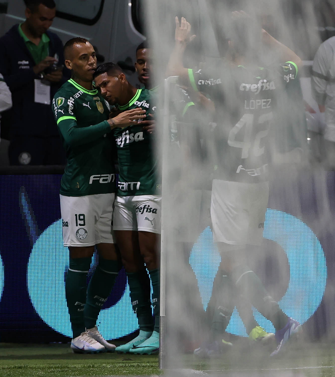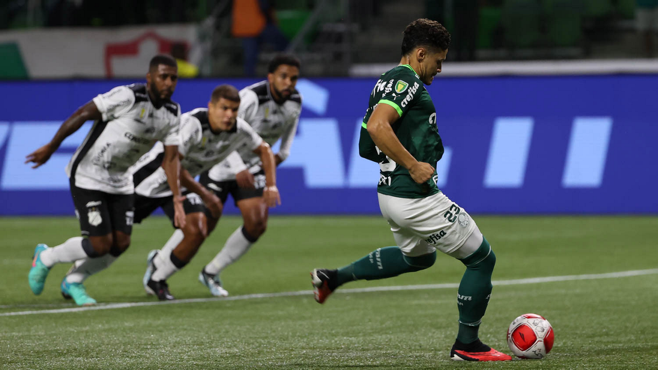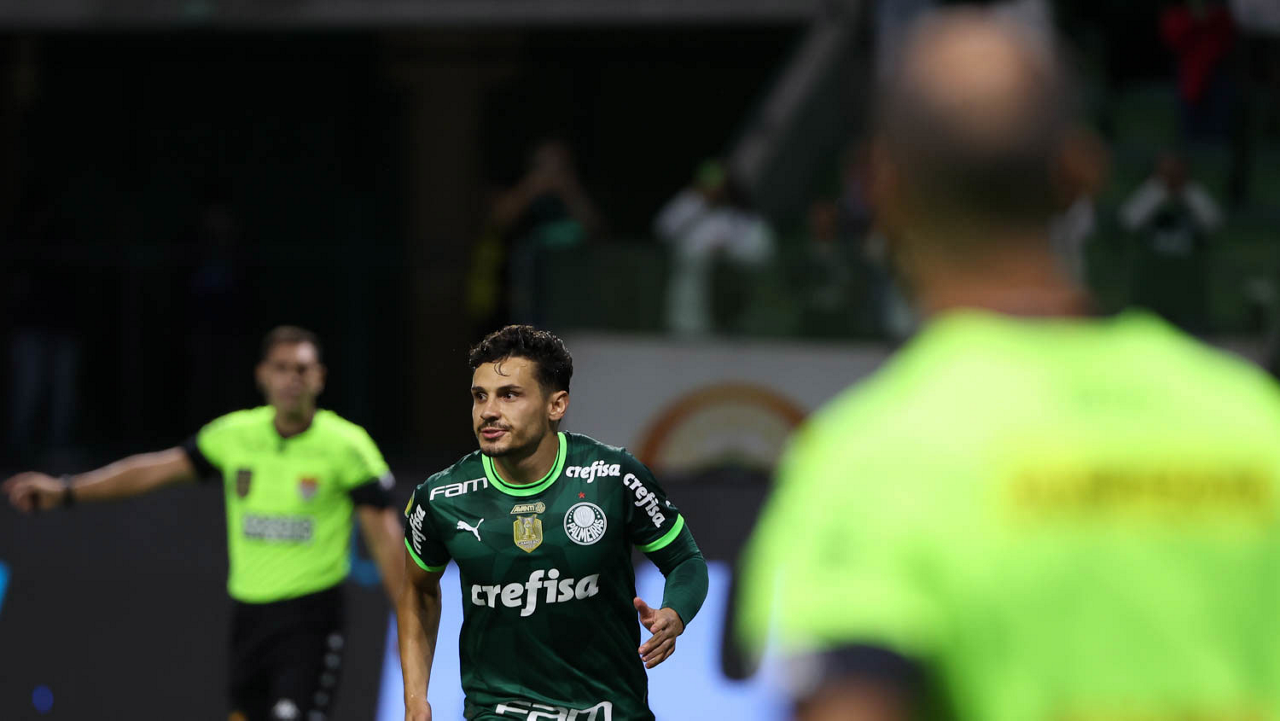 O técnico Abel Ferreira e o jogador Gustavo Gómez (D), da SE Palmeiras, em jogo contra a equipe da AA Internacional - Limeira, durante partida válida pela segunda rodada, do Campeonato Paulista, Série A1, na arena Allianz Parque. (Foto: Cesar Greco/Palmeiras/by Canon)