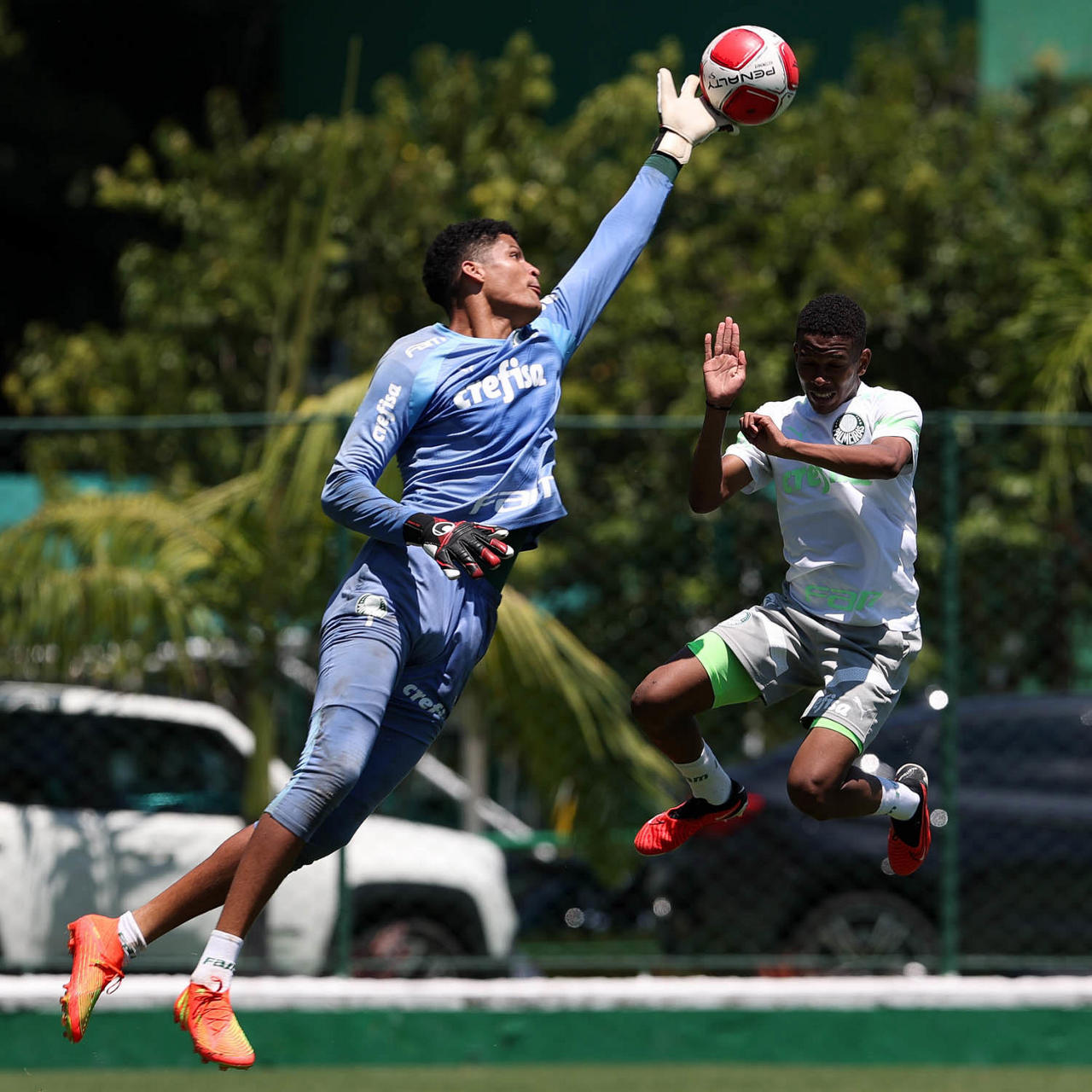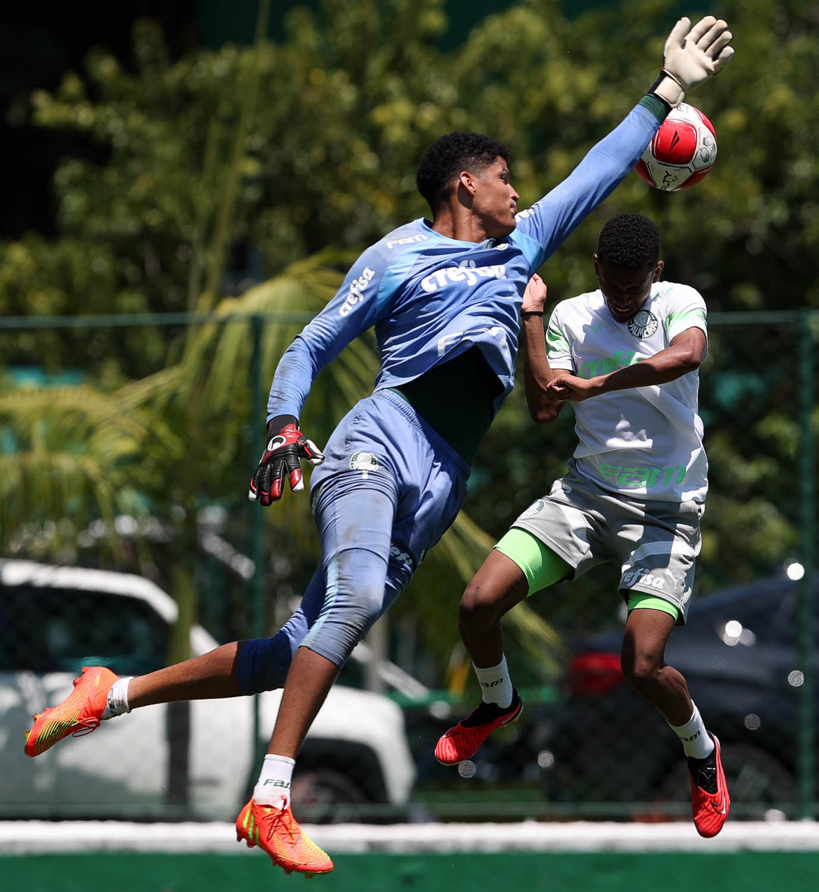 O goleiro Mateus e o jogador Estêvão (D), da SE Palmeiras, durante treinamento, na Academia de Futebol. (Foto: Cesar Greco/Palmeiras/by Canon)
